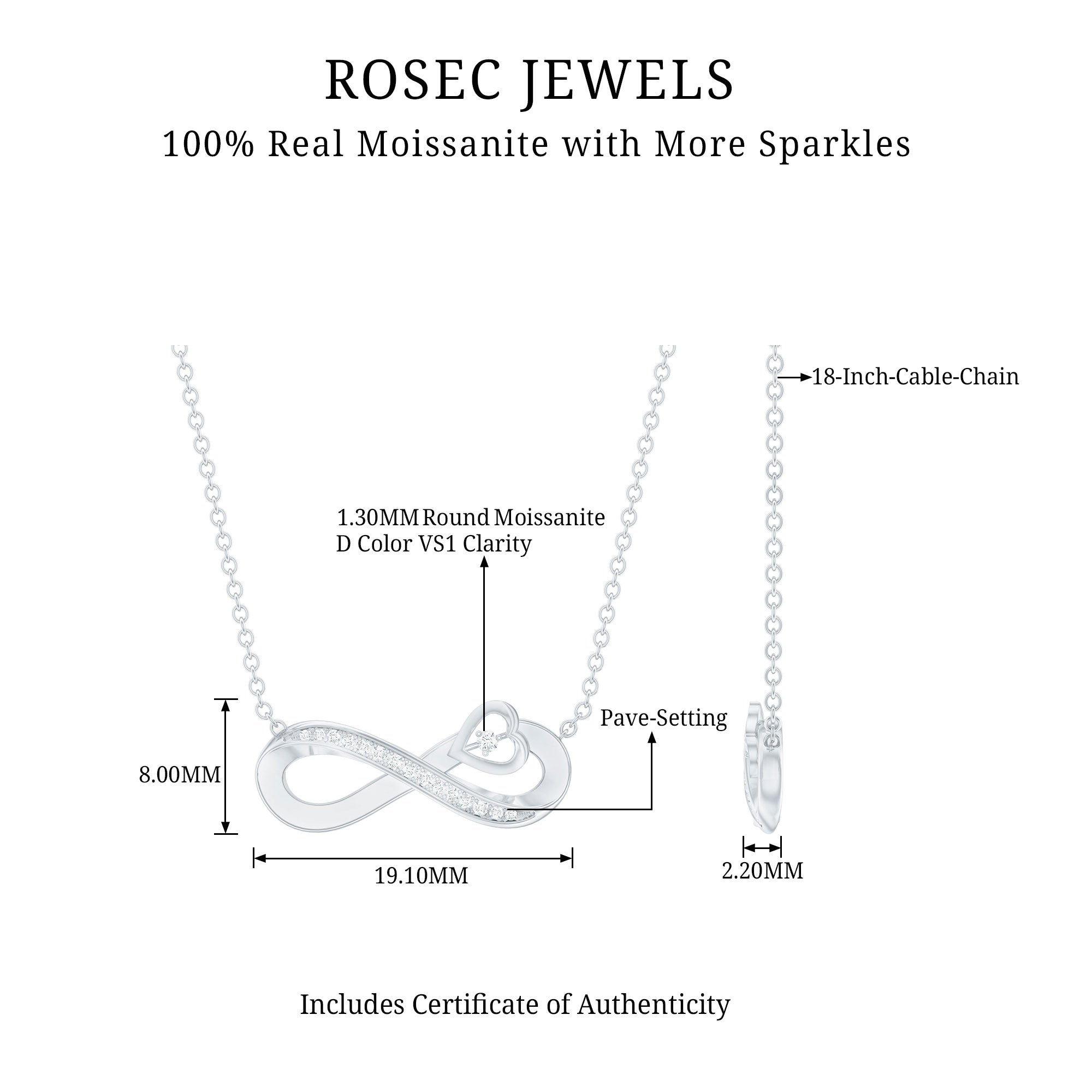 Rosec Jewels Cross Necklace is a beautifully crafted piece that blends love and eternity into one elegant design. It features a horizontal infinity sign with a small open heart shape adorned with sparkling round cut moissanite stones of D-VS1 Quality. Hanging from a cable chain, this Heart Infinity Necklace is a ready-to-wear fine necklace. Show your never-ending love to your special one in the form of this Forever Pendant, it expresses every emotion when words are not enough. To make your special moment even better, this moissanite necklace comes in a premium velvet pouch, ensuring a luxurious presentation for your gift.