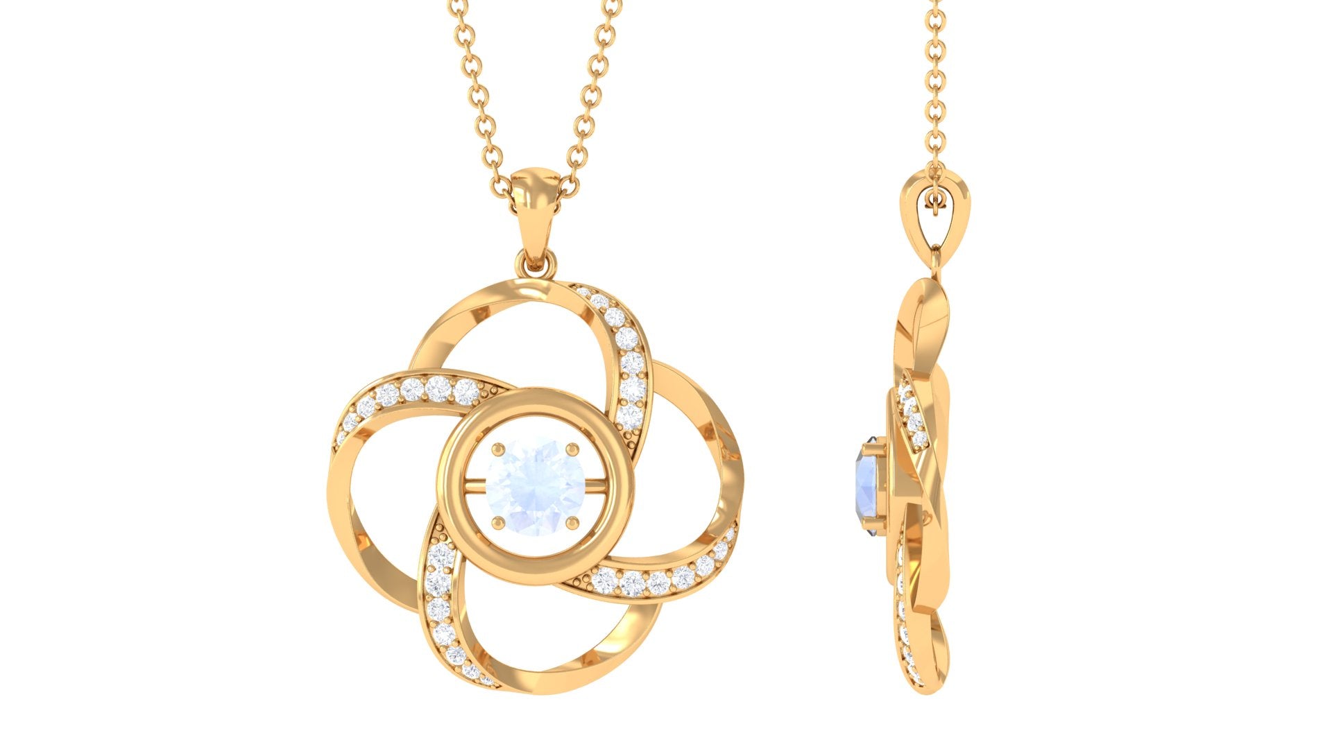 The center round moonstone is accompanied by petal-like motifs, that appear like a fully grown blossom when seen as a whole in this solitaire pendant. The metal is dotted with round Diamond, which enhances the beauty of this floral design. Don it as a stand-alone piece or stack it with other jewels for a look that is second to none.