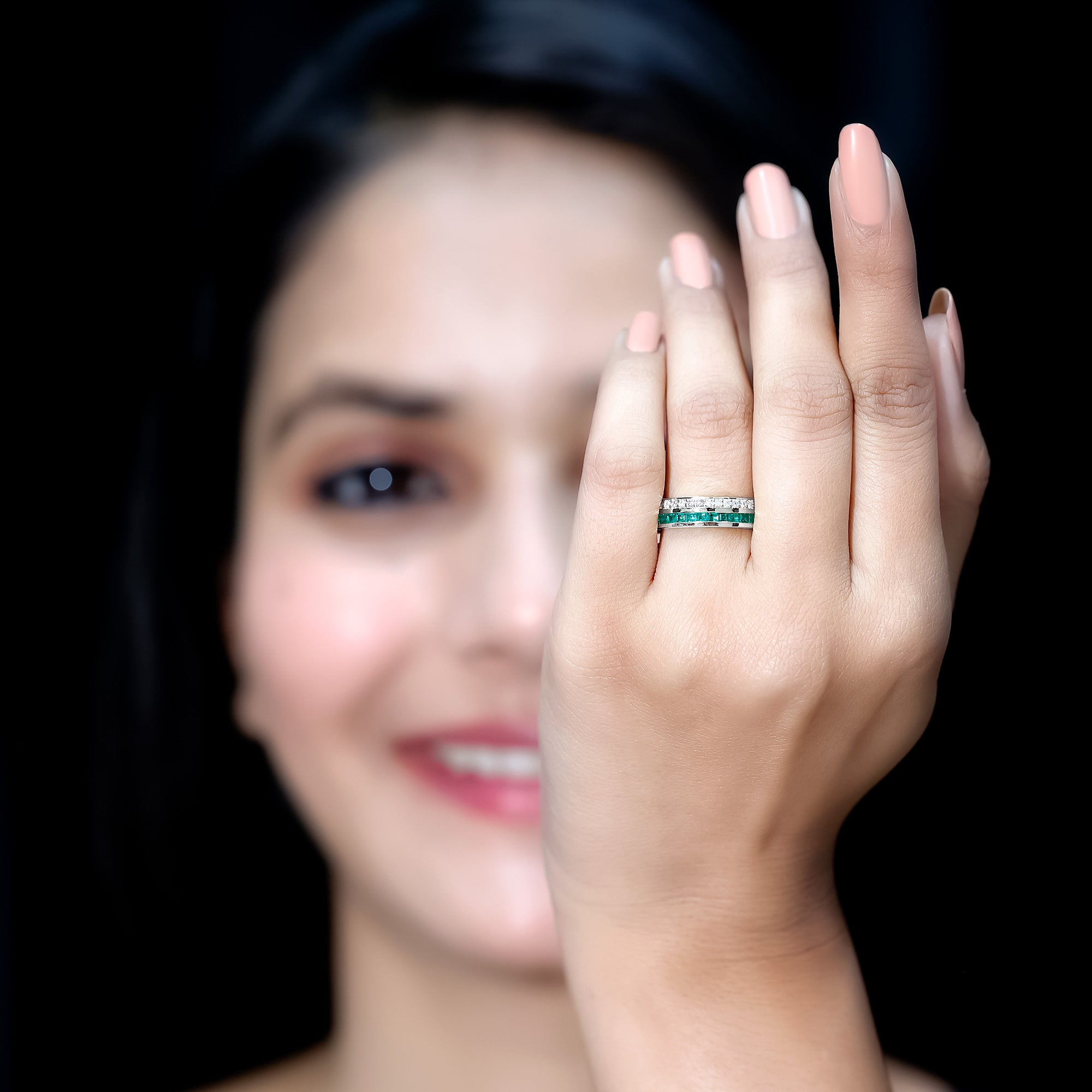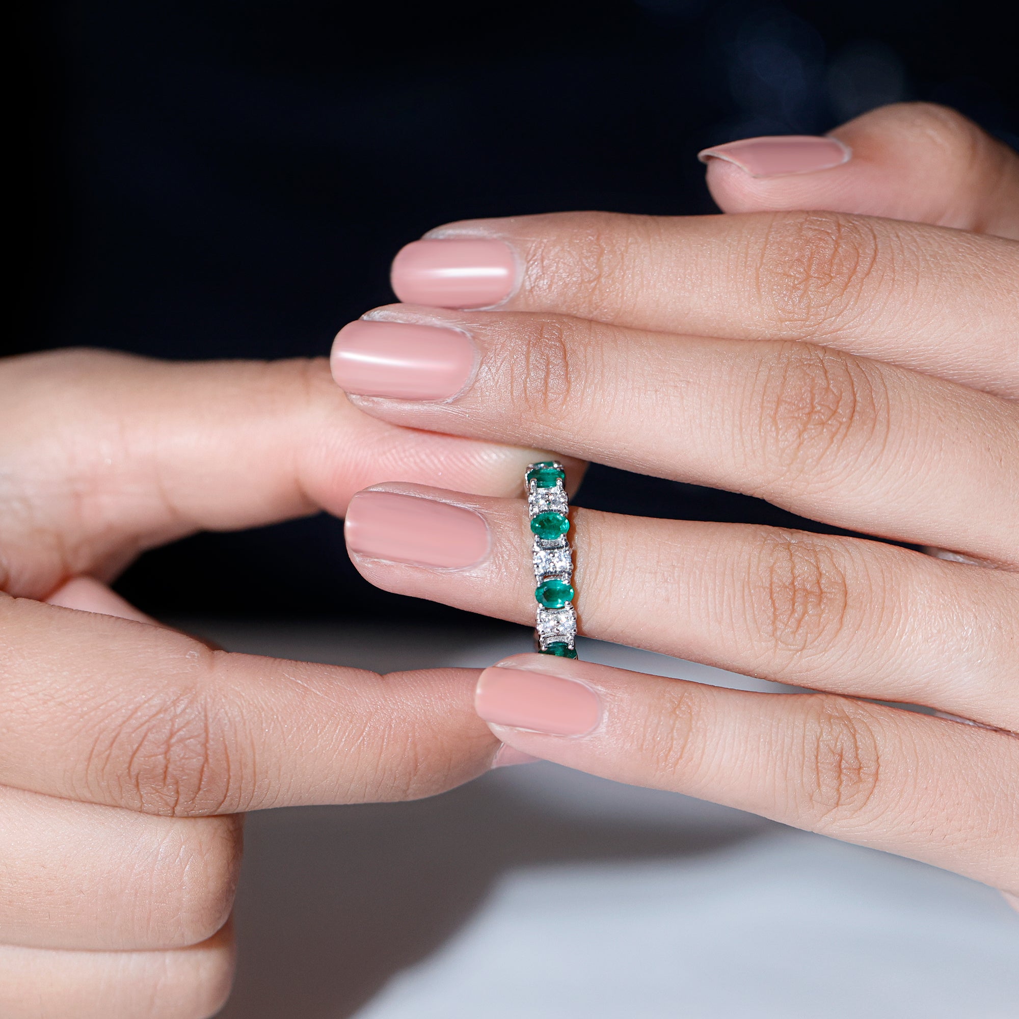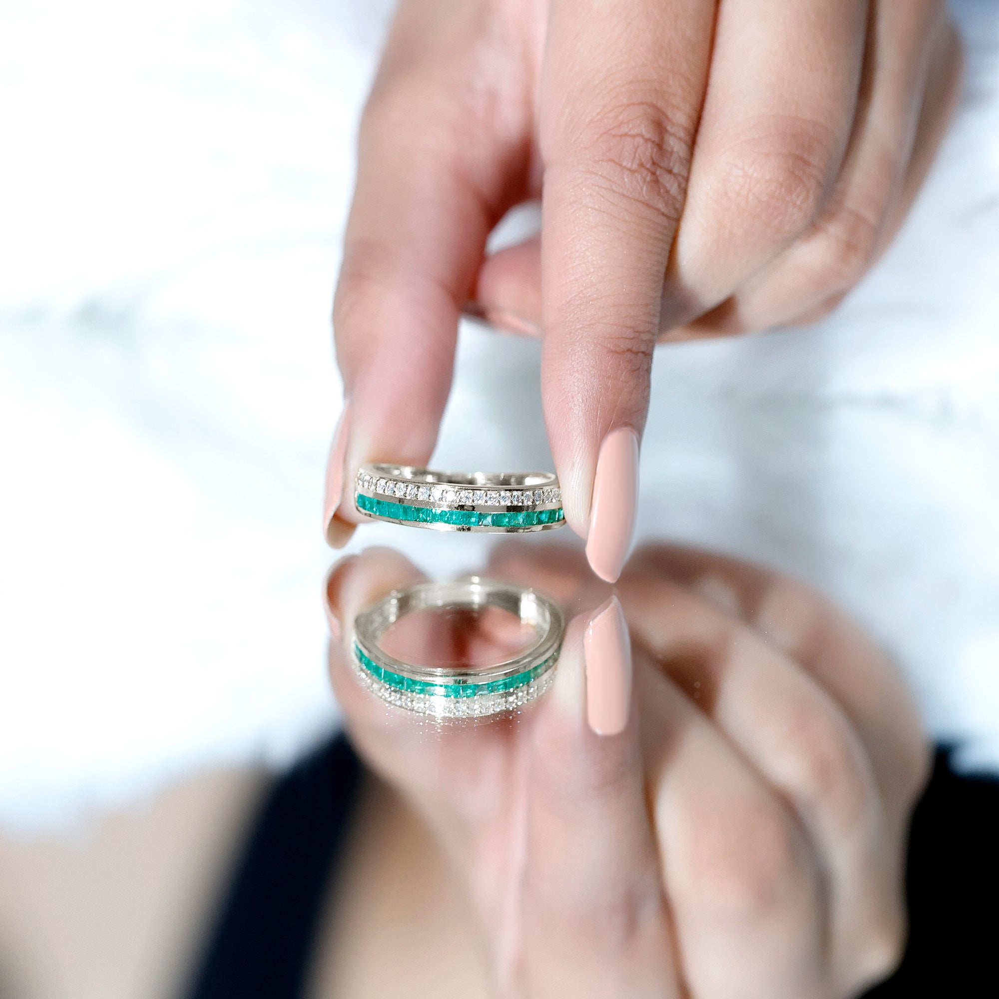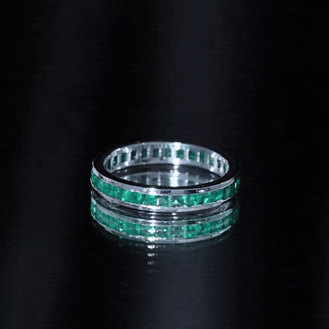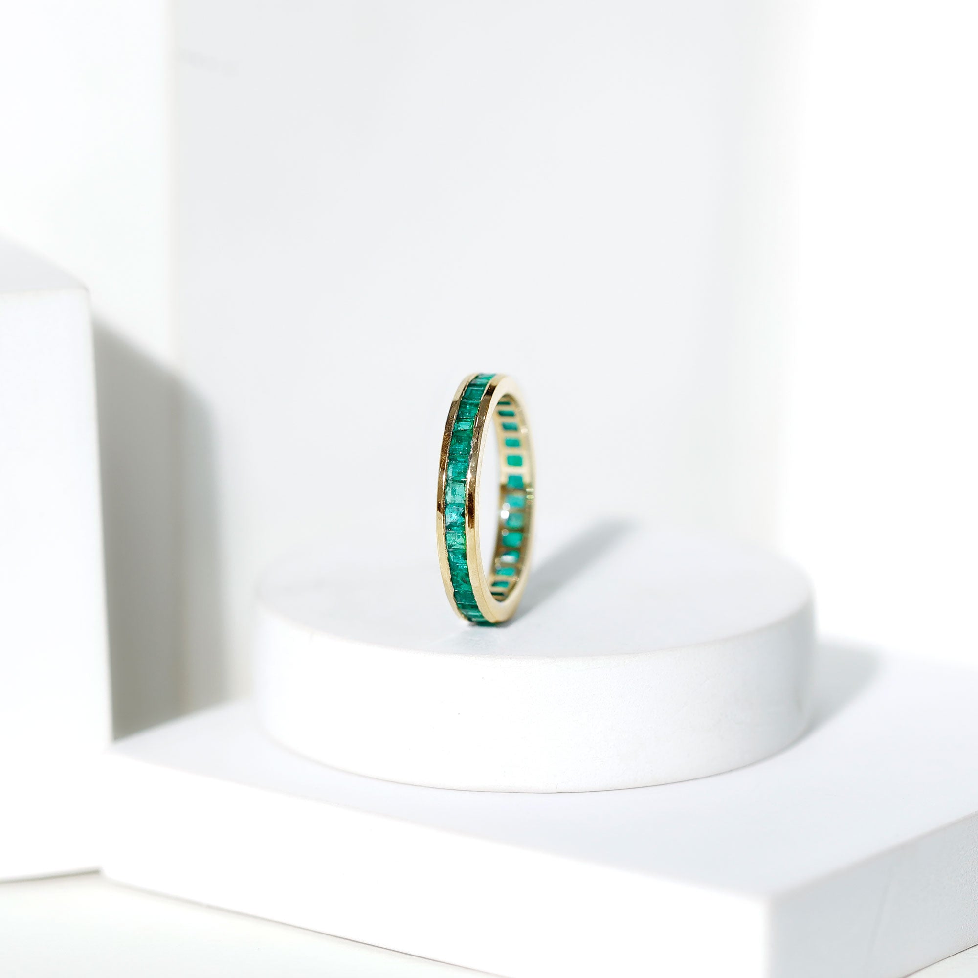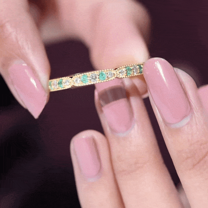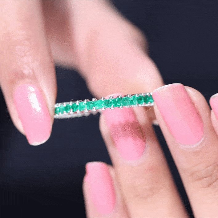 Eternity Bands features a continuous line of lush green emeralds that goes all around the band. It’s a luxurious choice that sparkles from every angle.