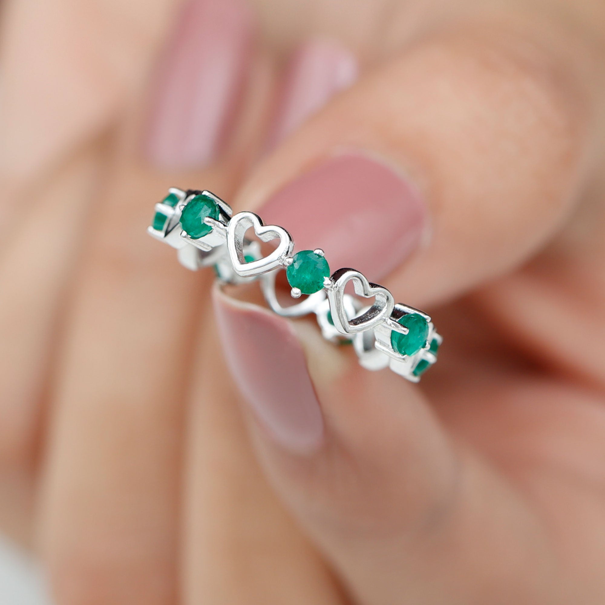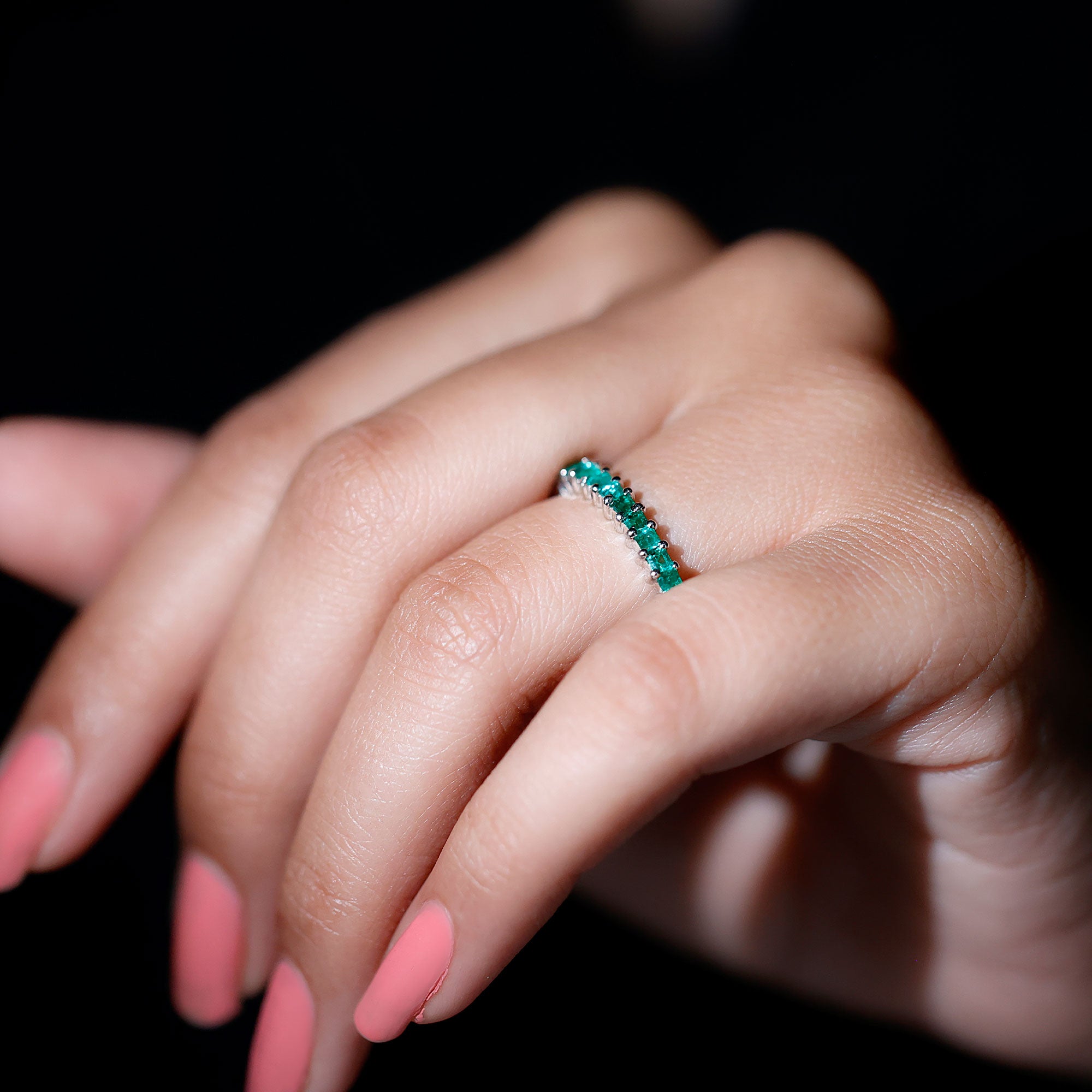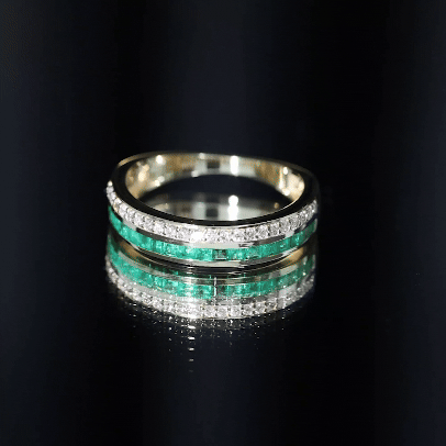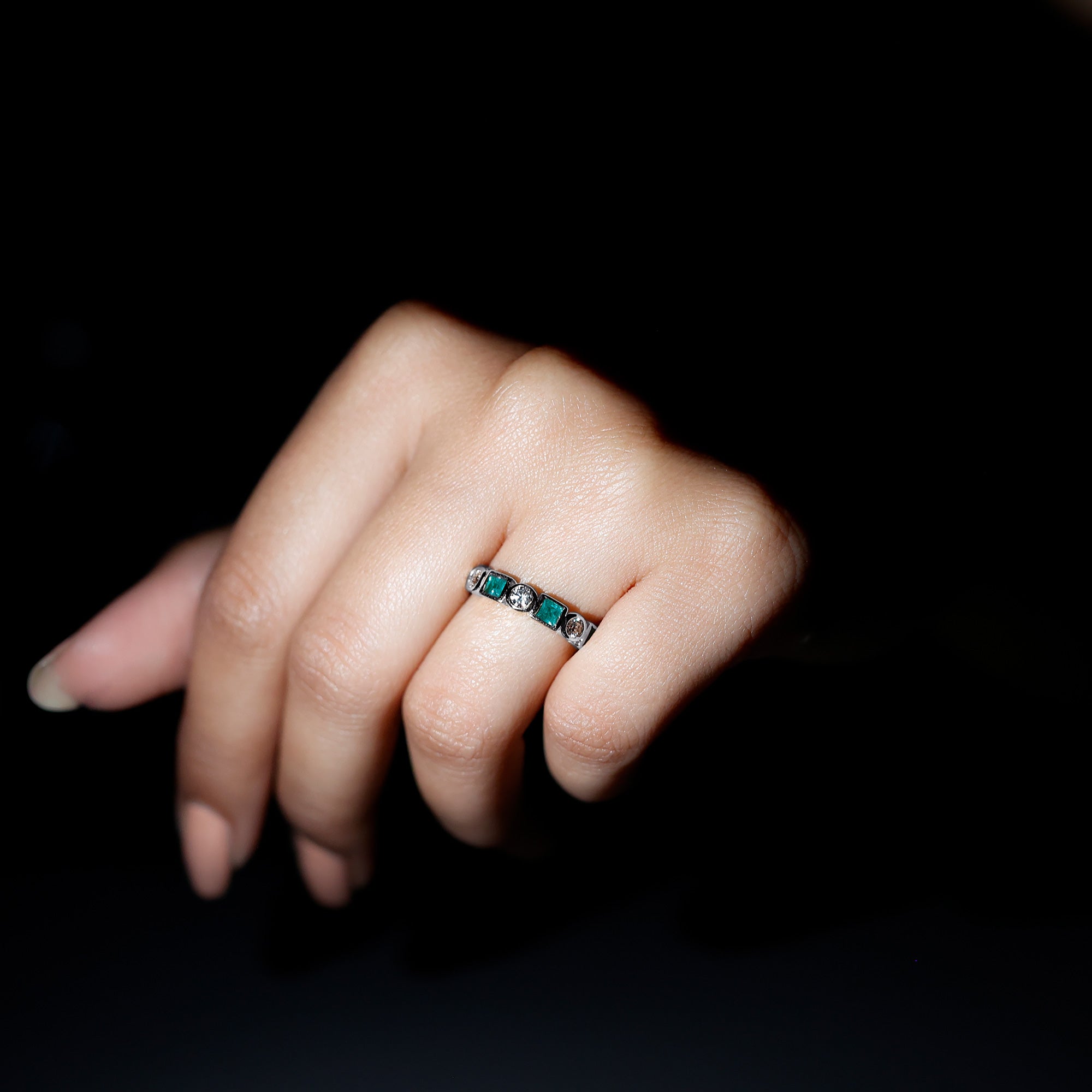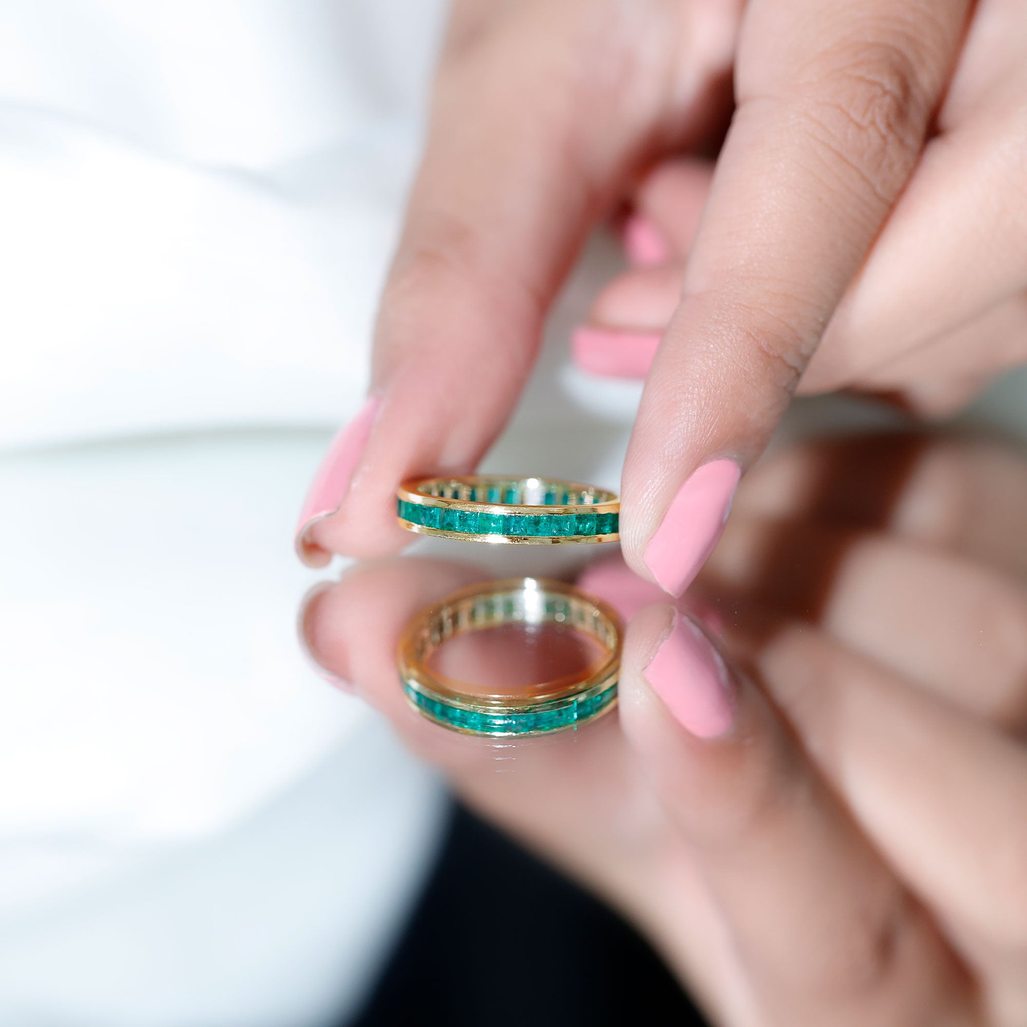 Eternity Bands features a continuous line of lush green emeralds that goes all around the band. It’s a luxurious choice that sparkles from every angle.