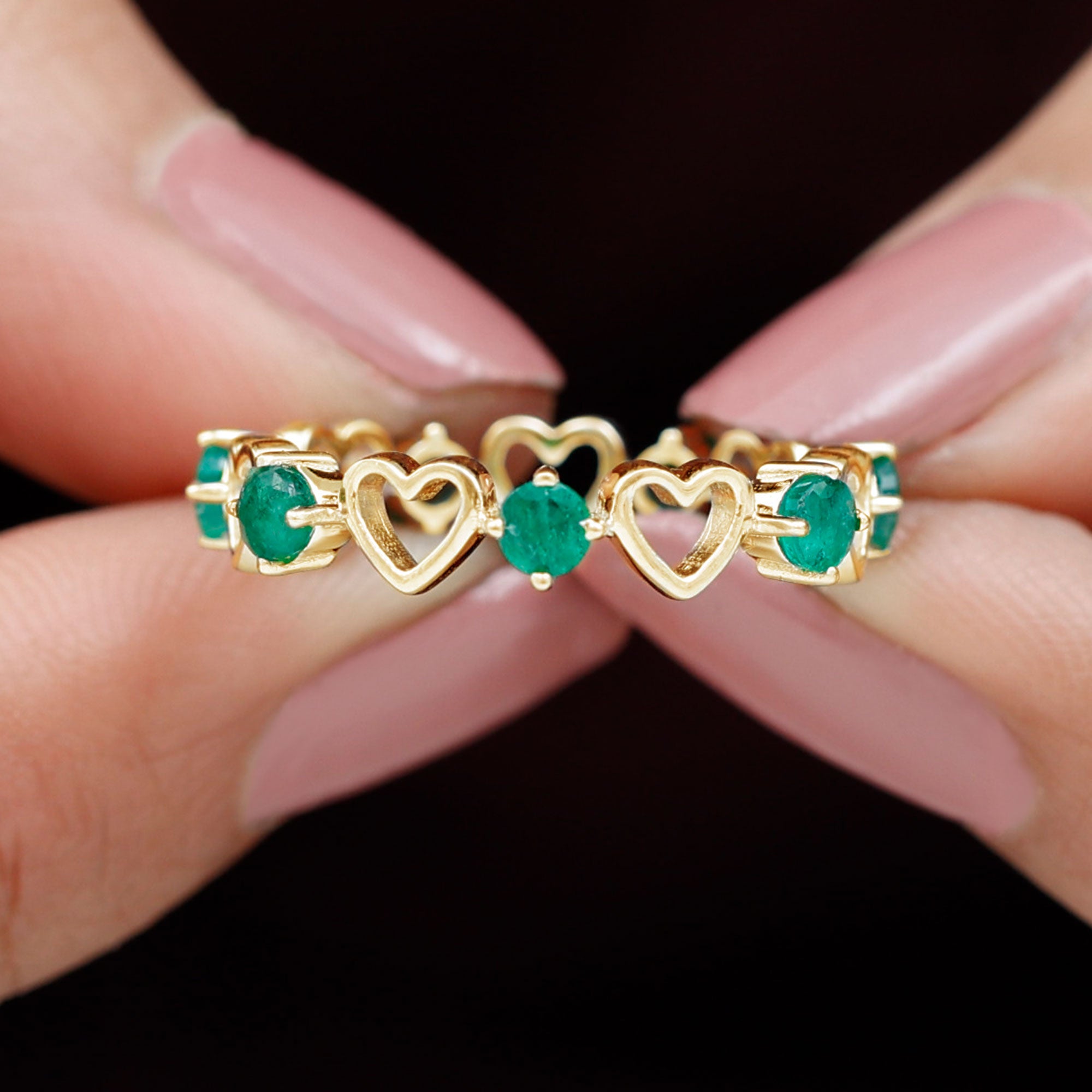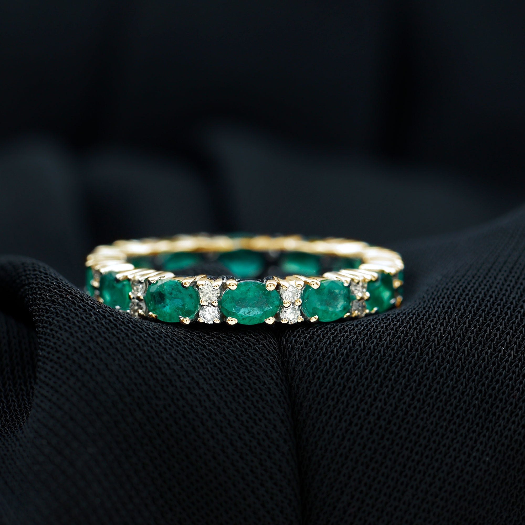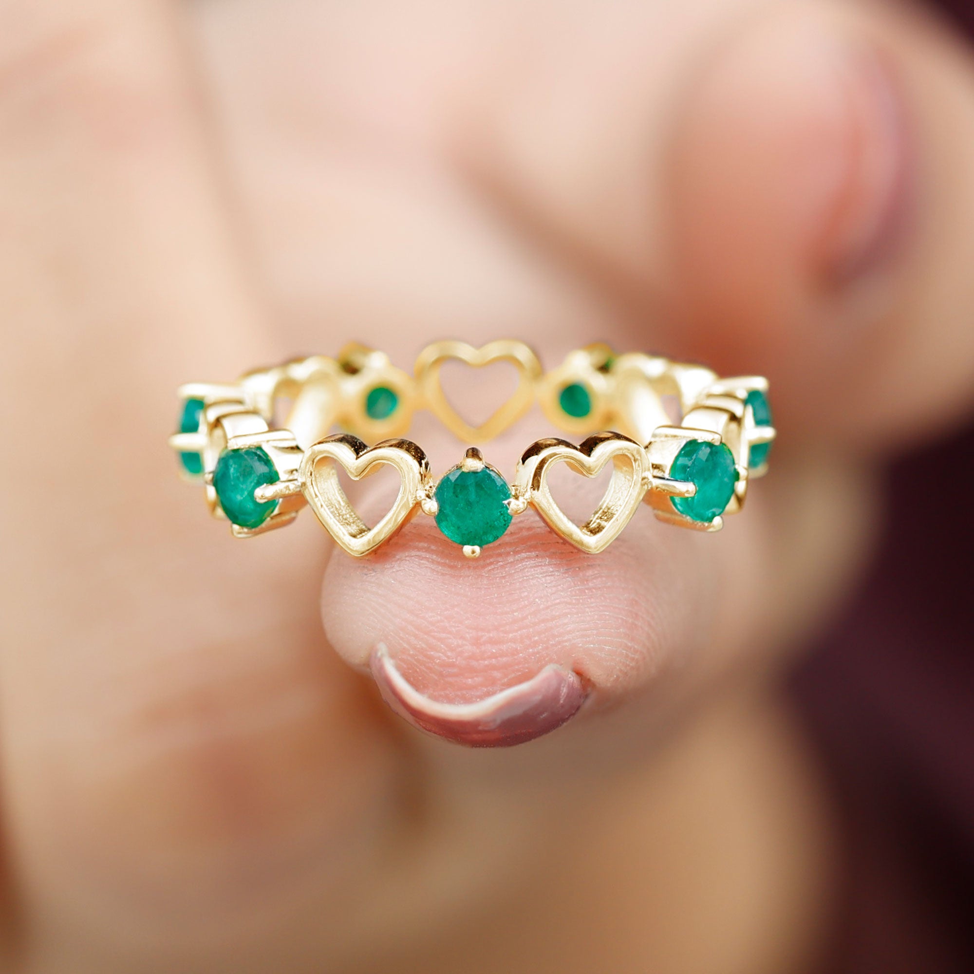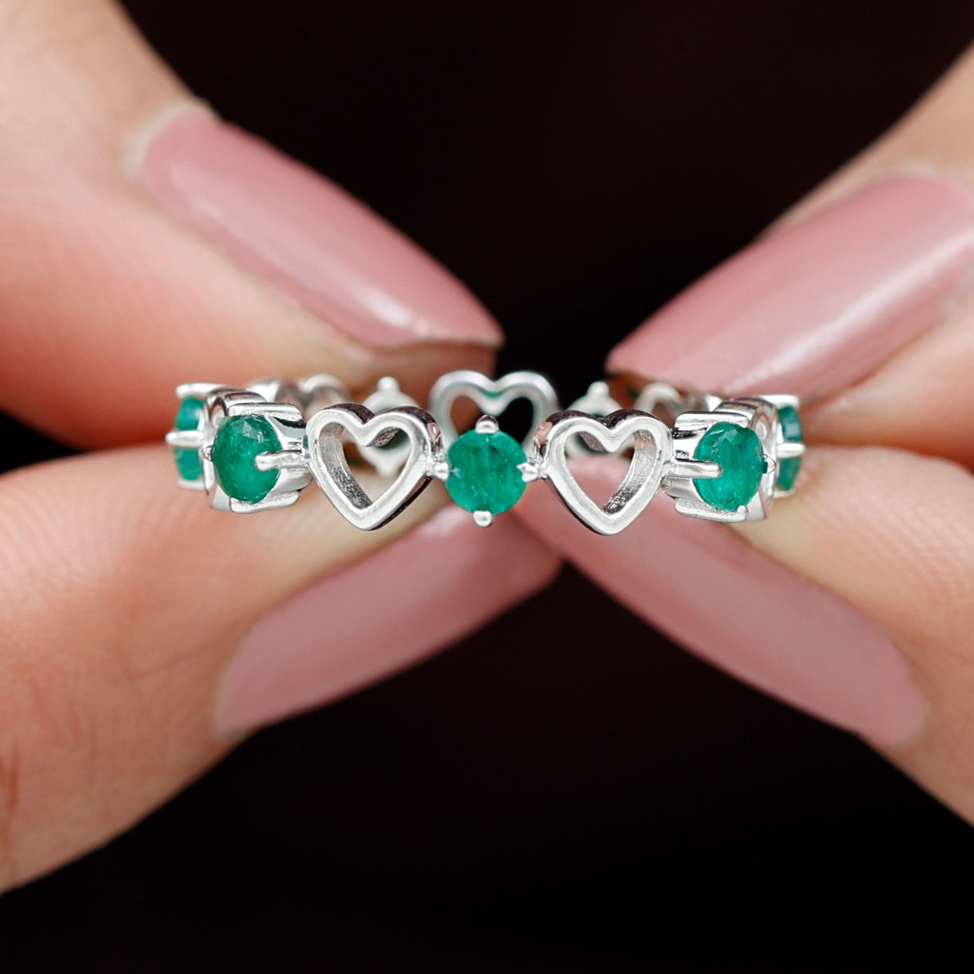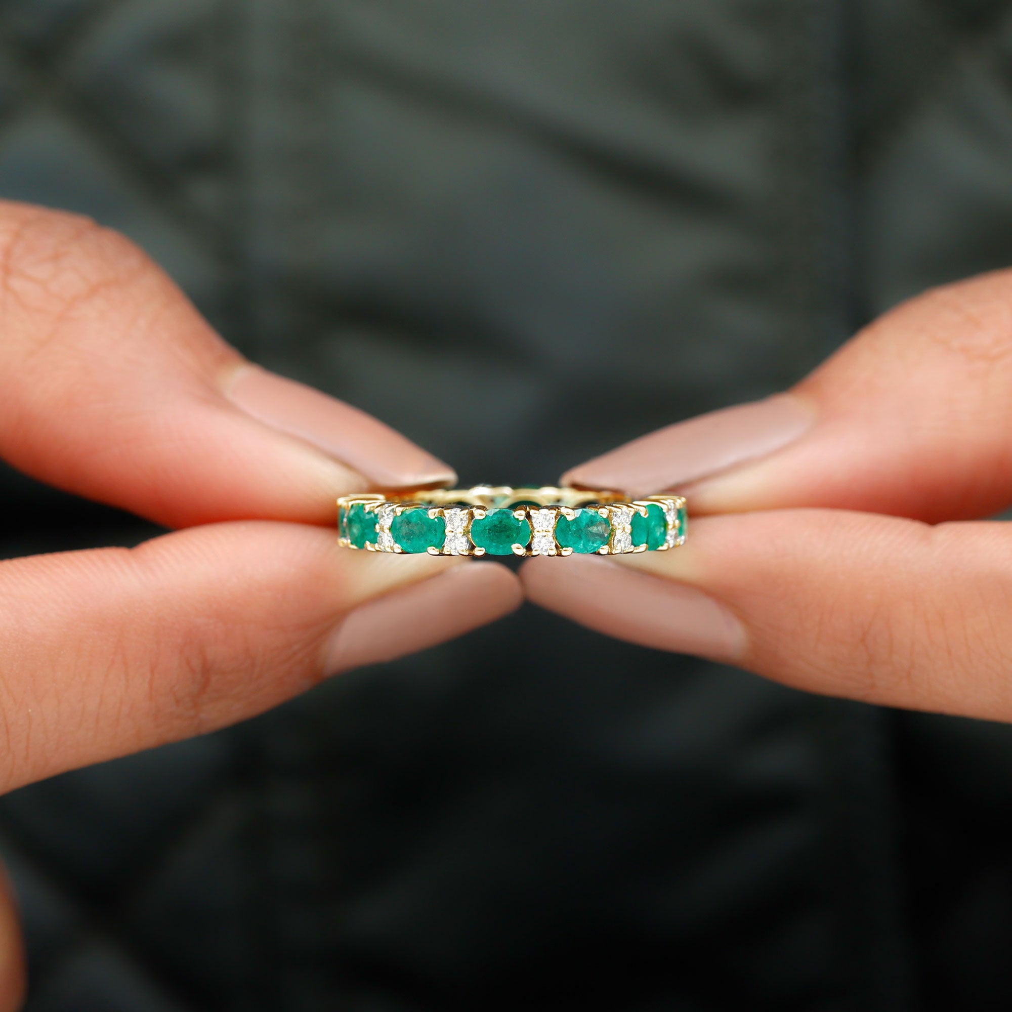 Eternity Bands features a continuous line of lush green emeralds that goes all around the band. It’s a luxurious choice that sparkles from every angle.