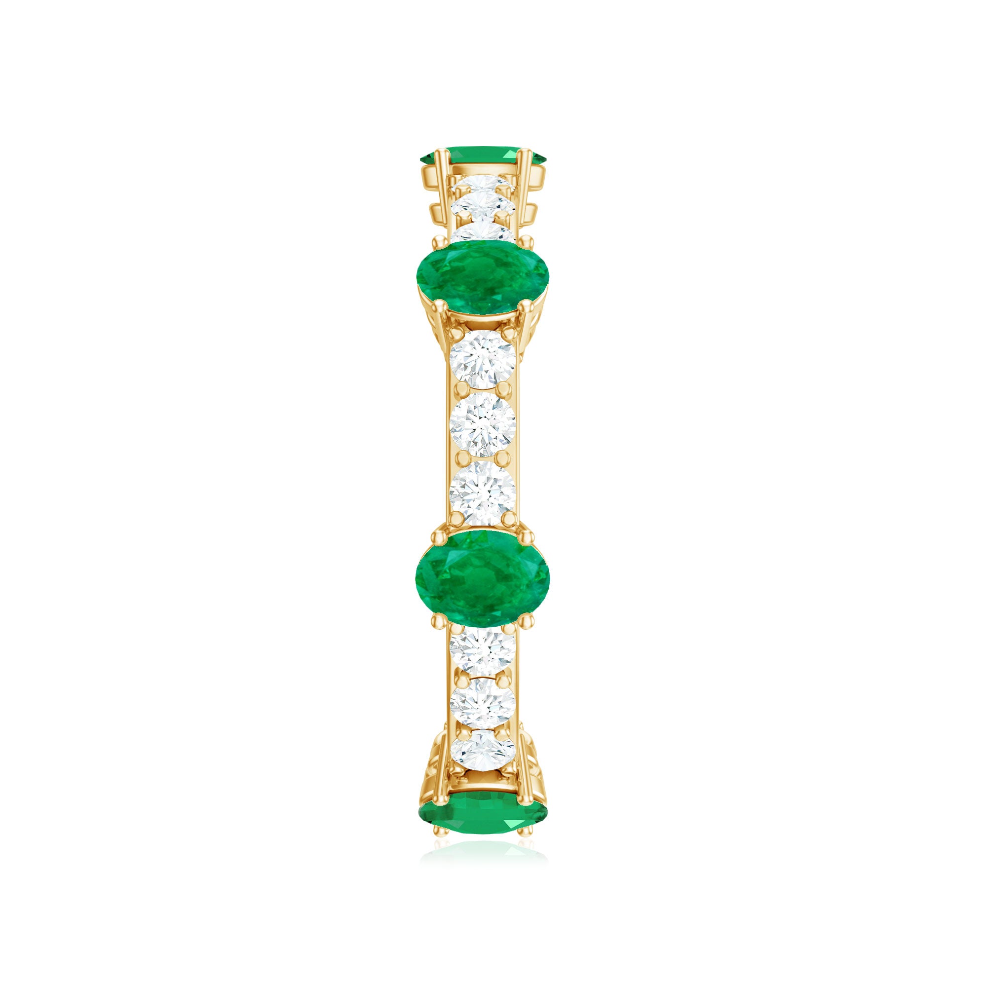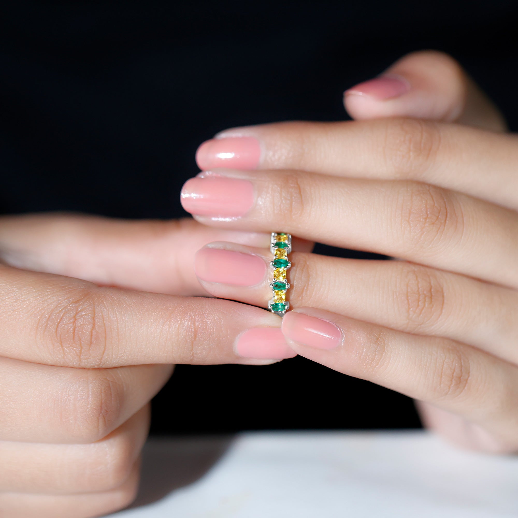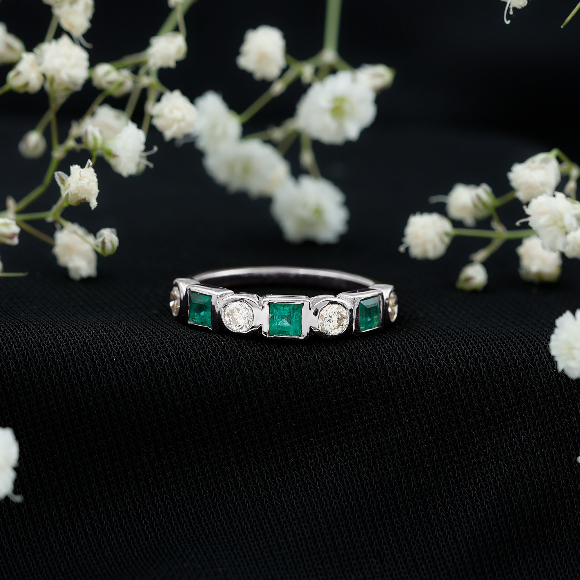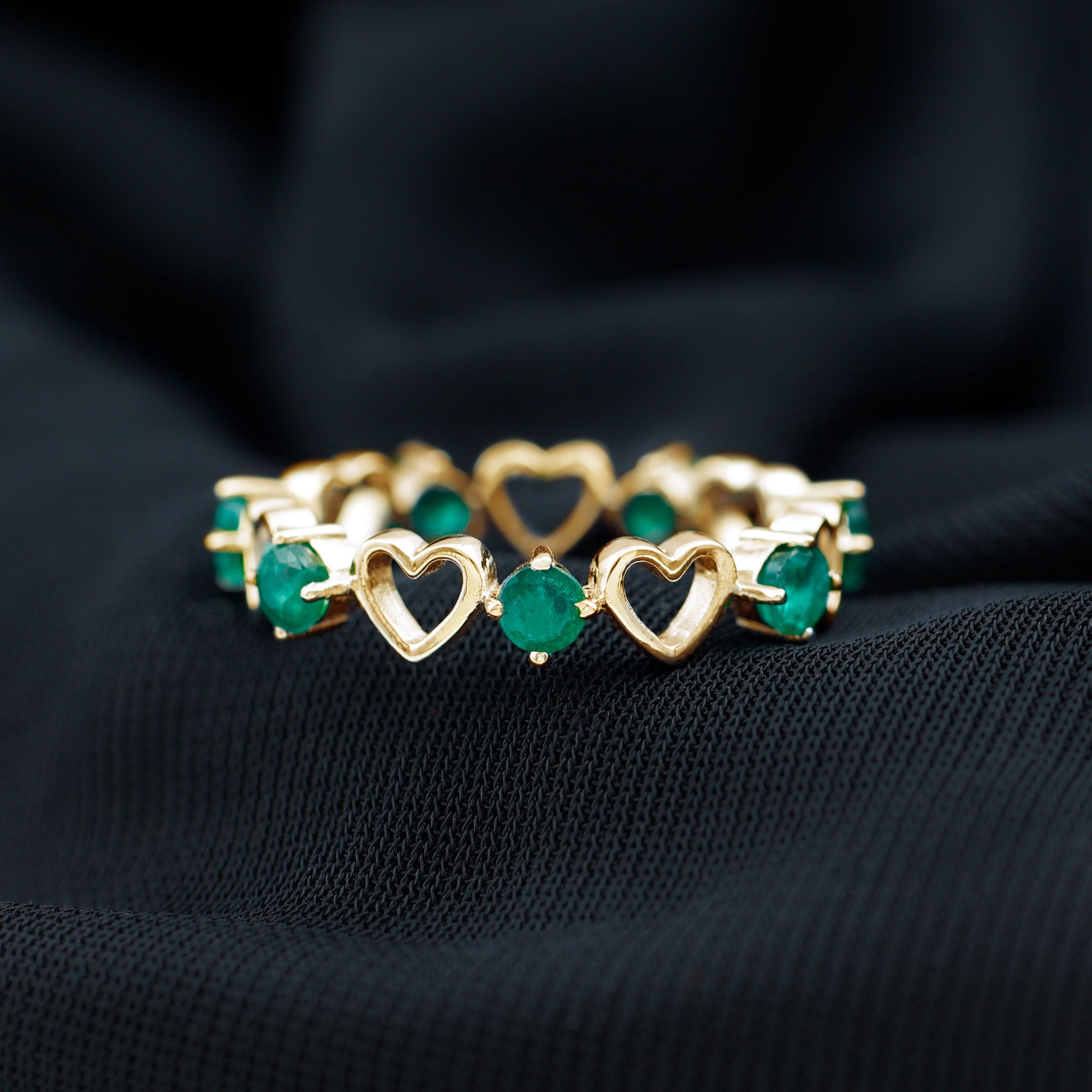 Eternity Bands features a continuous line of lush green emeralds that goes all around the band. It’s a luxurious choice that sparkles from every angle.