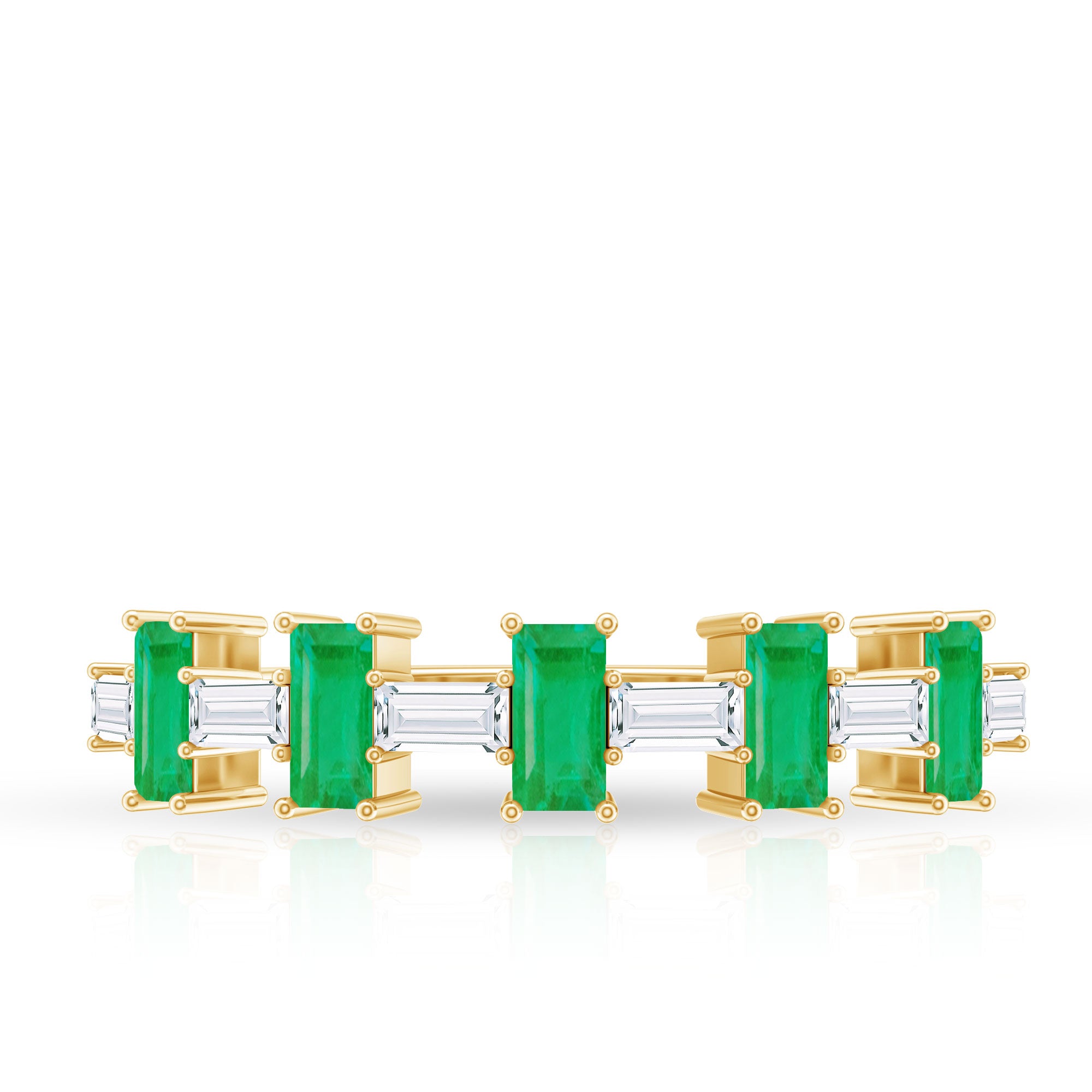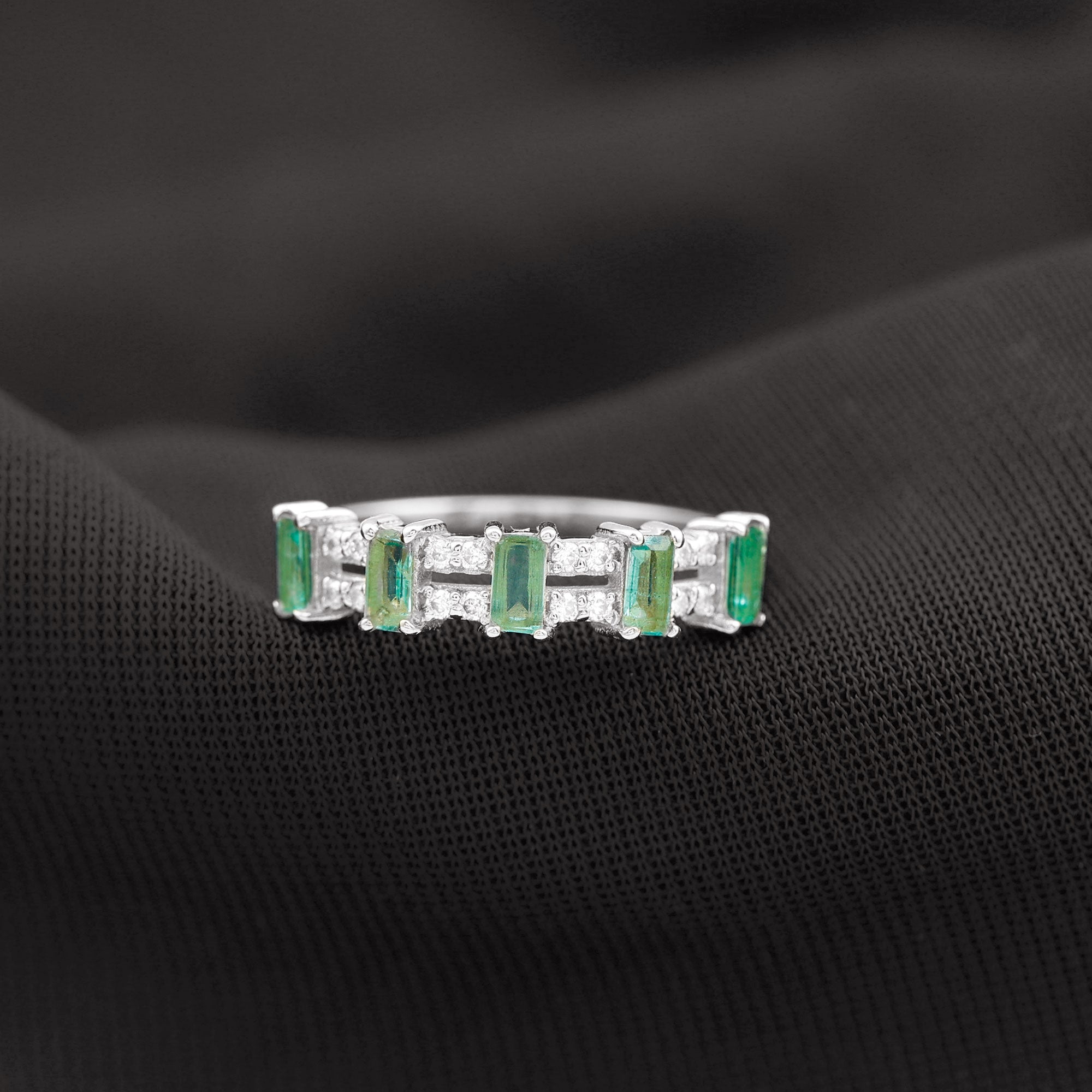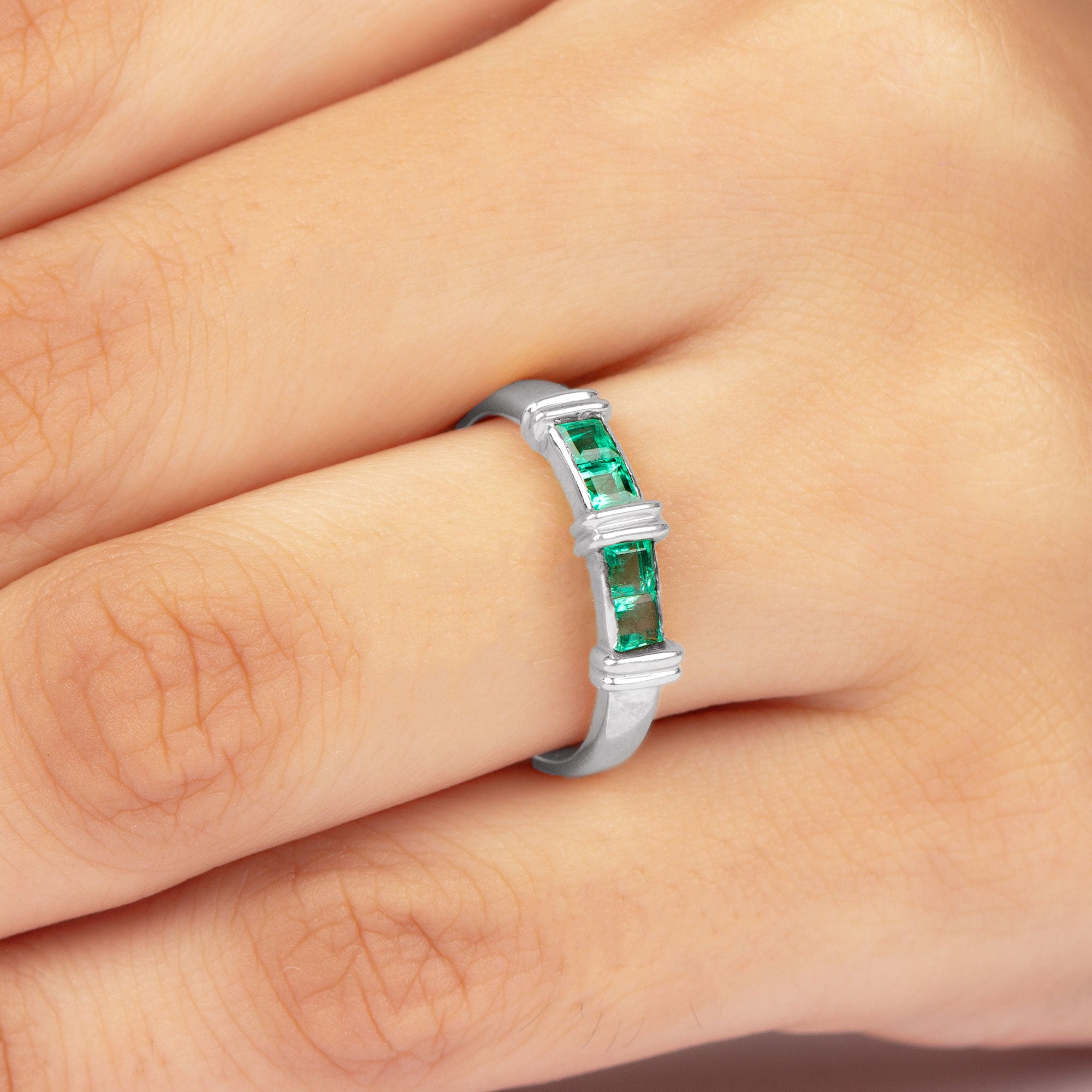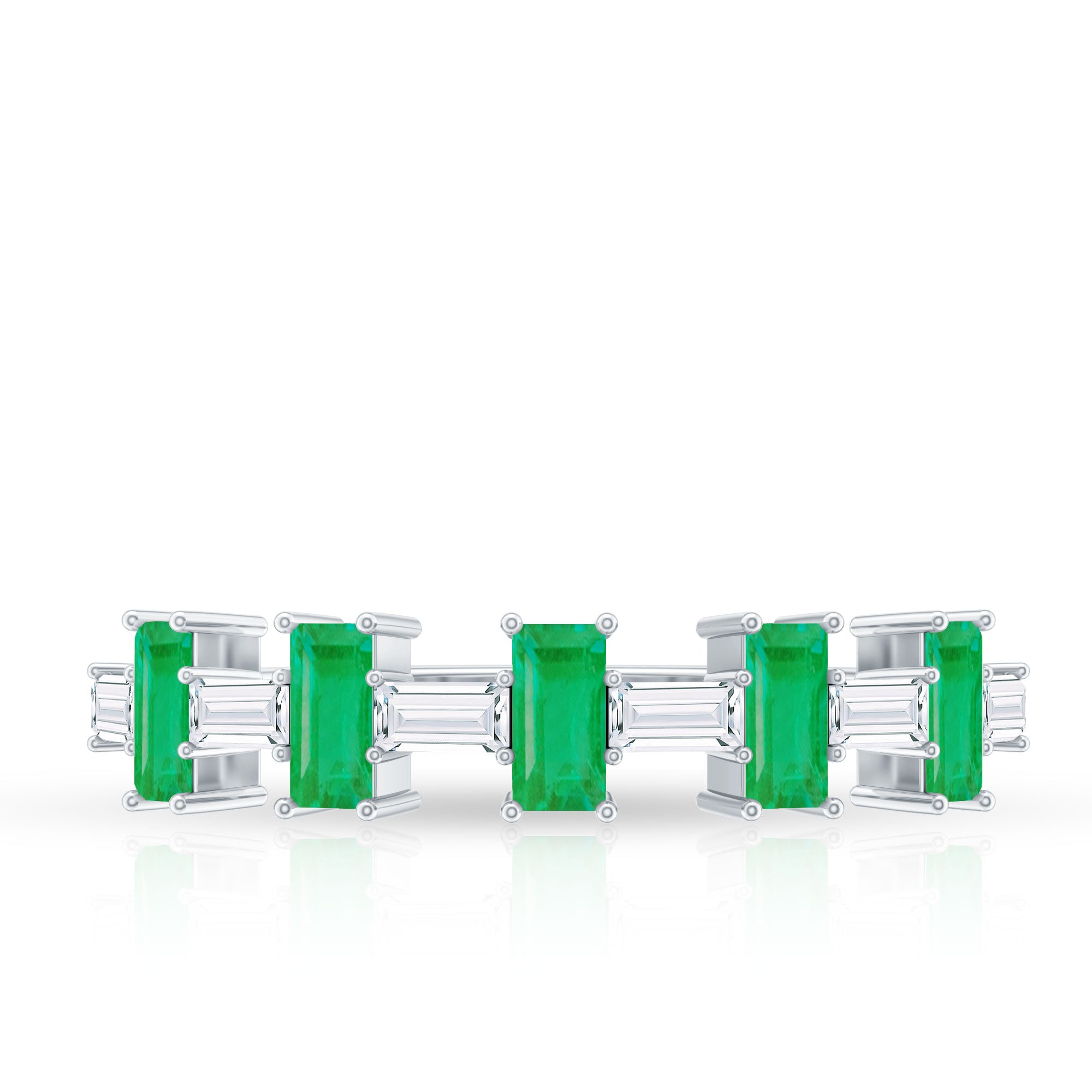 The east west emerald bands are a popular choice, with modern and geometrical appearance. East-west style ring is a great alternative to the traditional wedding ring. The horizontally placed gem is studded across the band, creating a more elongated and modern look.