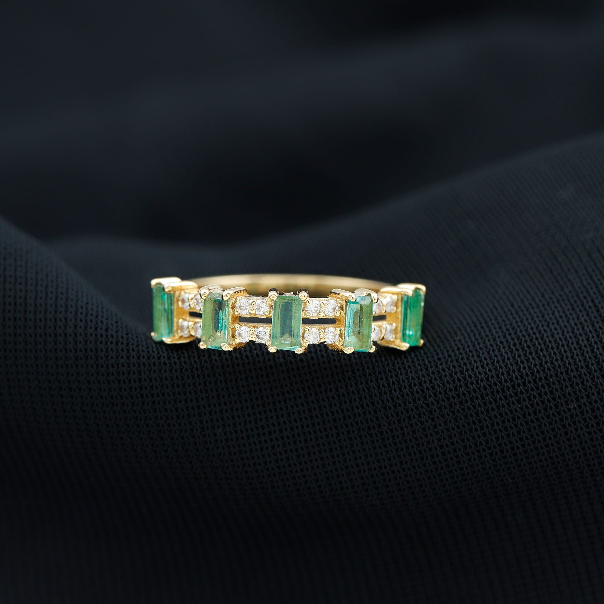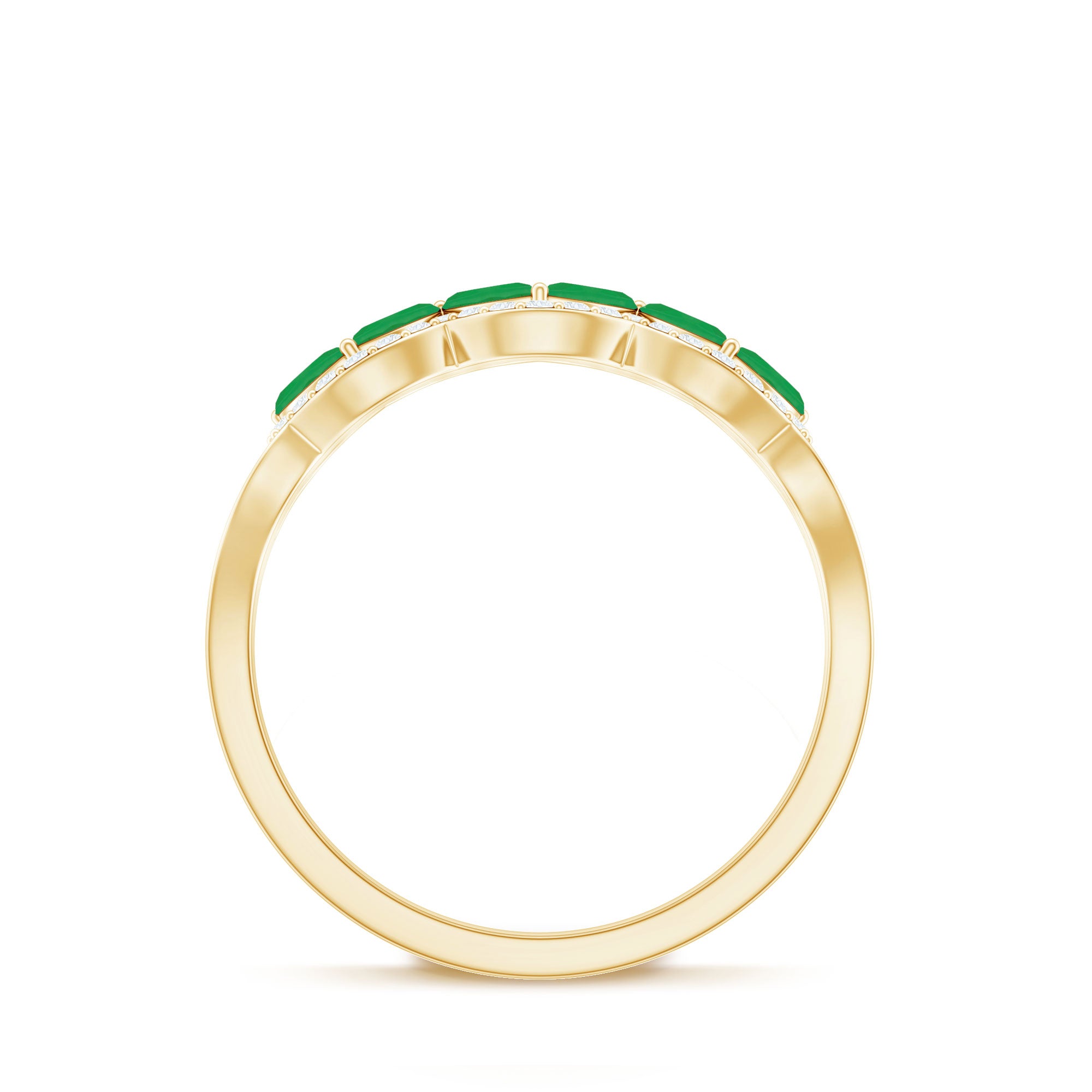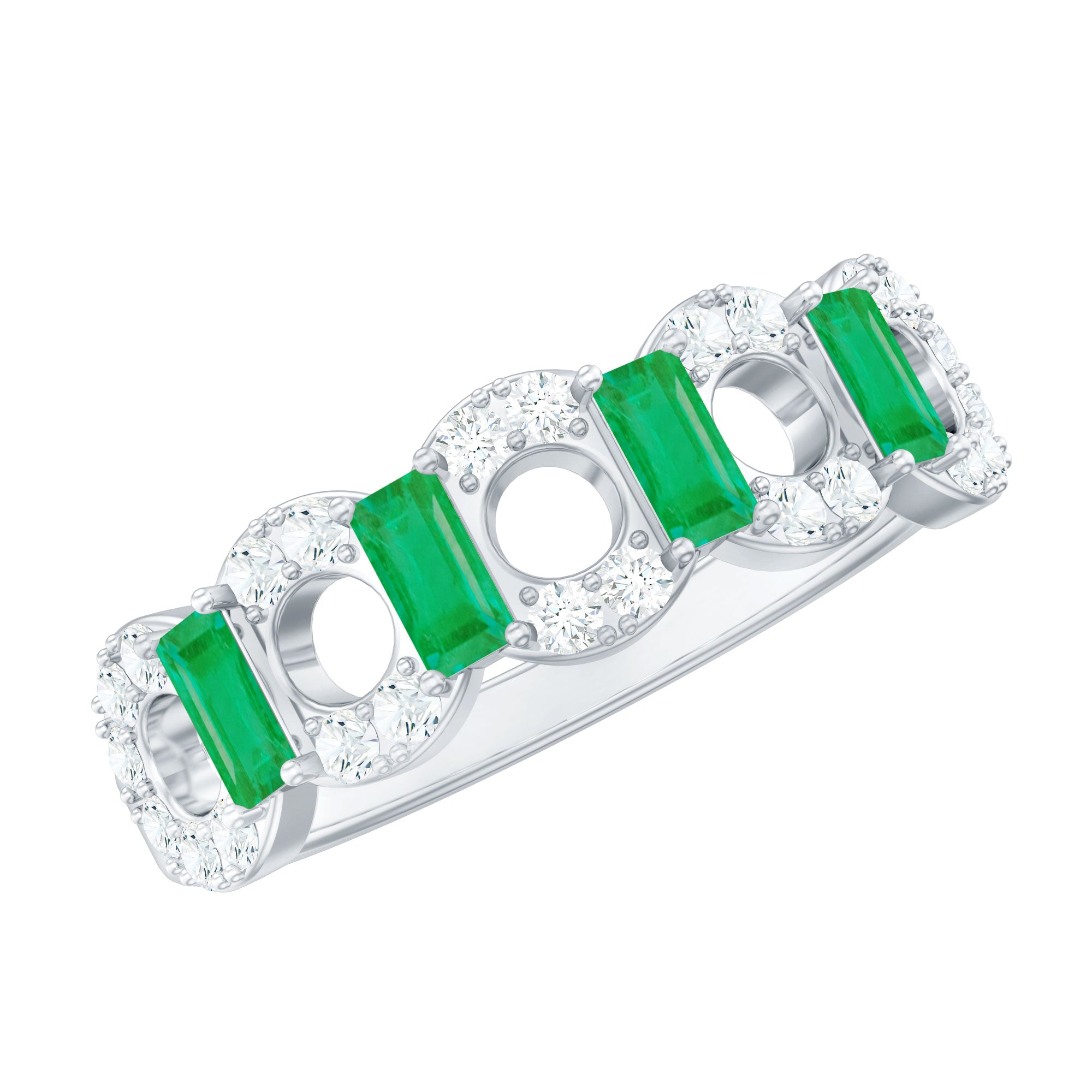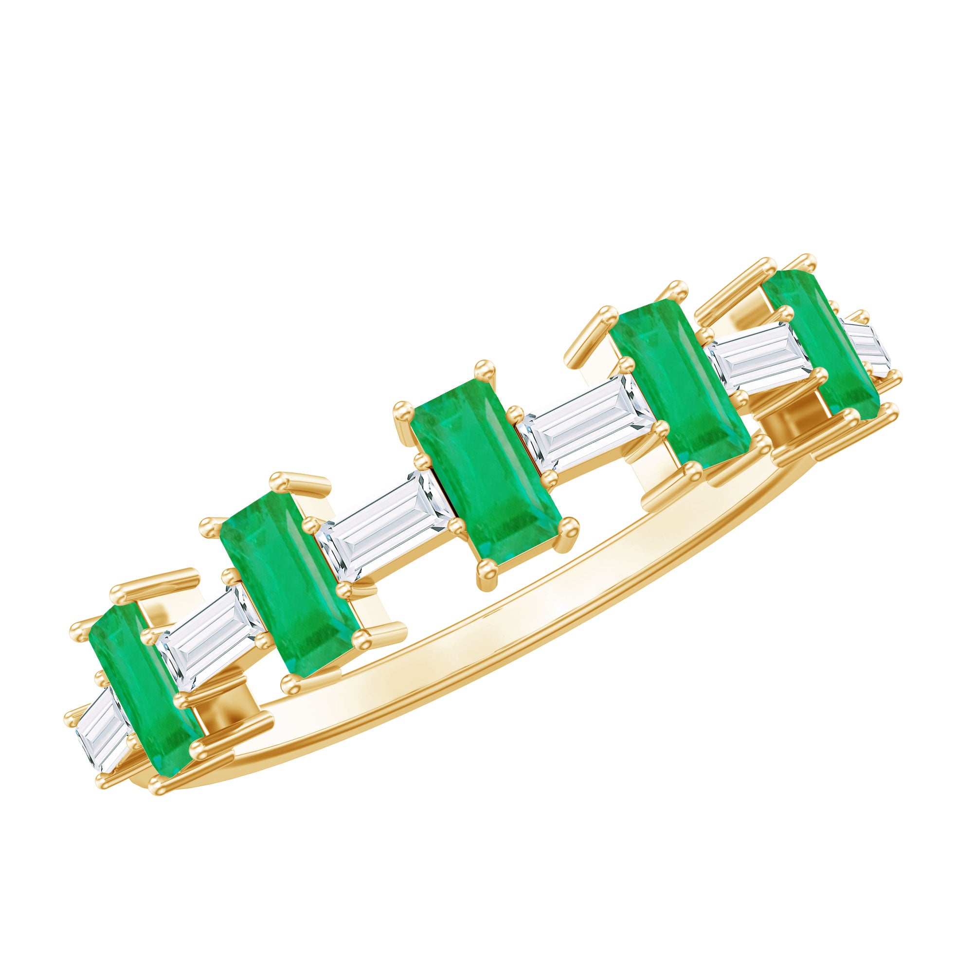 The east west emerald bands are a popular choice, with modern and geometrical appearance. East-west style ring is a great alternative to the traditional wedding ring. The horizontally placed gem is studded across the band, creating a more elongated and modern look.