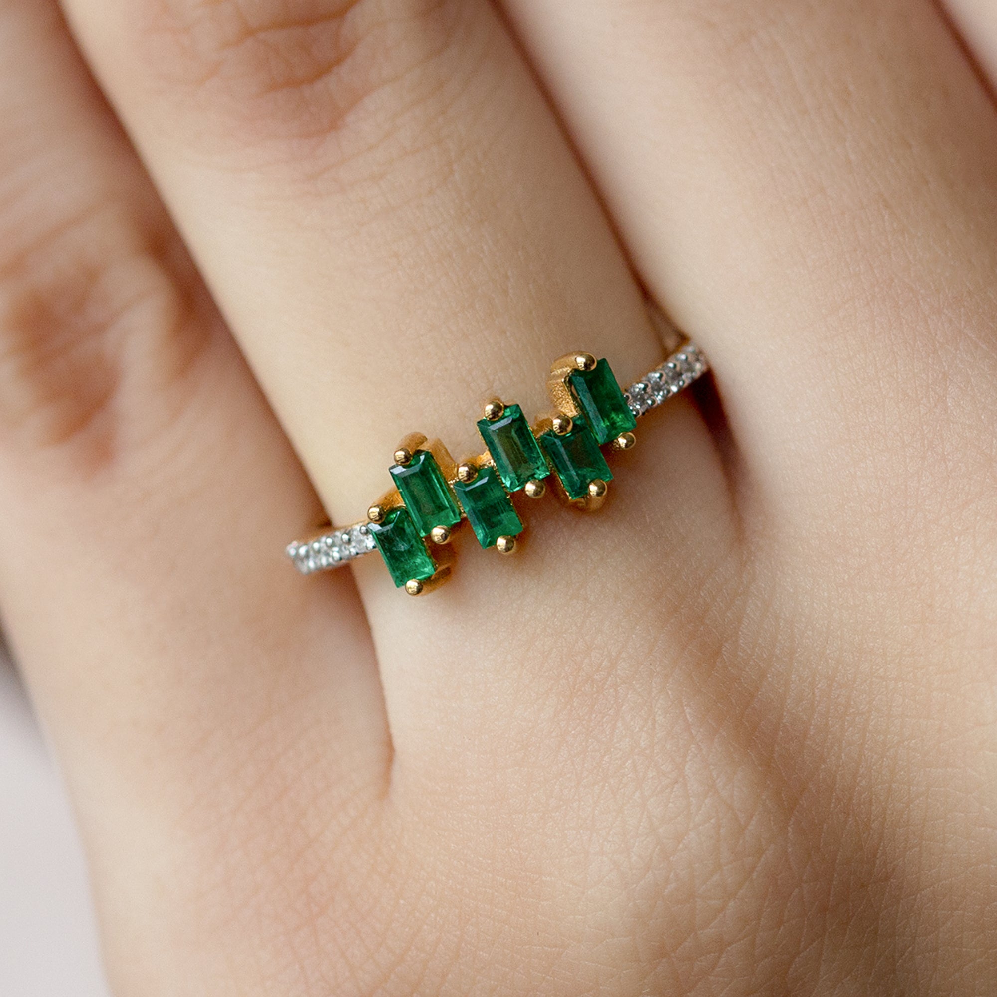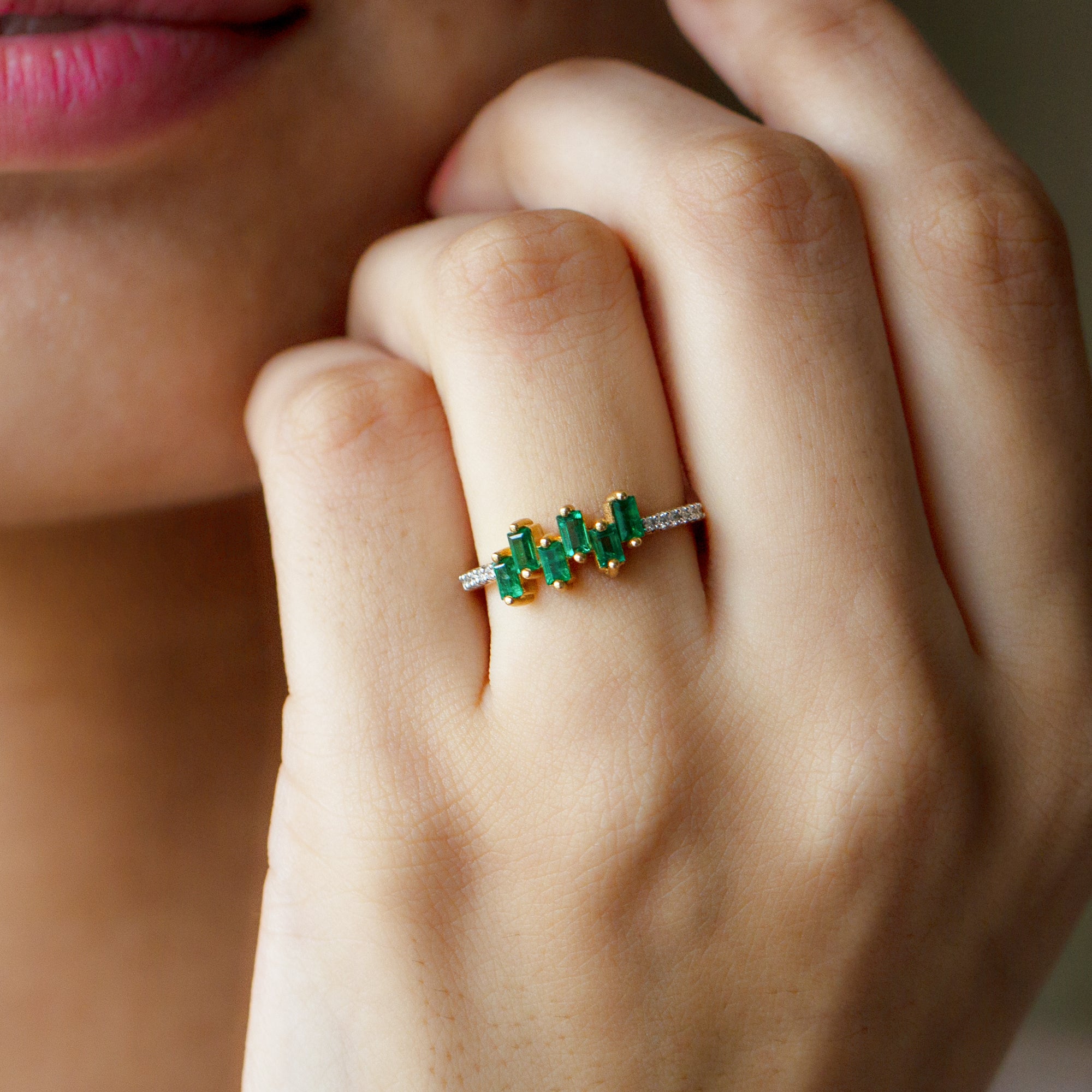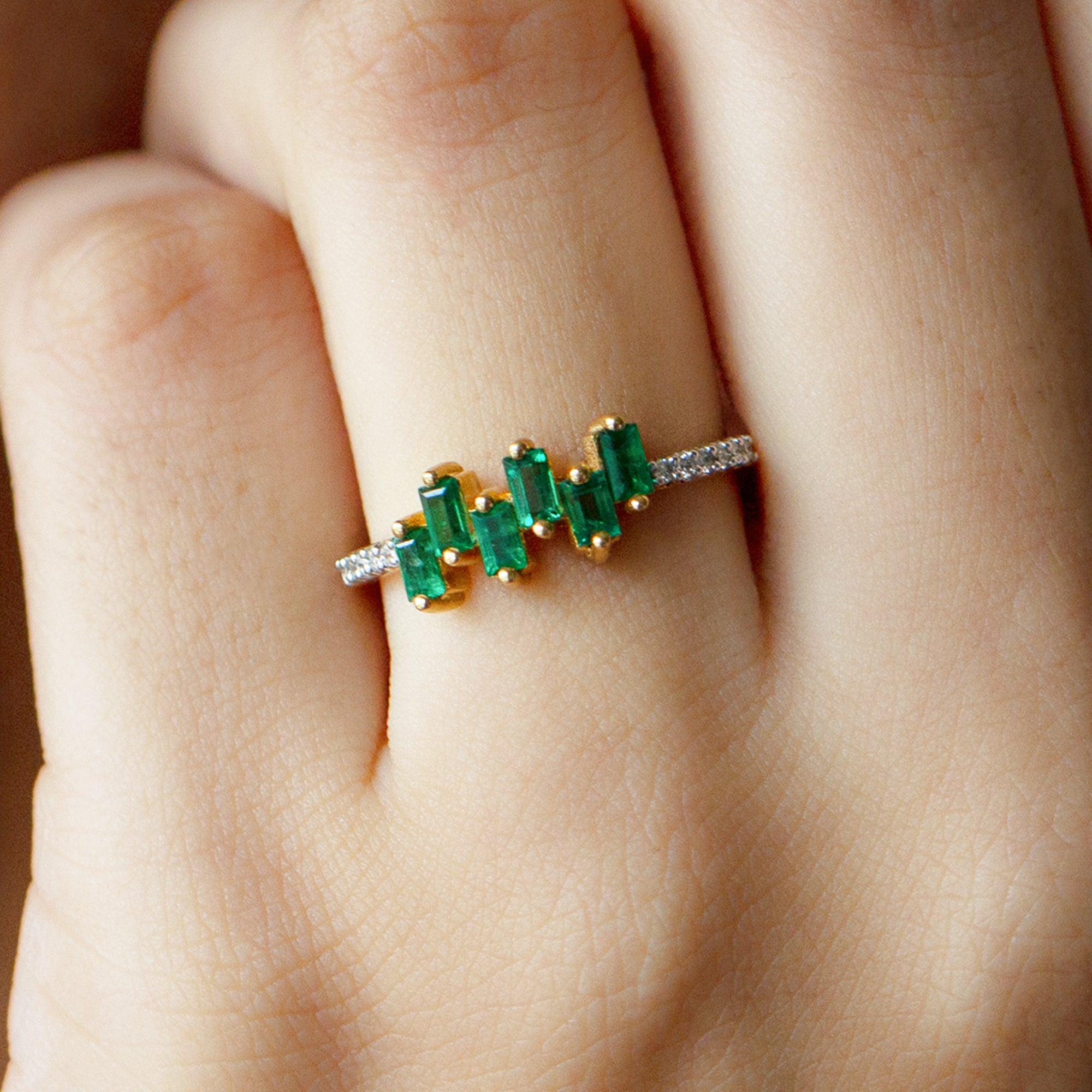 The baguette cut emerald is a type of step cut that features a slim and rectangular shape with straight edges. Baguette emeralds are a great pick for the ones who have no interest in flashy center stones. You can get a large center stone with side stones for a modern look.