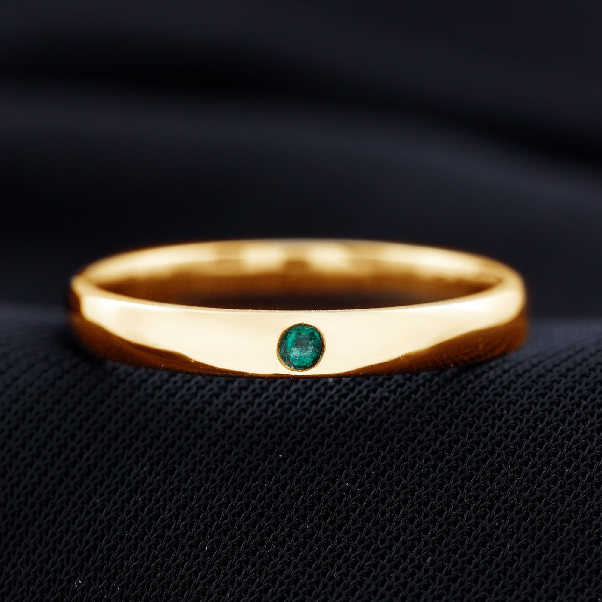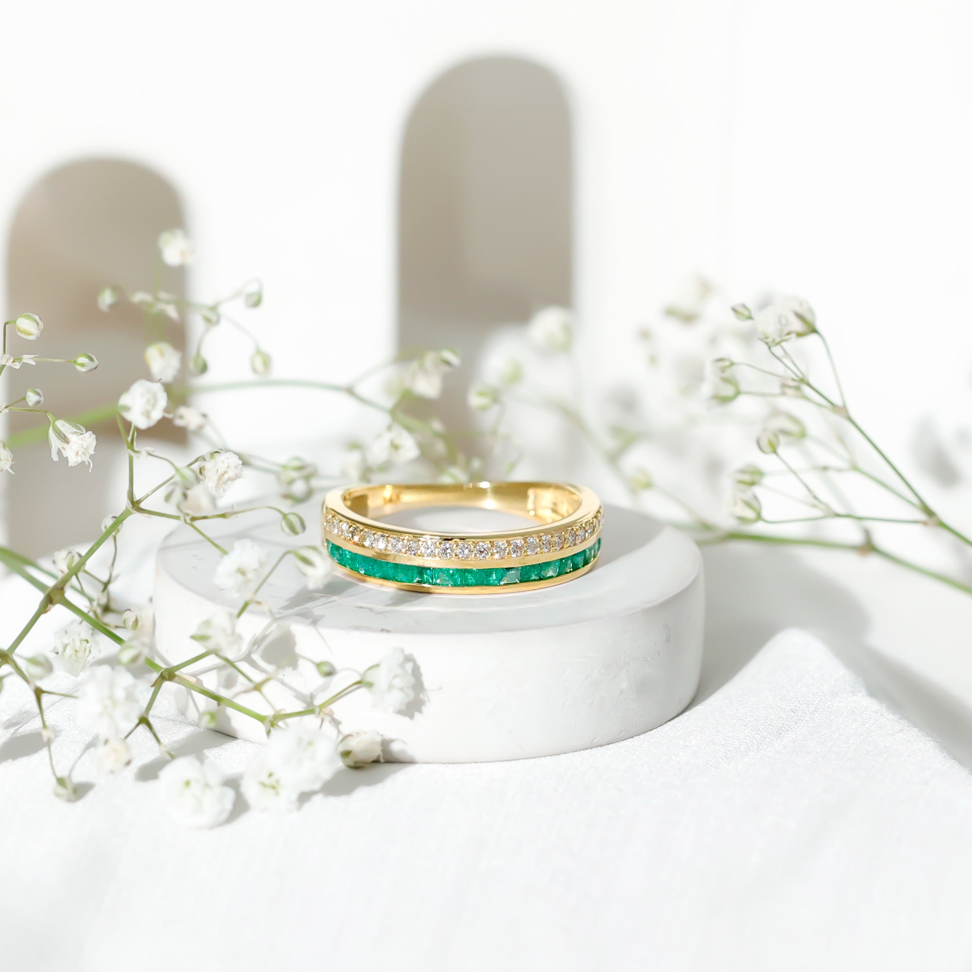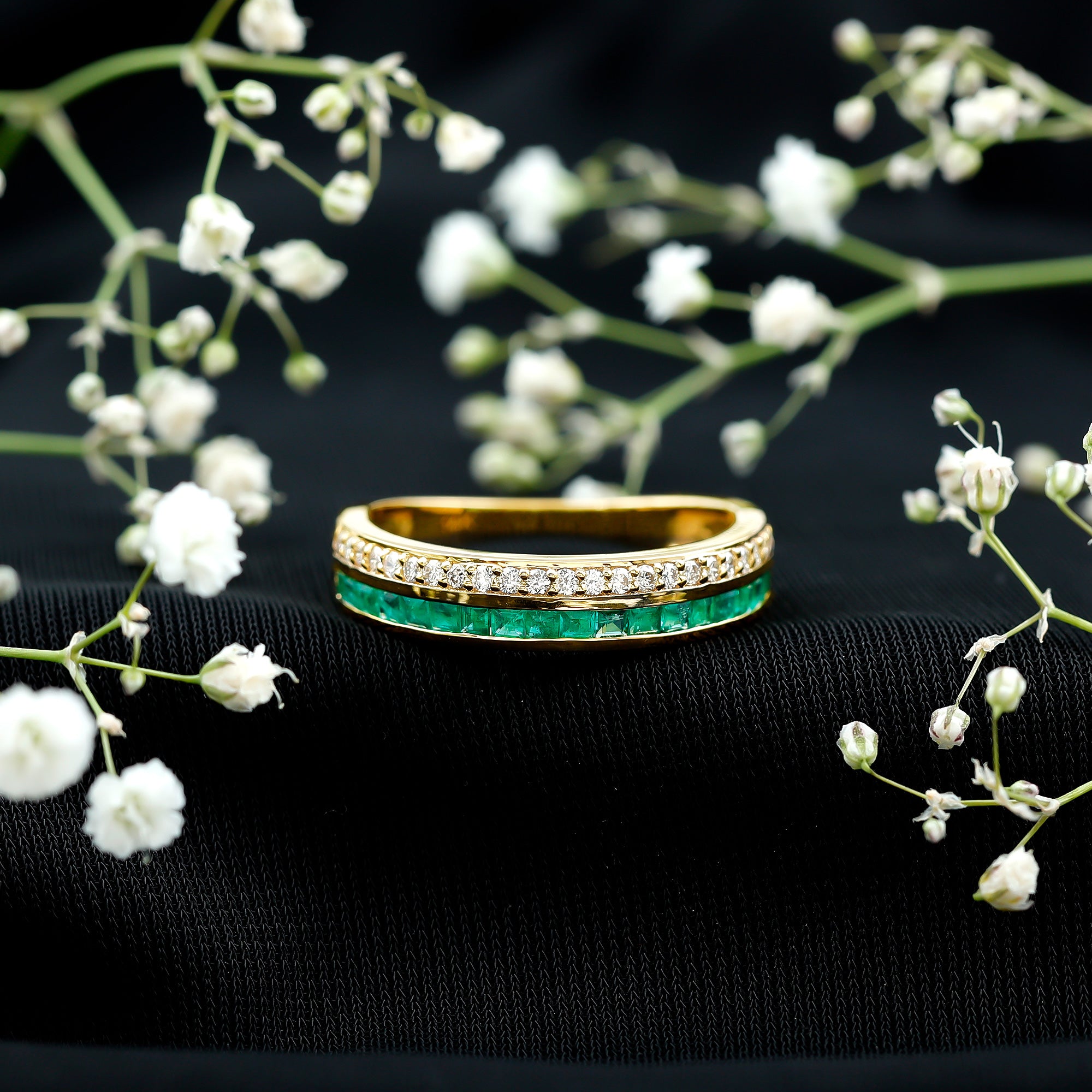 Give your wedding ring stack a pop of color twist with our elegant emerald curved wedding band. You can stack it with your engagement ring or wear it on its own, a perfect choice for stacking. It’s a classic design that will stand the test of time and sparkle bright on your big day.