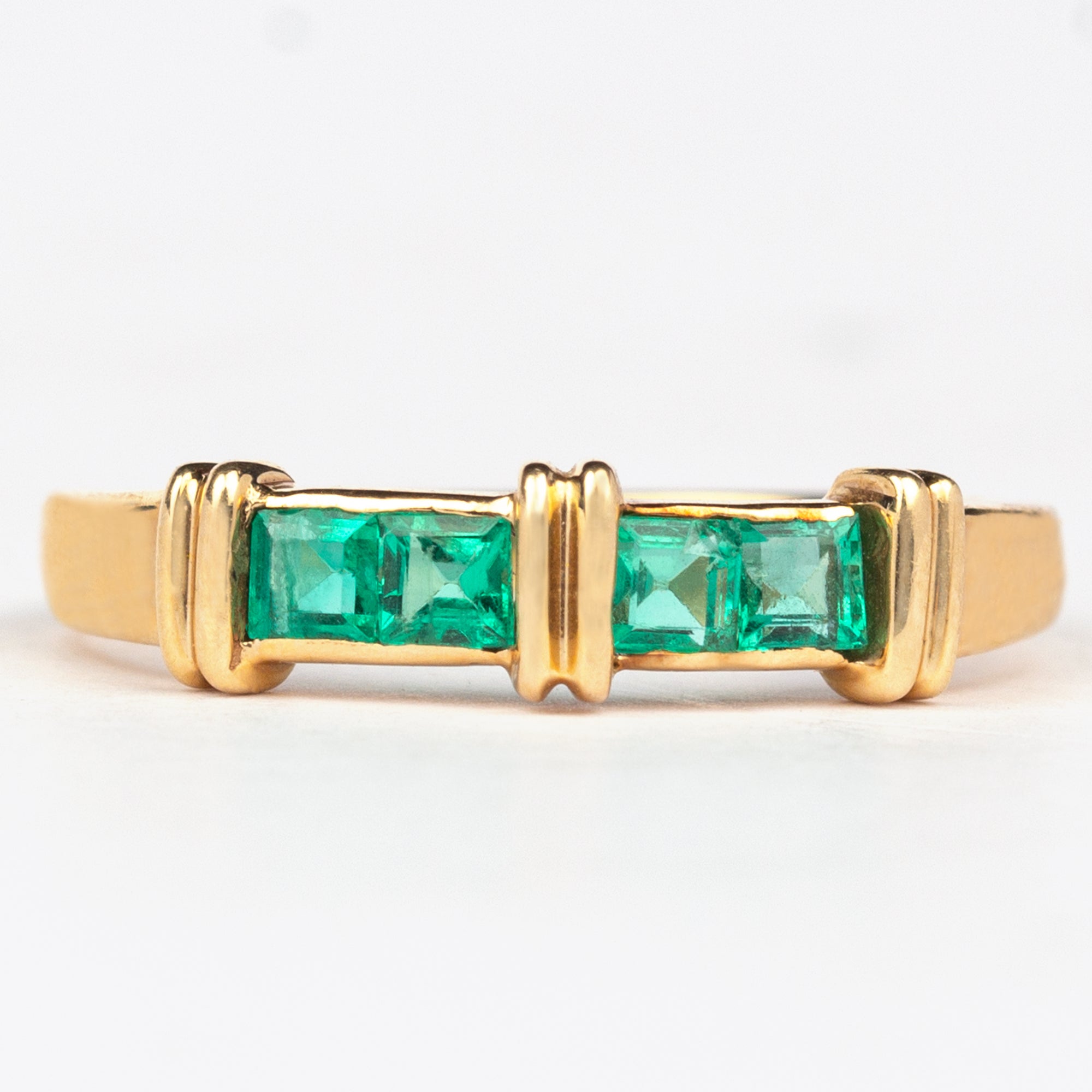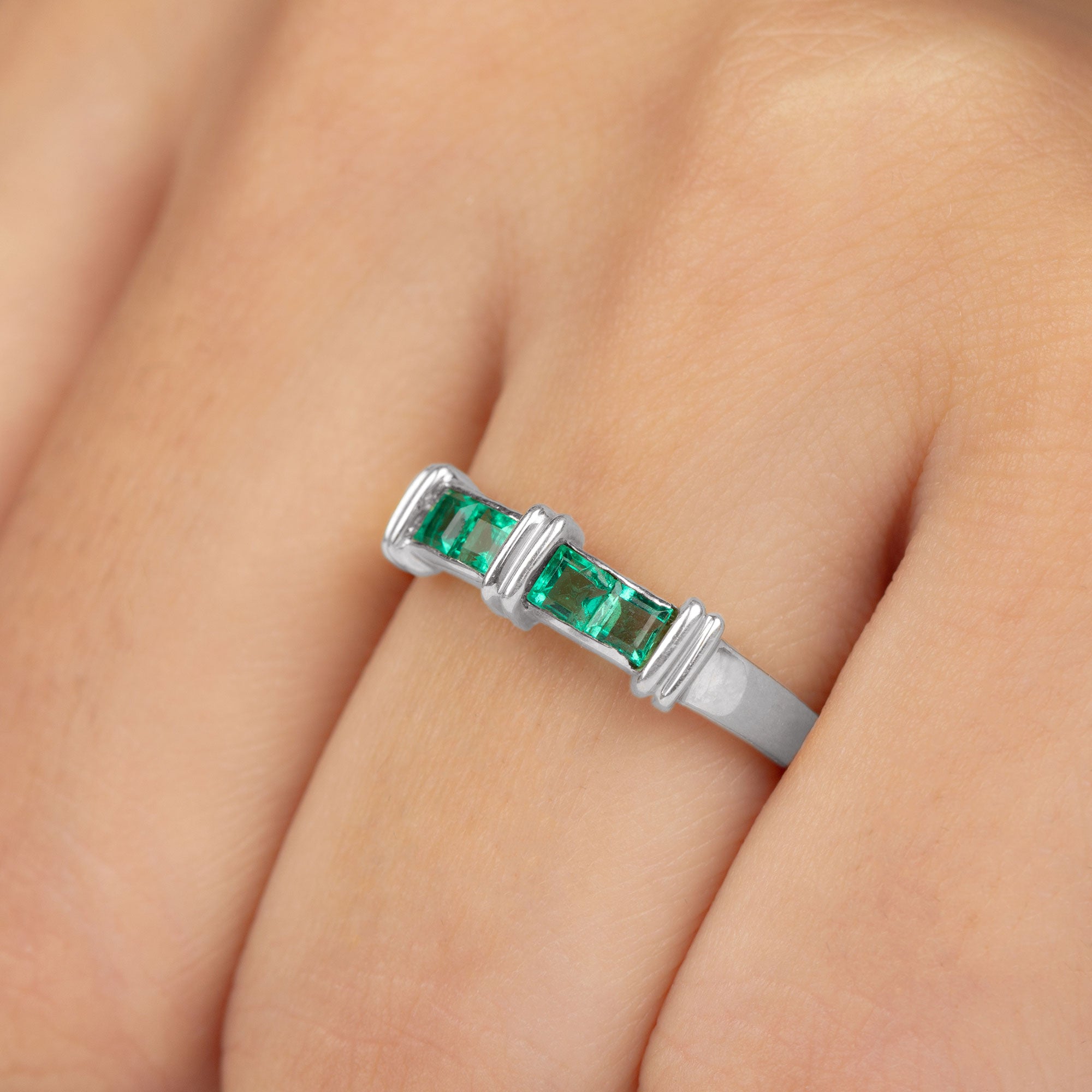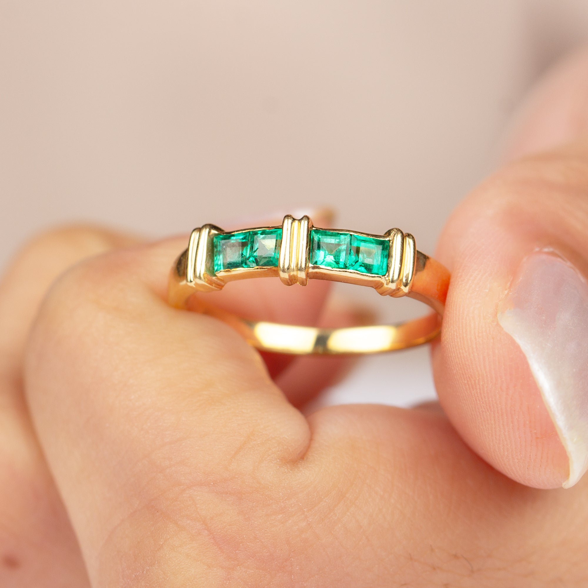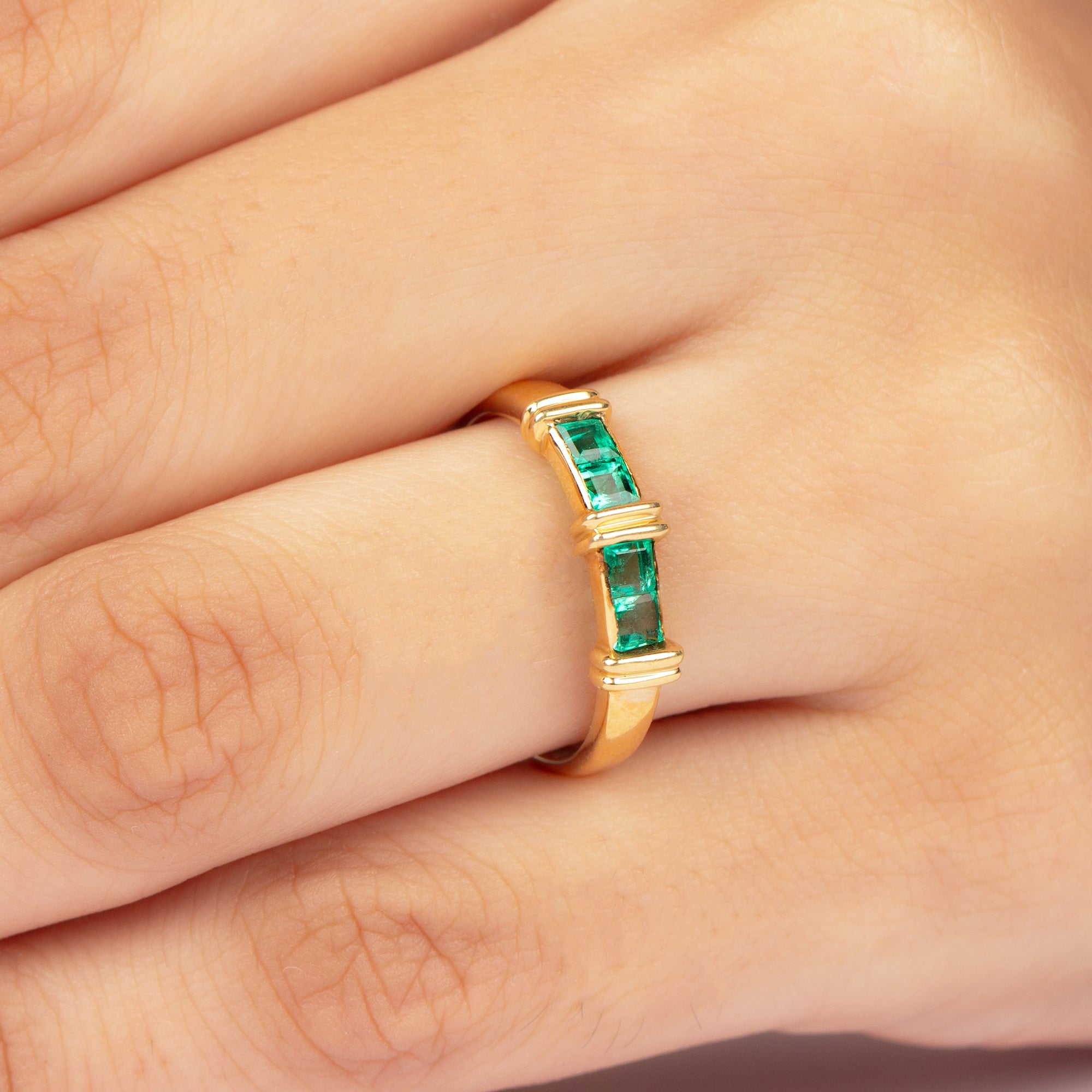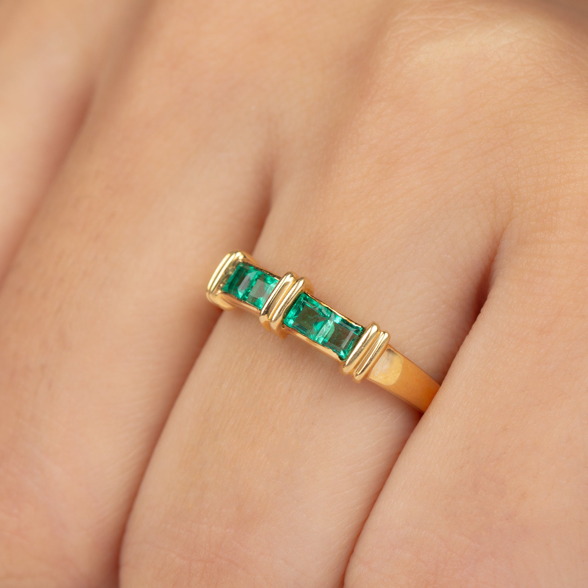 A decent emerald band ring will cost you anywhere between $500 - $4000 depending on factors such as the gemstone’s carat, color, cut and clarity, the type of gold metal, and the presence of other precious or semi-precious gemstones.