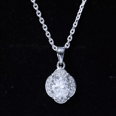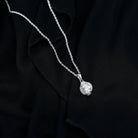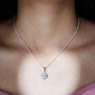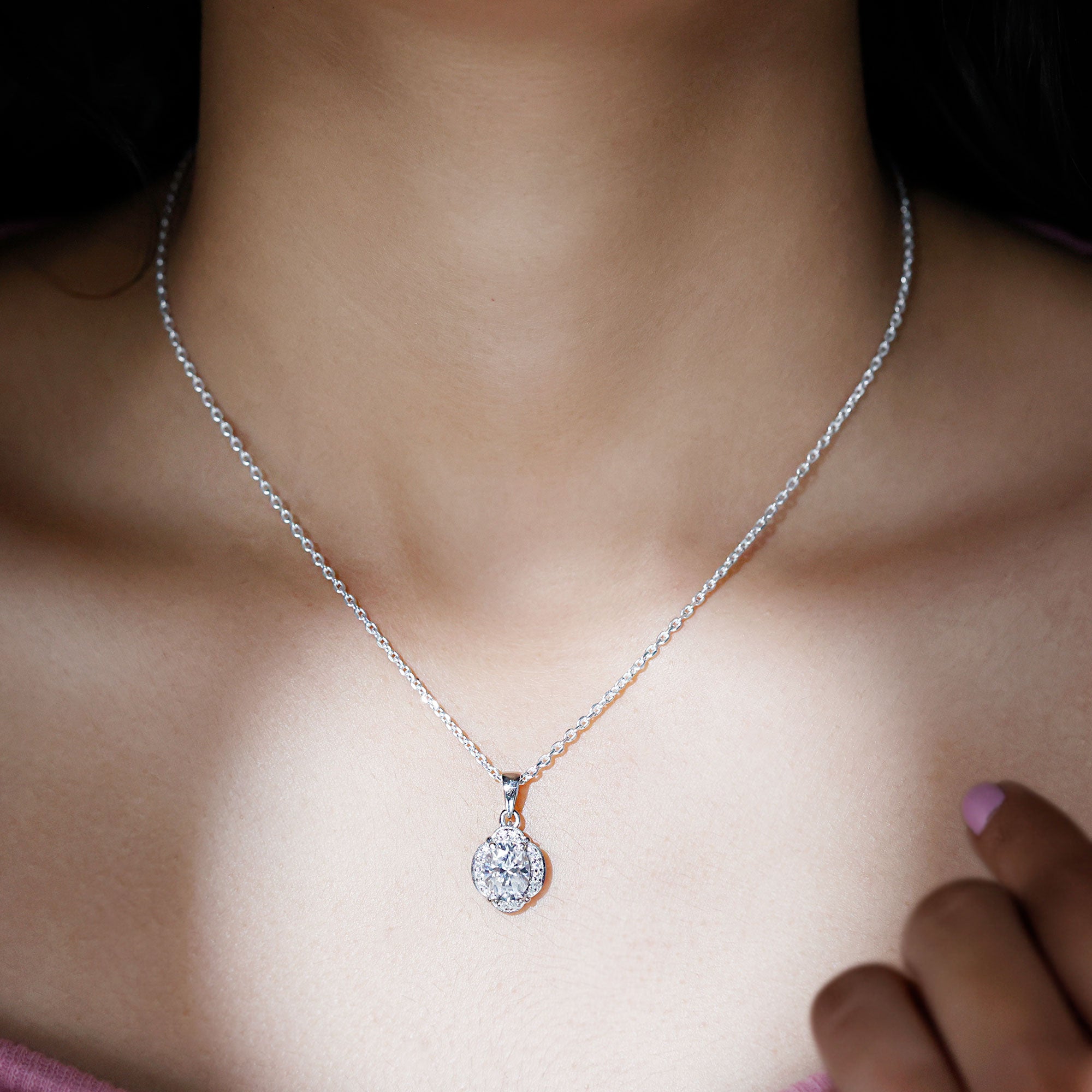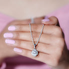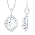 The wedding jewelry set is incomplete without this statement necklace, so to complete your bridal look, we got you covered with this Designer Moissanite Pendant that is crafted precisely in white gold-plated silver. The chain pendant features a 7X9 MM Oval Shape Moissanite securely placed in Prong Setting encircled by smaller Moissanites. This Vintage Necklace beholds the classic shine of D-VS1 Quality Moissanite, which perfectly blends with the vibe of the Wedding Day. The Halo Pendant dangles in a silver cable chain, which can be adjusted according to your style. This Moissanite Necklace can be a perfect present for the bride-to-be or for your bridesmaids.