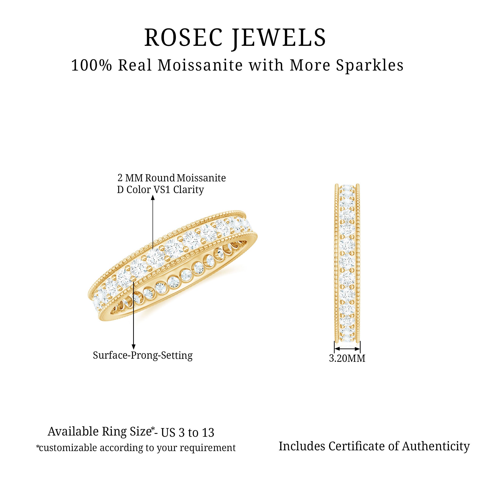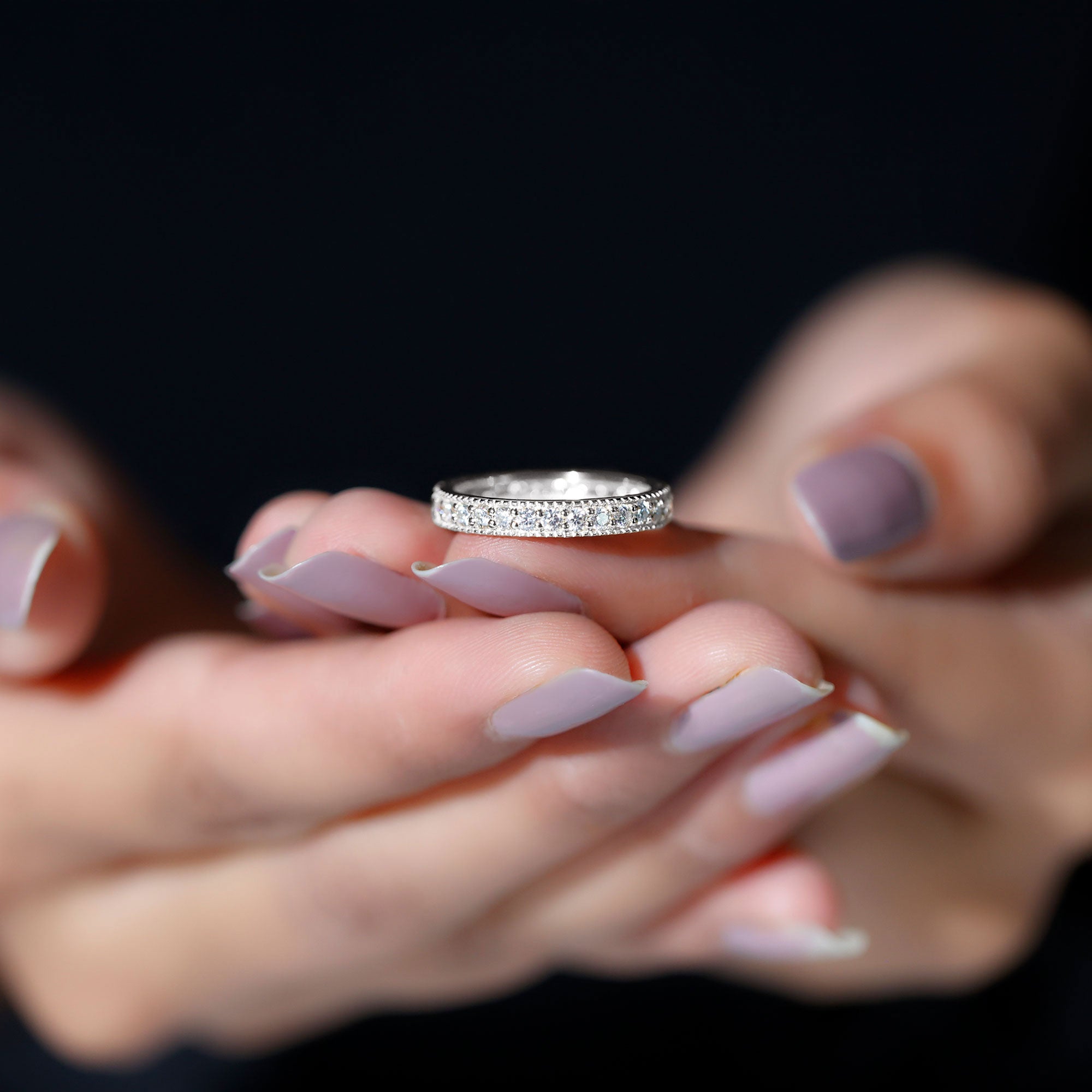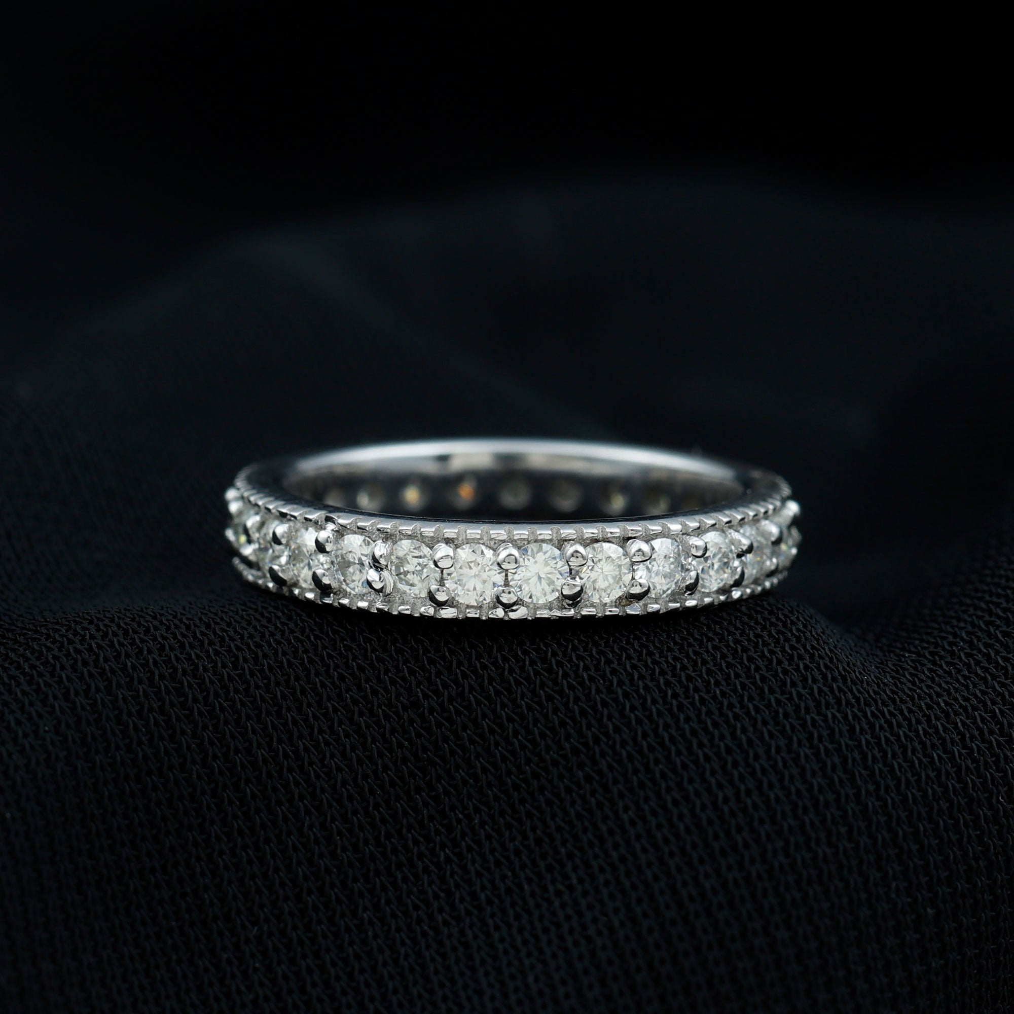 This Full Eternity Ring is the ultimate symbol of everlasting love. It is not just a gorgeous piece; it is a tribute to the moments that truly matter. Crafted with D-VS1 Quality brilliance, each Round Shape Moissanite is set in a sleek continuous band that radiates purity, strength, and a love that lasts forever. This Eternity Wedding Band is beautifully enhanced with milgrain detailing along the edges, designed to commemorate your most significant milestones, whether it is a wedding or an anniversary. The sparkle of this Moissanite Eternity Band is hard to miss, but it is the feelings behind each twinkle that really make it special. Sleek, timeless, and super versatile, this Moissanite Anniversary Band comes in a signature jewelry box, perfect for gifting or keeping for yourself for years to come. Add a touch of forever to your daily style, stack it with your favorite pieces, or let it shine on its own, the choice is yours. Decorate your fingers with a piece that not only looks amazing but also serves a purpose: to remind you that some connections never fade, and some promises are meant to shine for a lifetime.