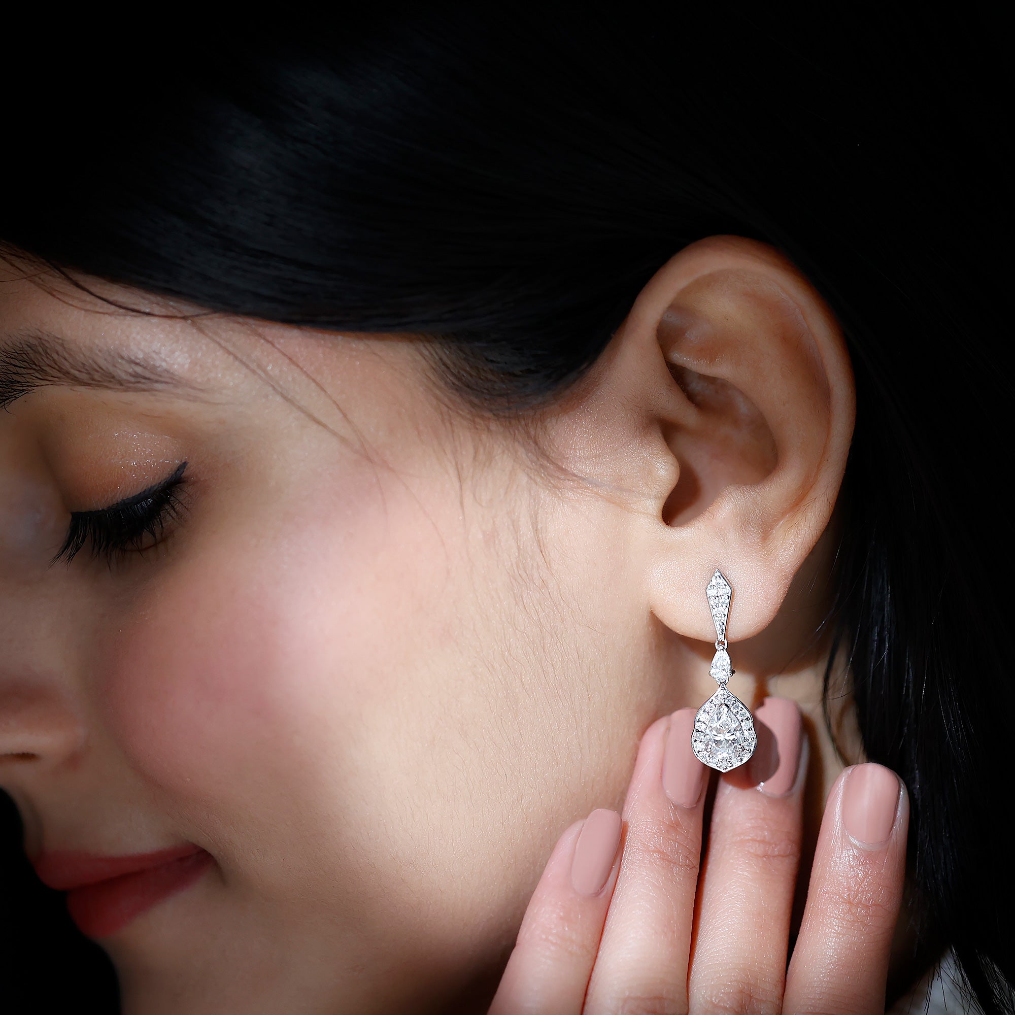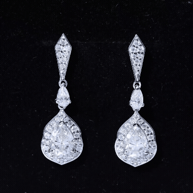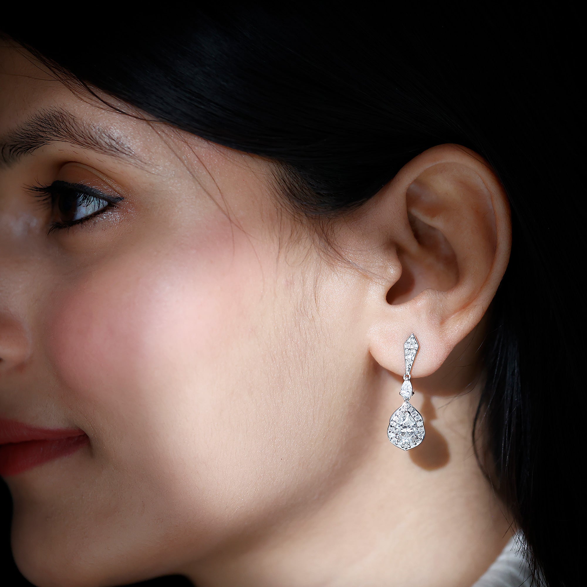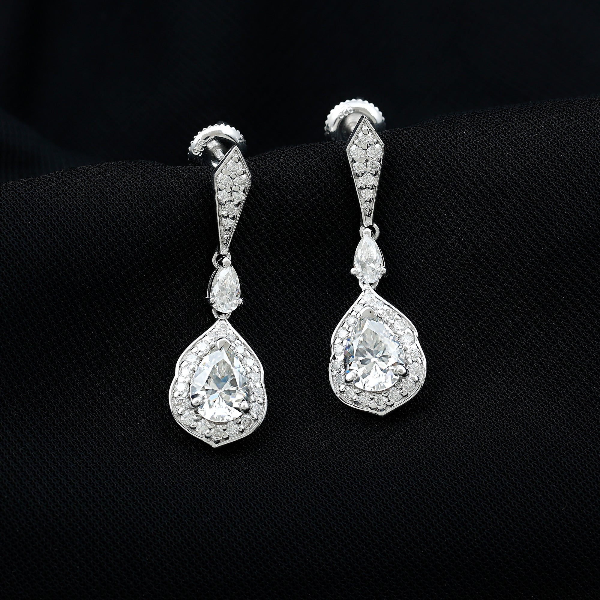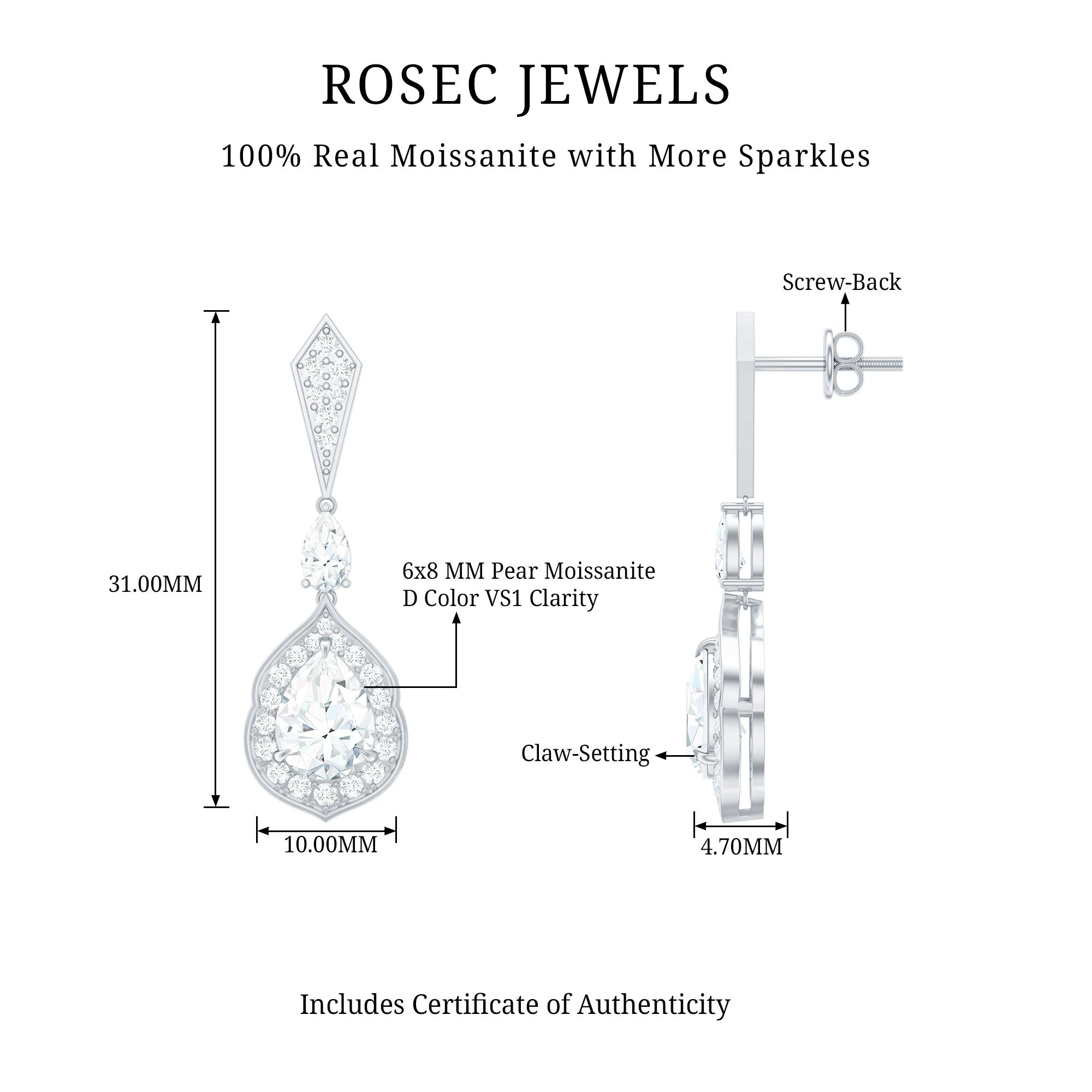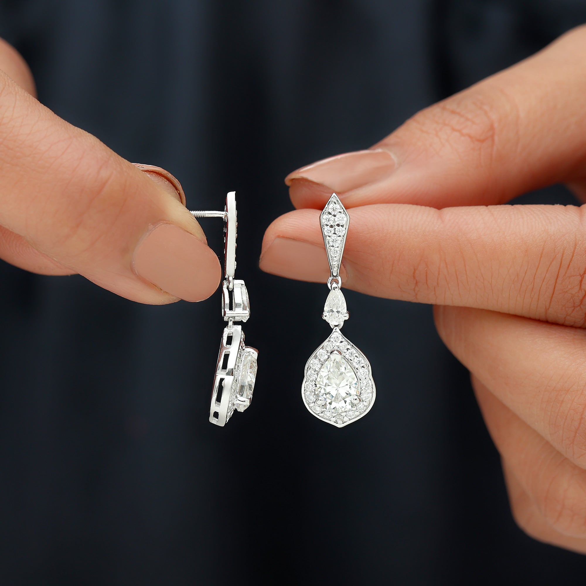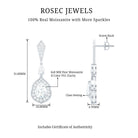 Step up your style with the Moissanite Wedding Earrings, a true blend of luxury and timeless charm. These Dangling Earrings showcase 6X8 MM Pear Shape Moissanite in Claw Setting, meticulously placed to enhance brilliance and sparkle. A vintage inspired halo encircles the dangling gem, adding an enchanting glimmer. At the top, a geometric stud is adorned with smaller round cut stones, while a petite 3X5 MM pear cut stone links the stud to the elegant teardrop. Crafted from 14K white gold plated sterling silver, the drop dangle design flows beautifully, making a stunning statement for any event, from formal gatherings to chic nights out. With meticulous craftsmanship and attention to detail, the Silver Bride Earrings achieve the perfect mix of boldness and finesse. Their detailed design makes them a versatile piece that fits various styles, enhancing your fine jewelry collection. Wearing these Teardrop Earrings gives you an air of elegance and sophistication, catching light and admiration from every angle. Featuring the classic brilliance of D-VS1 Quality Moissanite, these earrings are the ultimate showstopper for any occasion. The Teardrop Moissanite Earrings come with a Screw Back Closure to ensure they stay securely in place all day long. They are perfect for weddings, engagements, Valentines Day, or any event where you want to shine.