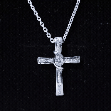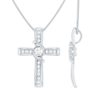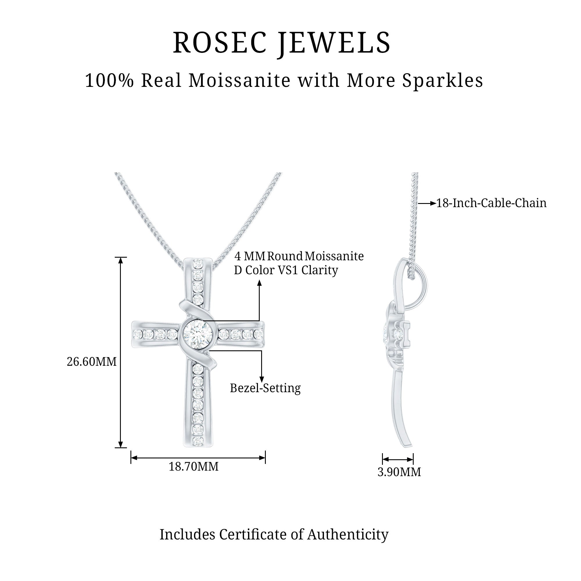 Experience the beauty of timeless elegance and deep symbolism with our Moissanite Cross Necklace. At the center of this stunning piece lies a beautifully cut 4 MM round Moissanite, securely set in a bezel, complemented by four bars, one in each direction and adorned with smaller stones, creating a striking and brilliant cross design. This Christian Cross Pendant includes a hidden bail and a sturdy cable chain that enhances its brilliance, resulting in a luminous and unforgettable appearance. Made from durable and luxurious 14k white gold plated silver, this Moissanite Pendant Necklace perfectly combines enduring beauty with spiritual meaning. Whether you wear it as a significant symbol of faith or as a breathtaking statement accessory, this religious pendant is crafted to mesmerize from every perspective. A classic symbol, reimagined with exquisite craftsmanship and radiant elegance.