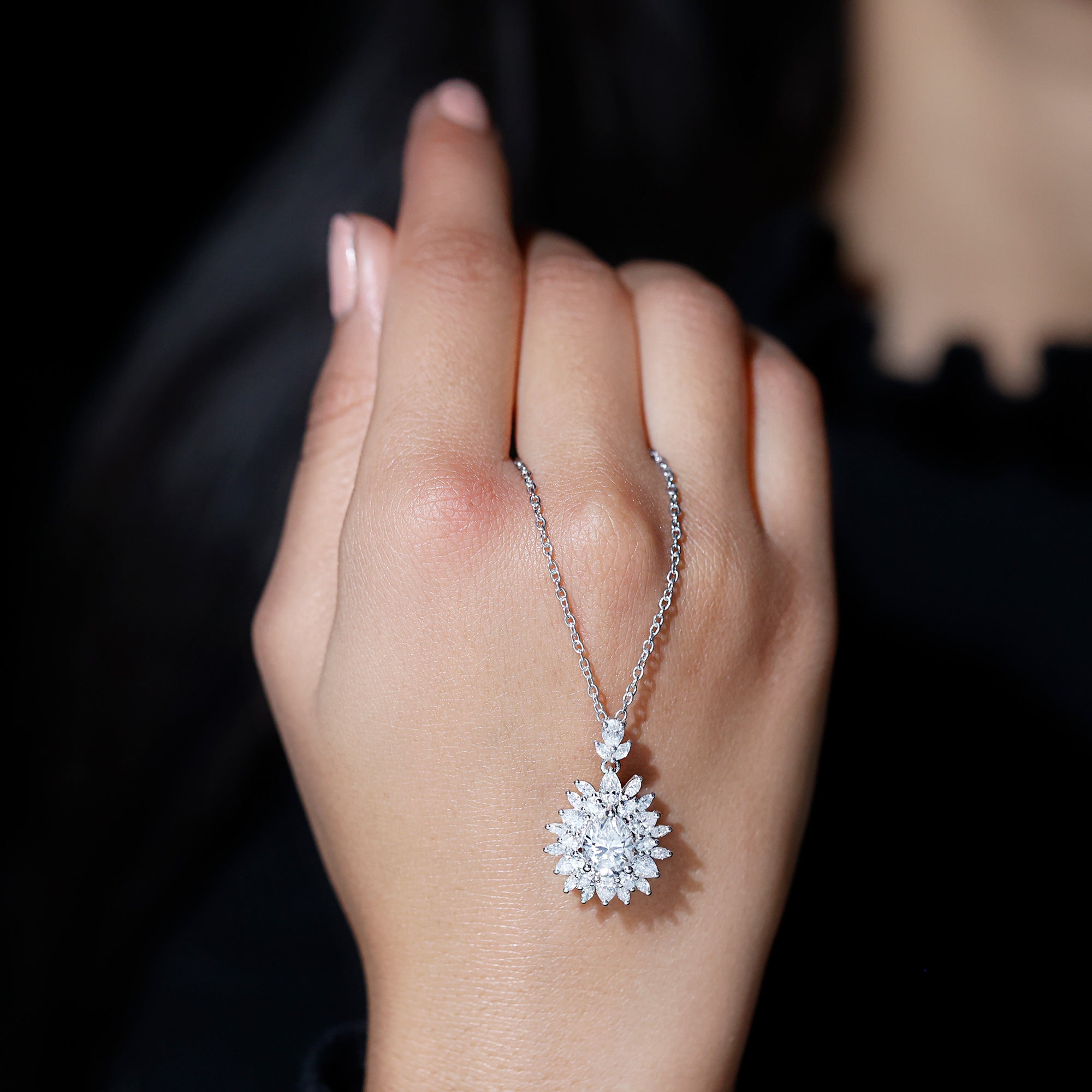 Step into elegance with a piece of jewelry that blossoms like a radiant flower - this Moissanite Designer Necklace is a true celebration of brilliance and beauty. At the heart of this design lies a captivating 7X9 MM pear shaped Moissanite which shines with its D color and VS1 clarity, making it a timeless piece. Surrounding the center stones is a blooming arrangement of pear and marquise cut stones, artistically layered to resemble petals of a flower. The prong setting used throughout adds durability and elevates the sparkle, giving each stone its moment to shine. The Moissanite Teardrop Pendant dangles gracefully from a sleek chain, both handcrafted in white gold plated silver. It is a perfect harmony of nature-inspired artistry and timeless sophistication. Whether you are the bride walking down the aisle, a bridesmaid stealing glances, or simply dressing up for a moment worth remembering, this Bridal Necklace for Wedding brings a magical glow that mirrors your joy.