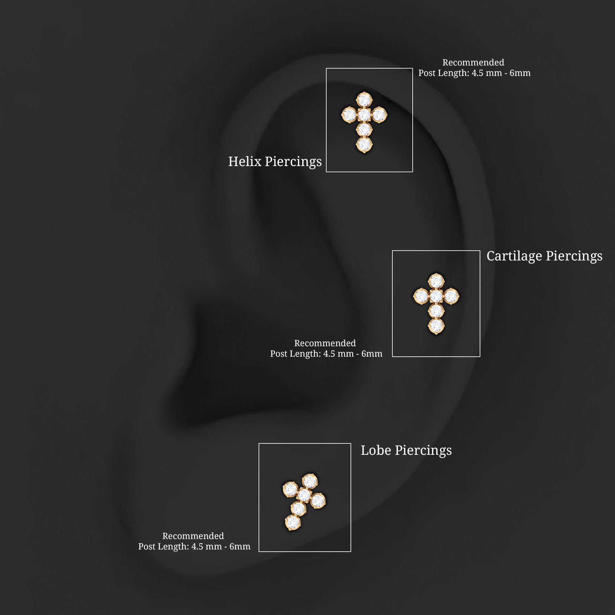 Get ready to dazzle with our show-stopping Moissanite Gold Cross Earring featuring small Round Cut Moissanite secured in 4 Prong Setting. You can also wear it on your Helix, Tragus, Conch, Upper Lobe, or Cartilage Piercing. The dainty size and elegant style make this earring perfect for both everyday wear and special occasions.