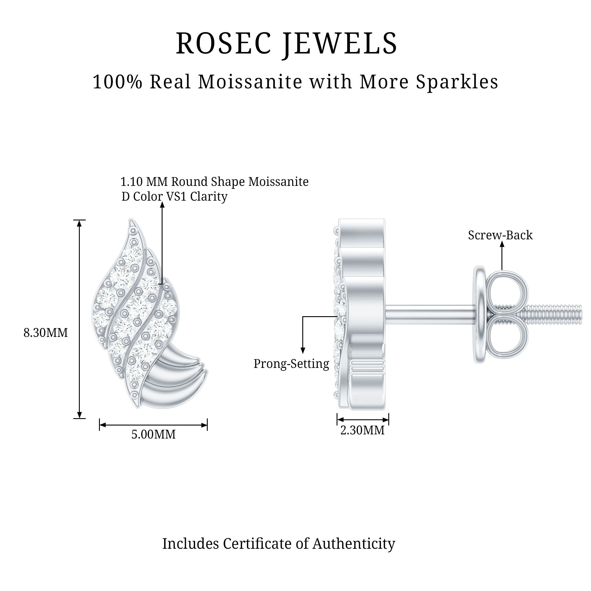Explore the beautiful Moissanite Stud Earrings crafted just for you. Enhance your style for any event with the stunning Moissanite Studs from Rosec Jewels. These simple yet elegant earrings effortlessly highlight the beauty of your ears. They are a popular choice for daily wear, providing a classic and enduring charm. Featuring delicate round Moissanite stones gracefully set in a prong setting with some curved motifs, they create a mesmerizing appearance. Made from ultra-luxurious sterling silver and plated with 14K White Gold, these striking Everyday Earrings radiate elegance. The screw back closures guarantee a secure and comfortable fit, ensuring the earrings stay perfectly in place on your lobe. Whether you are indulging yourself or giving a gift to someone special, these Silver Stud Earrings are an ideal addition to any jewelry collection. They serve as an upgrade to a more impressive pair, timeless and adaptable for any occasion.