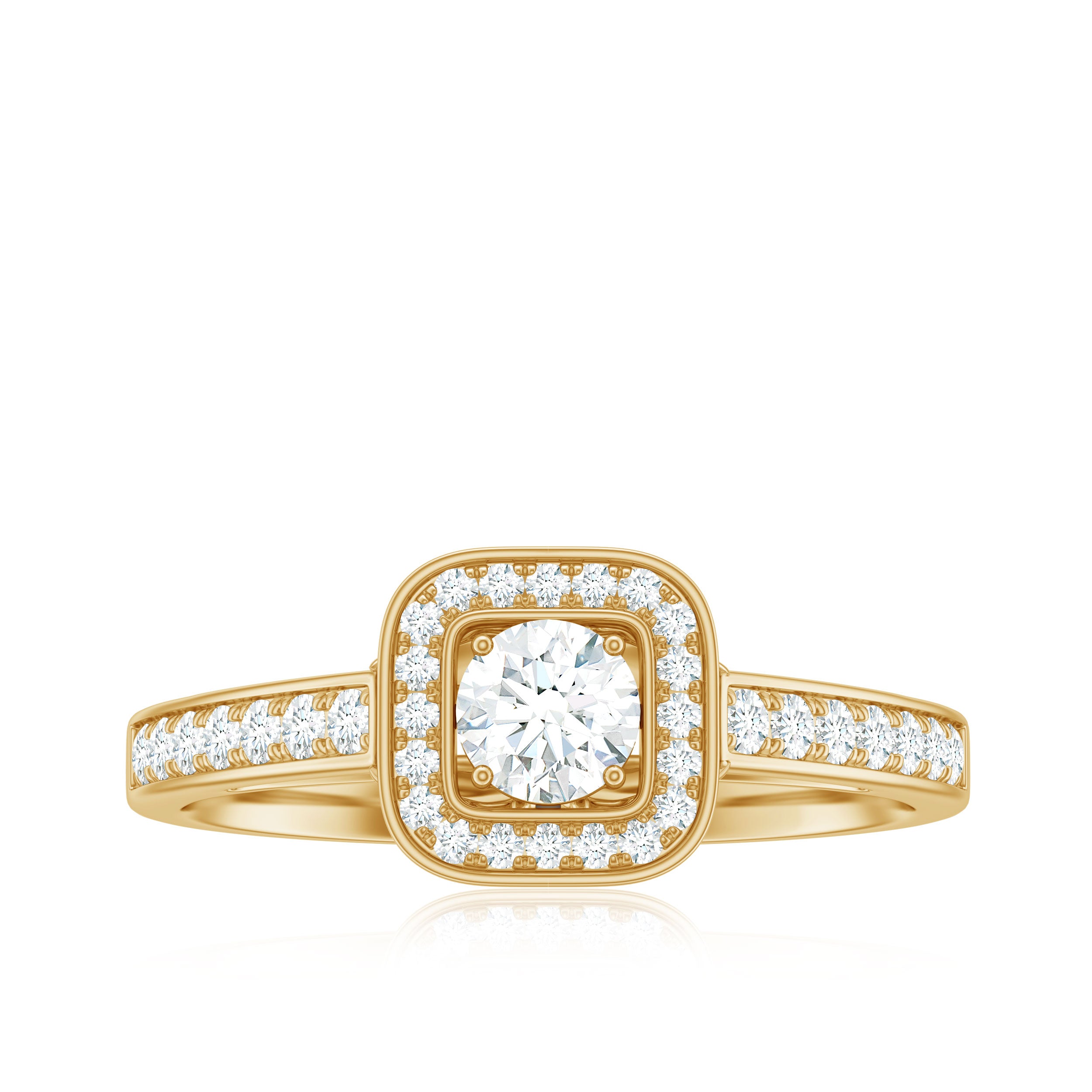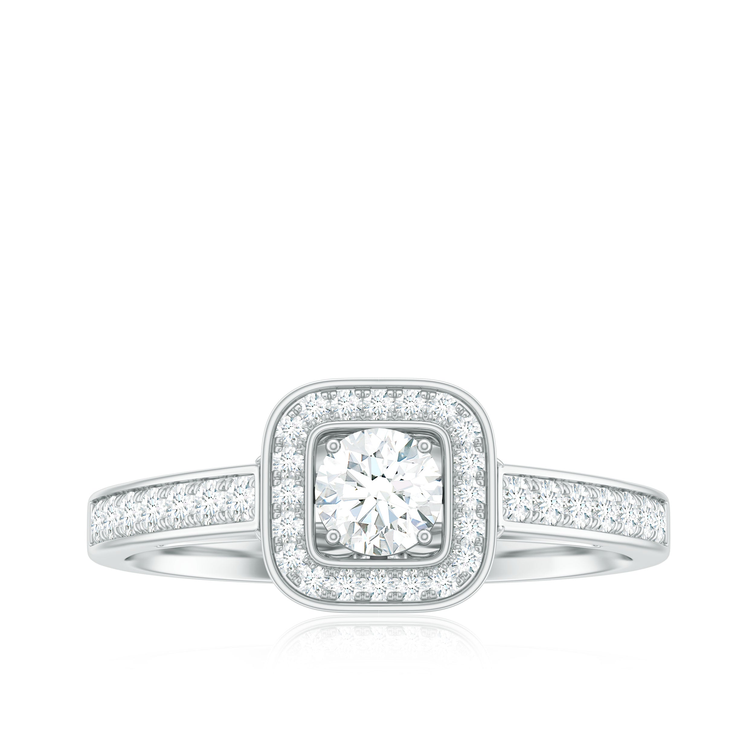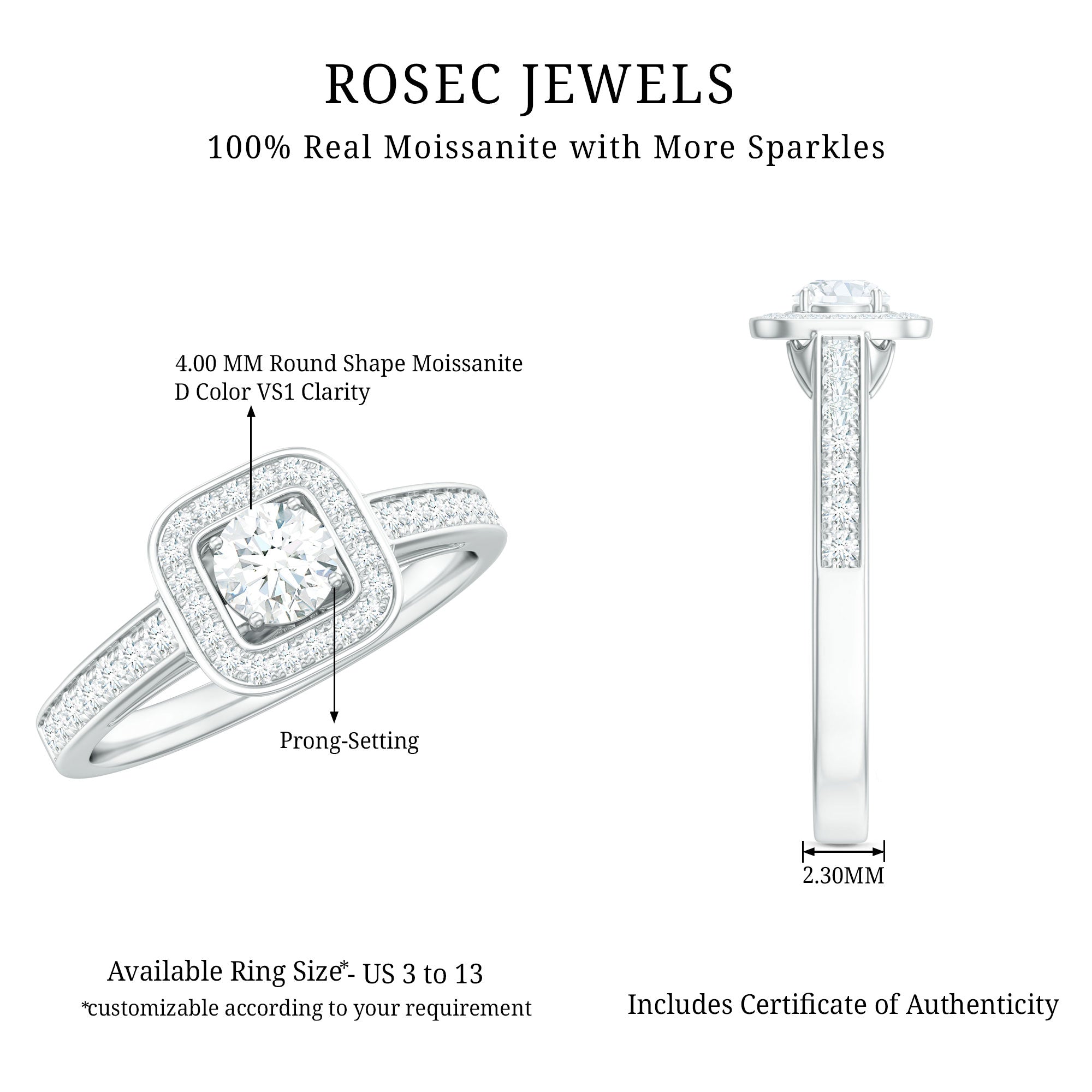 A timeless sparkle with a modern twist, this Moissanite Engagement Ring is where classic romance meets contemporary elegance. At the heart of this radiant design lies a 4 MM Round Cut Moissanite, expertly set in secure prong setting that lets its brilliance shine through effortlessly. Surrounding it is a striking square shaped halo, crafted with shimmering round moissanite stones. The band itself is sleek and adorned with a row of carefully set round moissanites, offering just the right amount of extra sparkle while maintaining a refined profile. Designed for those who appreciate detail, light, and meaning, this Halo Engagement Ring balances sophistication with simplicity. Whether you are popping the question or celebrating a milestone, it is made to capture hearts. This Classic Engagement Ring is available in a wide range of US sizes from 3 to 13 and can be customized in various metal colors and finishes to suit your personal style. It also arrives in a premium jewelry box with a certificate of authenticity, making it a ready-to-gift treasure.