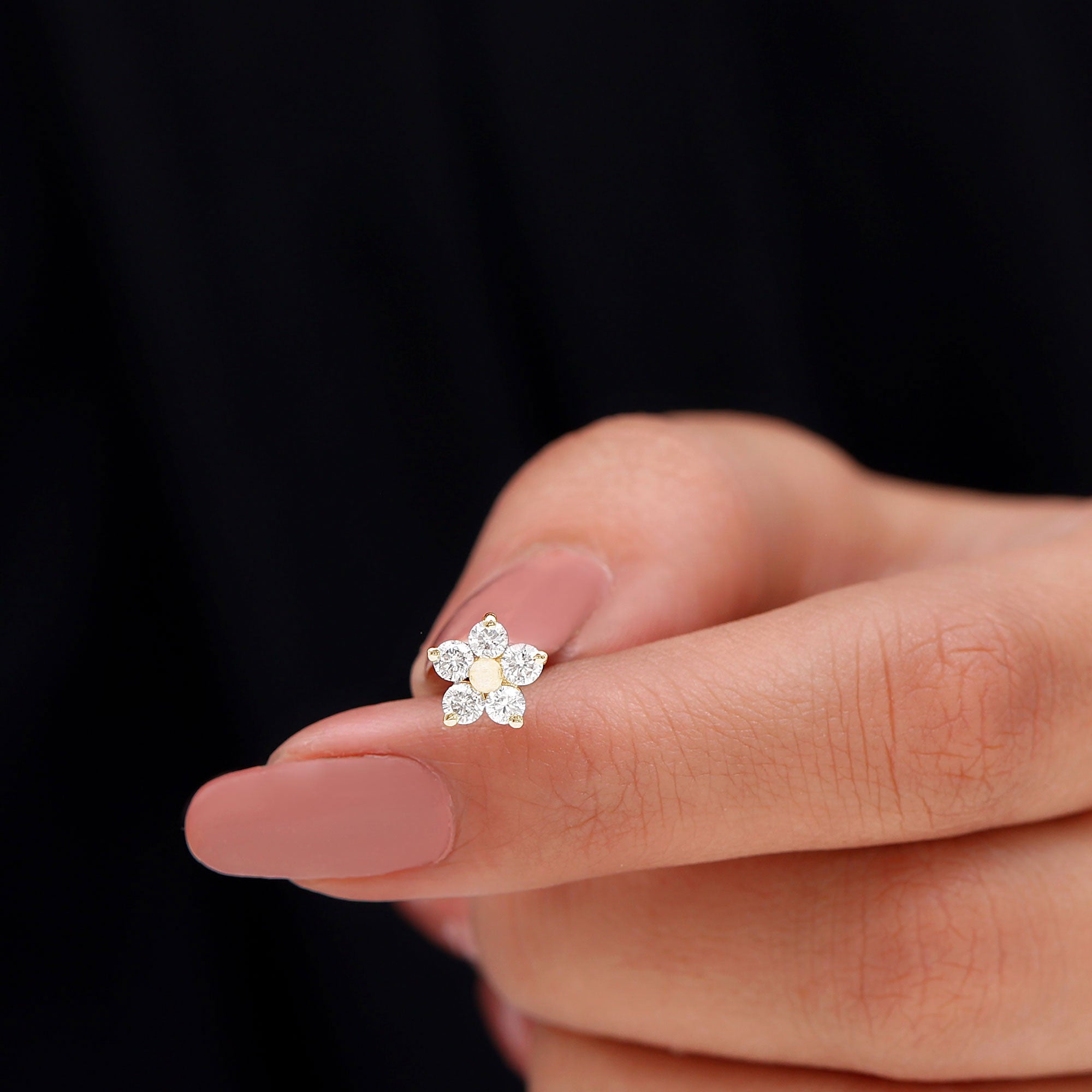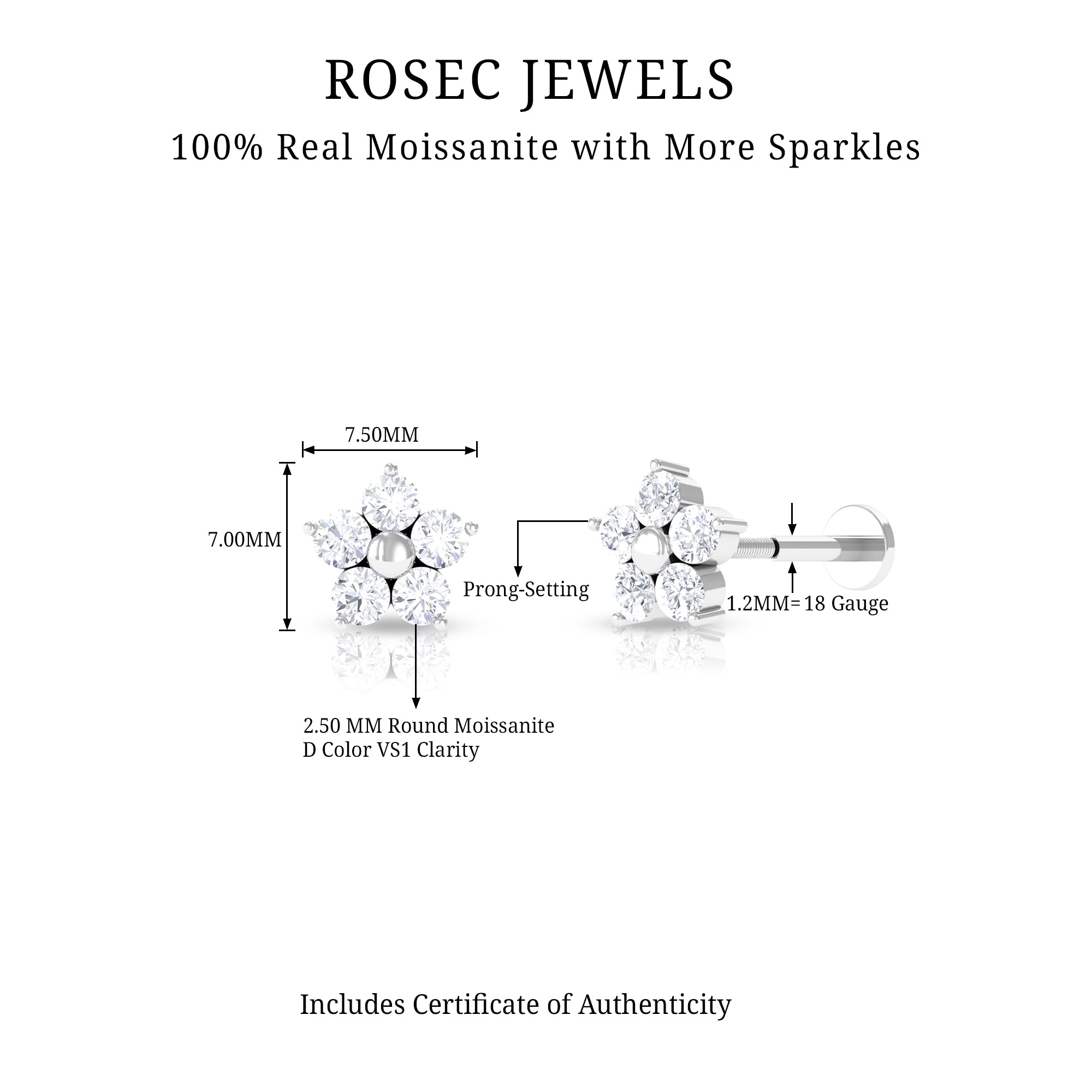 Adorn yourself with our exquisite Flower Earring adorned with Round Cut Moissanites in Prong Setting, arranged in the shape of a blooming flower. The Floral Earring can be worn on your Conch, Helix, Tragus, Cartilage, or Upper Lobe Piercing, and the Flat Back Closure will keep it securely in place. This Moissanite Earring would make an excellent Graduation Gift for someone special.