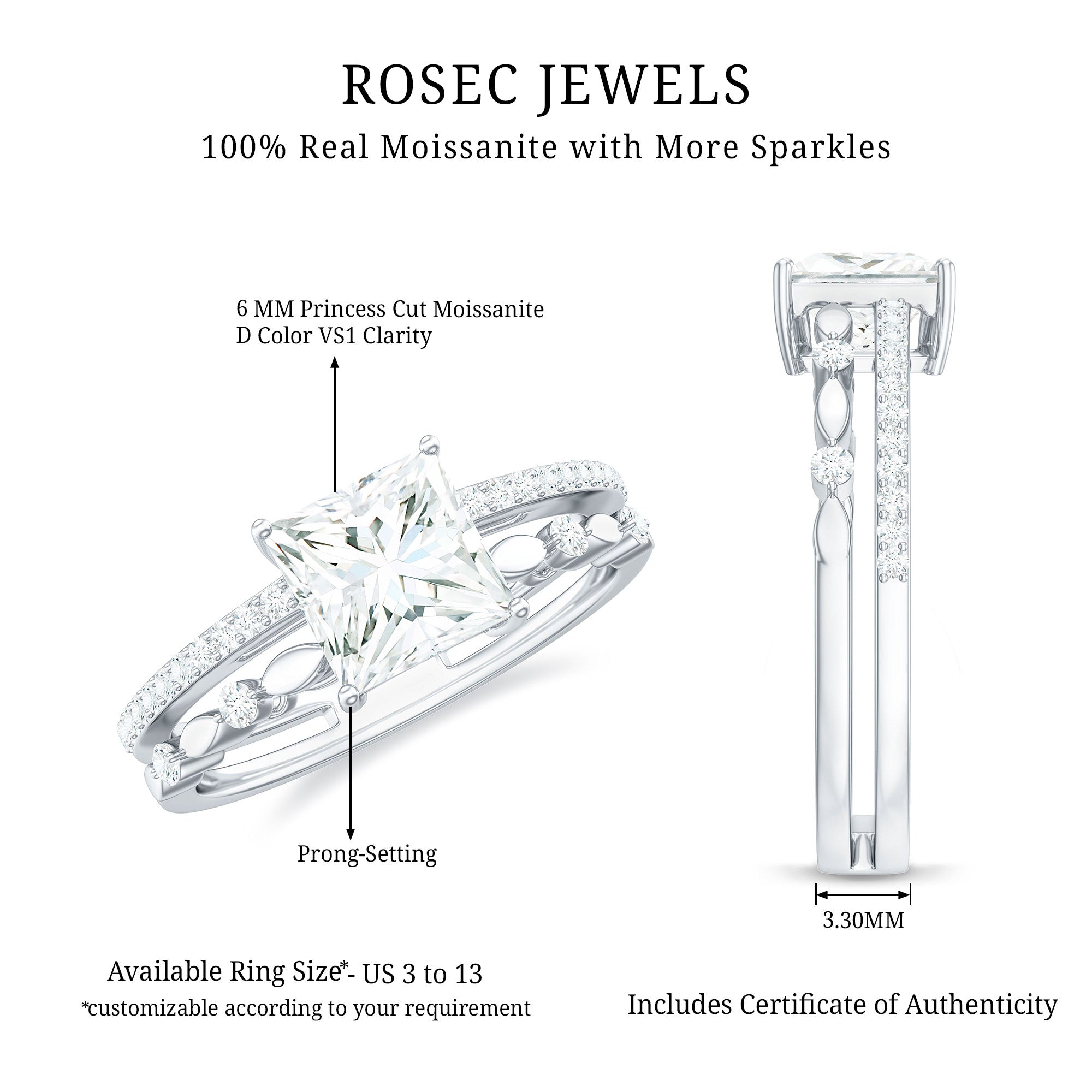 Capture her heart with the breathtaking details of this Double Band Engagement Ring, which features a 6 MM Princess Cut Moissanite (D-VS1 quality) securely held in prong setting. The distinctive double band shank adds an artistic flair, with one band adorned with a row of surface prong set round cut moissanites for a continuous shimmer, while the other displays delicate marquise metal motifs and gemstones set alternately for a modern touch. Together, these features in this Princess Cut Engagement Ring create the illusion of a stackable ring while ensuring the comfort of a single band. Crafted to represent everlasting love, this Moissanite Engagement Ring is an ideal choice for the bride who appreciates elegance, individuality, and timeless charm. This classic Square Engagement Ring beautifully tells your unique love story, showcasing its enduring beauty and exceptional craftsmanship. Whether you aim to make a bold statement with your engagement ring or simply desire a piece of jewelry that will remain stylish forever, this ring is guaranteed to leave a lasting impression.