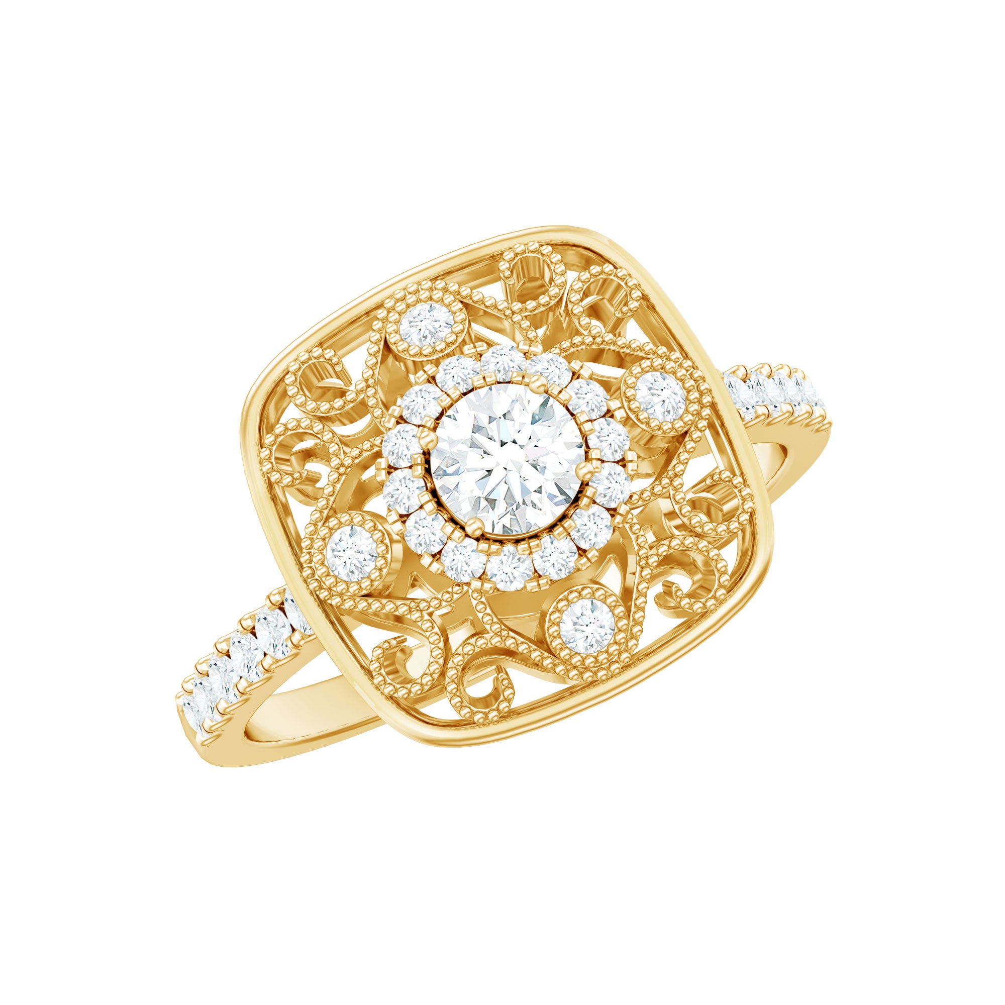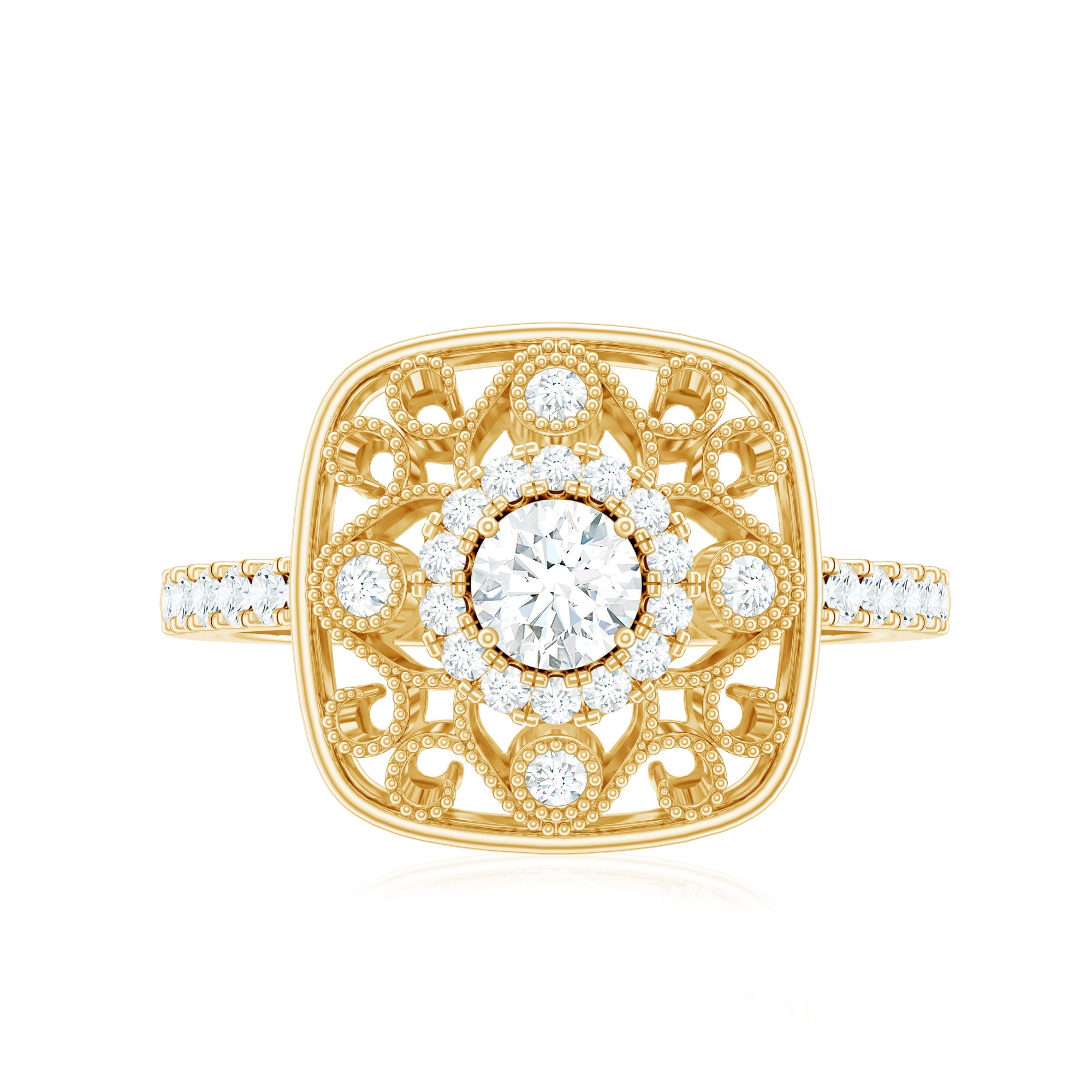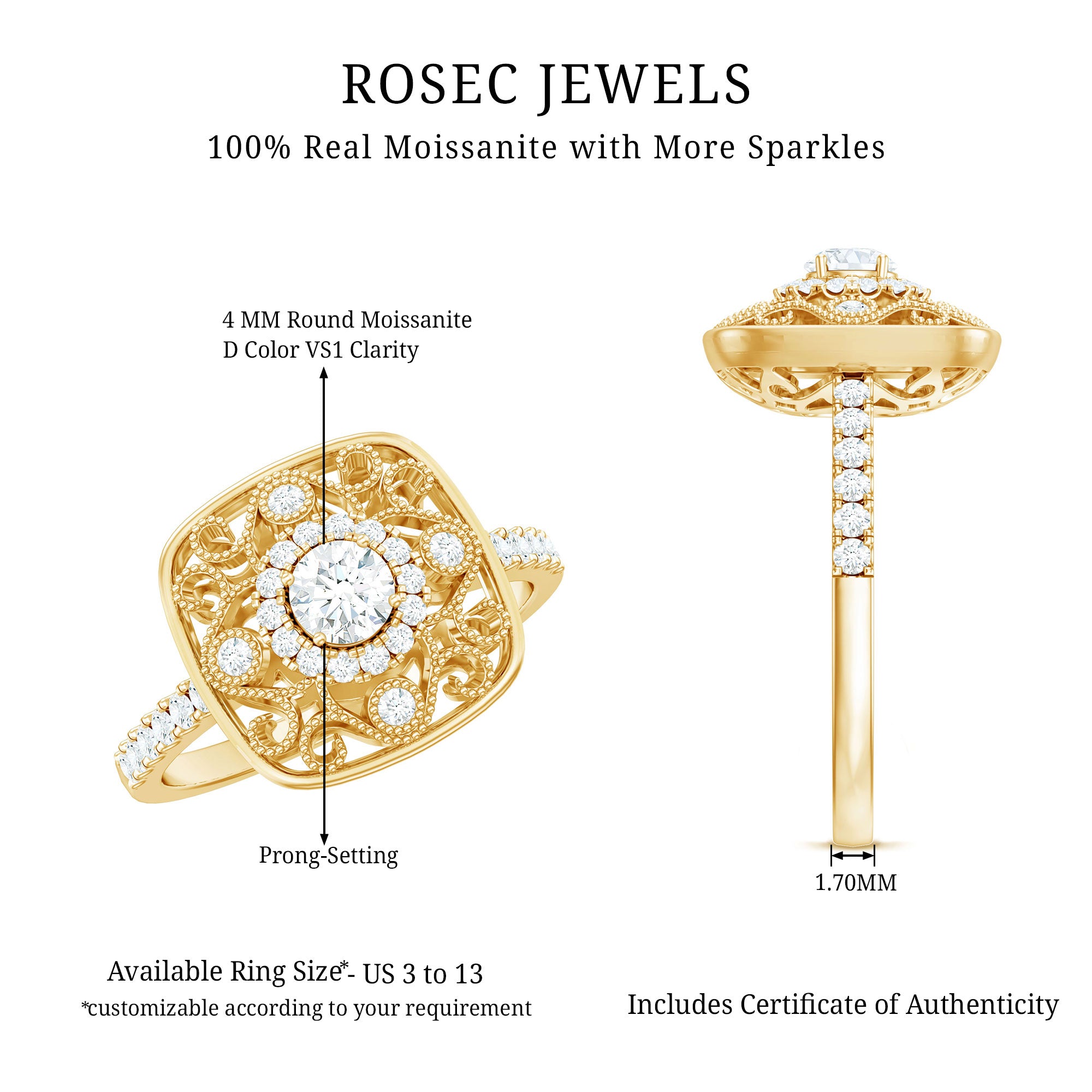 Ready to fall in love with something truly magical? This vintage-inspired Moissanite Engagement Ring gives all the old-school charm with a modern twist. It is designed to totally steal the show, and your heart - with a round cut moissanite sitting pretty right at the center, held securely in prong setting. Surrounding it is delicate beaded detail that creates a vintage pattern and a stunning arrangement of smaller stones that make the whole thing shine from every angle. The band is just as dreamy, with extra moissanite stones sparkling down the sides, because who doesnt love a little extra shimmer? All the moissanite stones are of D-VS1 quality, so you are getting serious sparkle without compromising on clarity or ethics. What really sets this Antique Engagement Ring apart is its vintage art deco vibe - it is timeless, elegant, and seriously eye-catching. Whether you are proposing, upgrading your ring, or just treating yourself (you deserve it), this piece adds a bold, romantic touch to any look. And hey, you can totally make it your own – this Vintage Moissanite Ring is available in different metal colors and purity options, so you can pick the one that feels just right for your style. Basically, it is not just a ring - it is a whole vibe. Classic, classy, and full of sparkle.