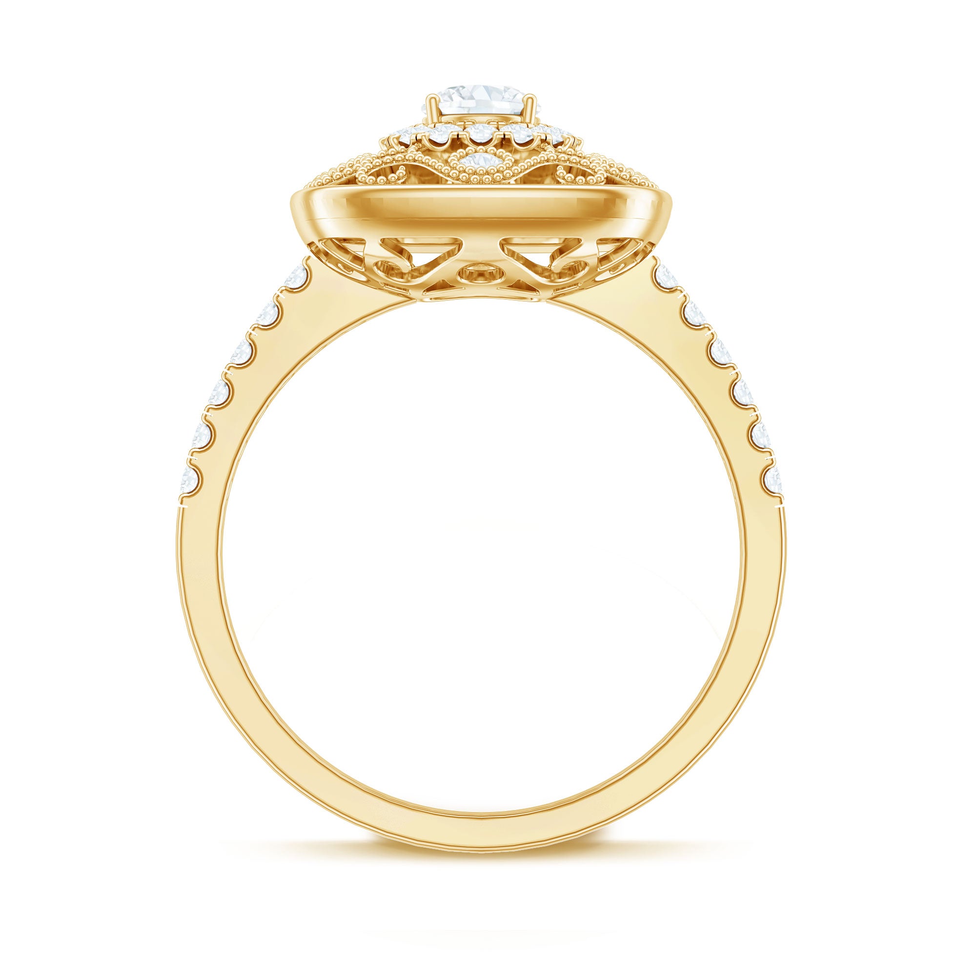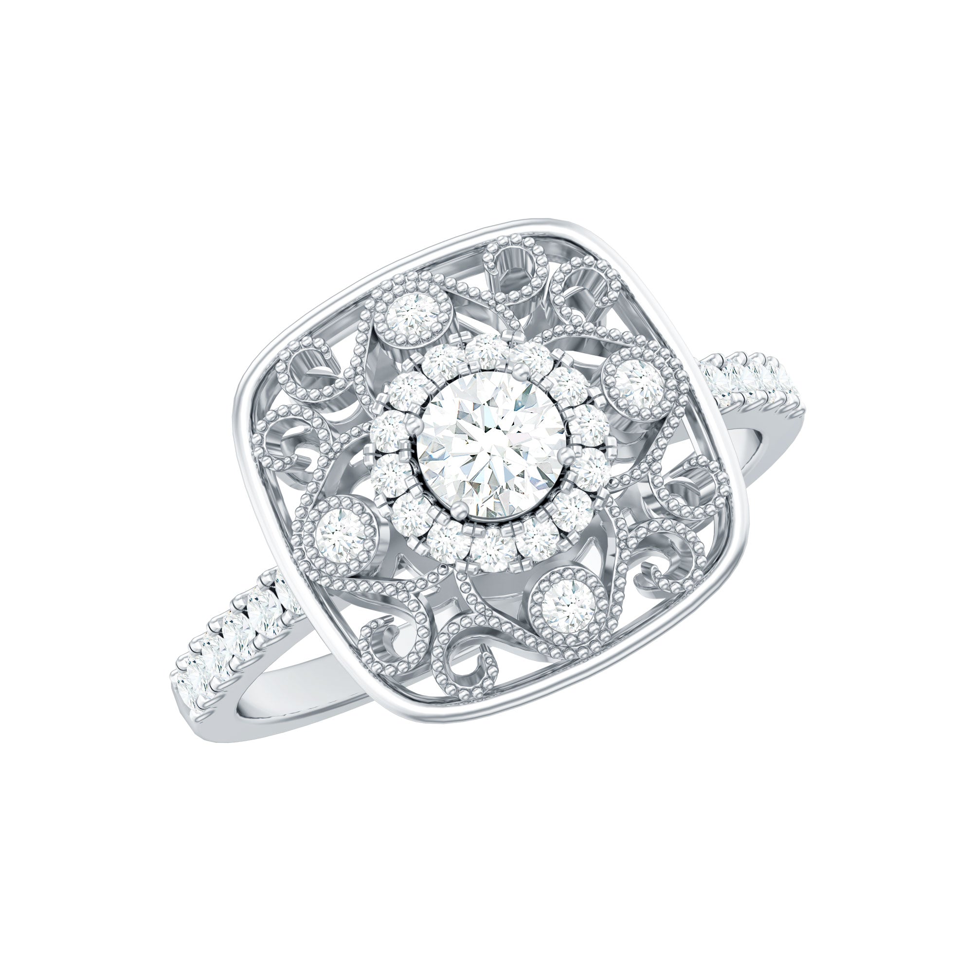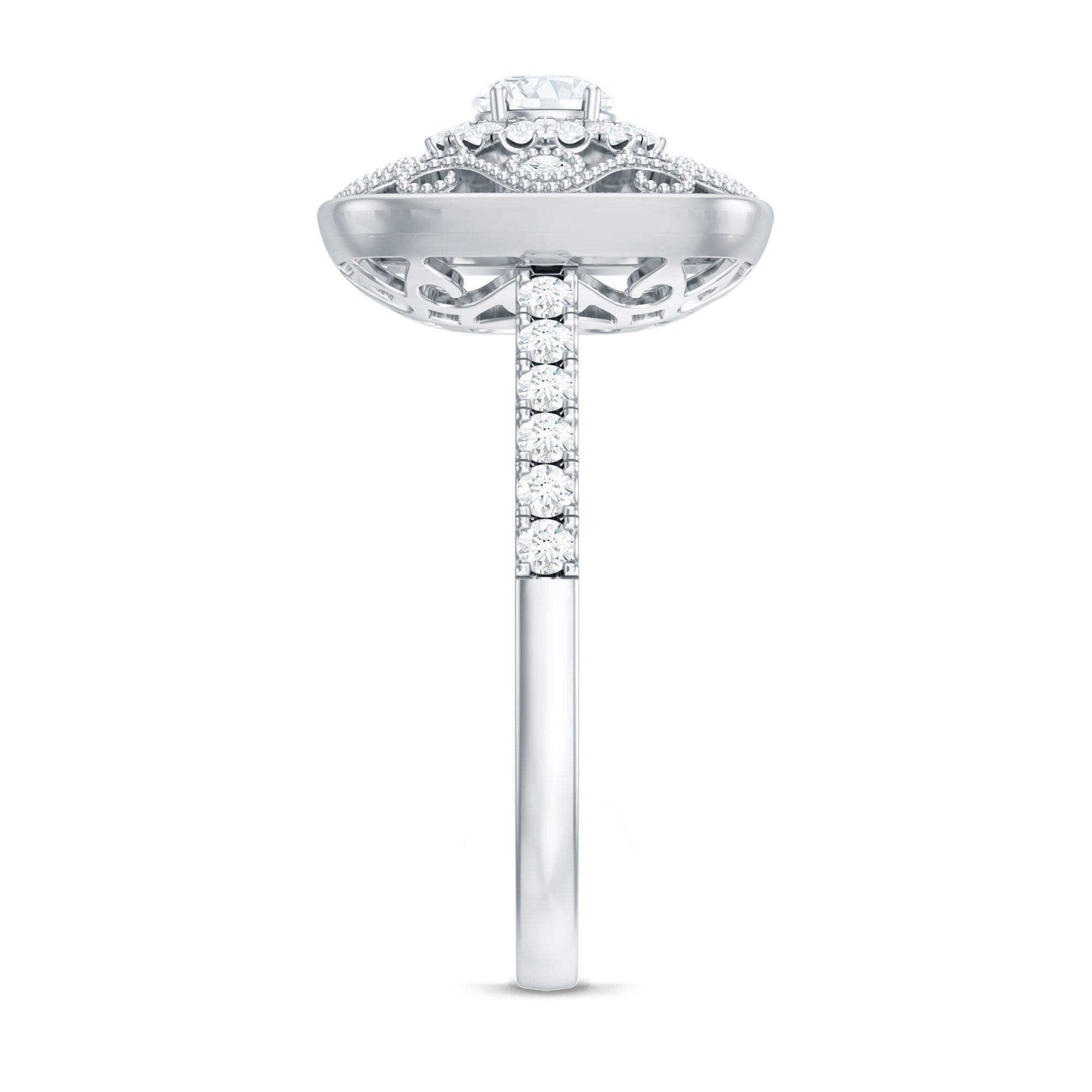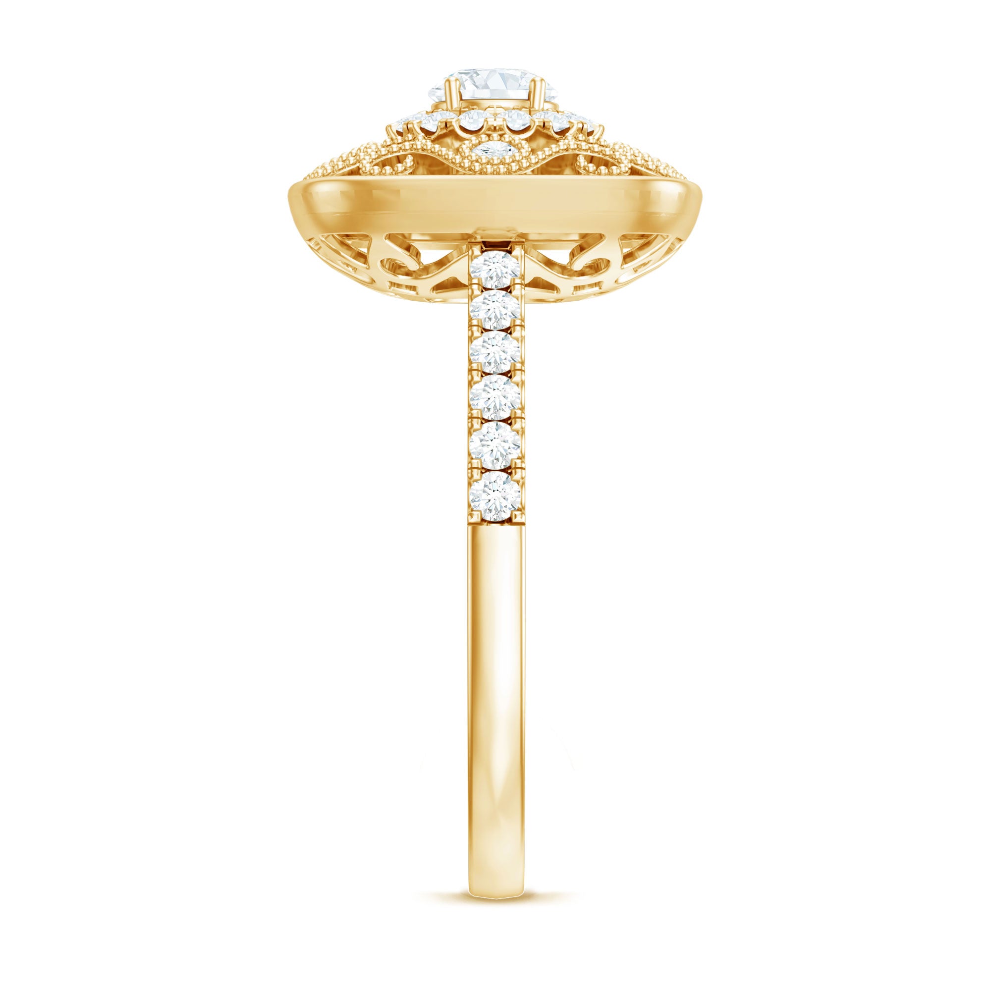 Ready to fall in love with something truly magical? This vintage-inspired Moissanite Engagement Ring gives all the old-school charm with a modern twist. It is designed to totally steal the show, and your heart - with a round cut moissanite sitting pretty right at the center, held securely in prong setting. Surrounding it is delicate beaded detail that creates a vintage pattern and a stunning arrangement of smaller stones that make the whole thing shine from every angle. The band is just as dreamy, with extra moissanite stones sparkling down the sides, because who doesnt love a little extra shimmer? All the moissanite stones are of D-VS1 quality, so you are getting serious sparkle without compromising on clarity or ethics. What really sets this Antique Engagement Ring apart is its vintage art deco vibe - it is timeless, elegant, and seriously eye-catching. Whether you are proposing, upgrading your ring, or just treating yourself (you deserve it), this piece adds a bold, romantic touch to any look. And hey, you can totally make it your own – this Vintage Moissanite Ring is available in different metal colors and purity options, so you can pick the one that feels just right for your style. Basically, it is not just a ring - it is a whole vibe. Classic, classy, and full of sparkle.