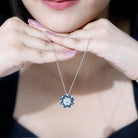 Adorn your neck with this Moissanite Pendant Necklace that is precisely crafted with 14K White Gold Plated Silver. The pendant features an 8 MM Round Shape Moissanite Securely placed in Prong Setting, which is beautified with Round Shape Moissanite and Marquise Shape London Blue Topaz. This Floral Pendant beholds the classic shine of D-VS1 Quality Moissanite and AAA Quality London Blue Topaz. This pendant dangles in a cable chain which makes it perfectly sit on the neckline and completes the look. This Moissanite Pendant and Chain will be delivered in a velvet pouch for safe and dust-free storage, along with the certificate of authenticity.