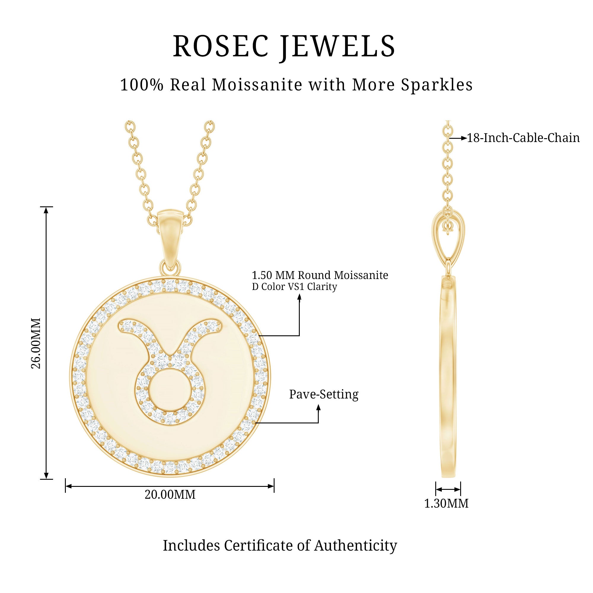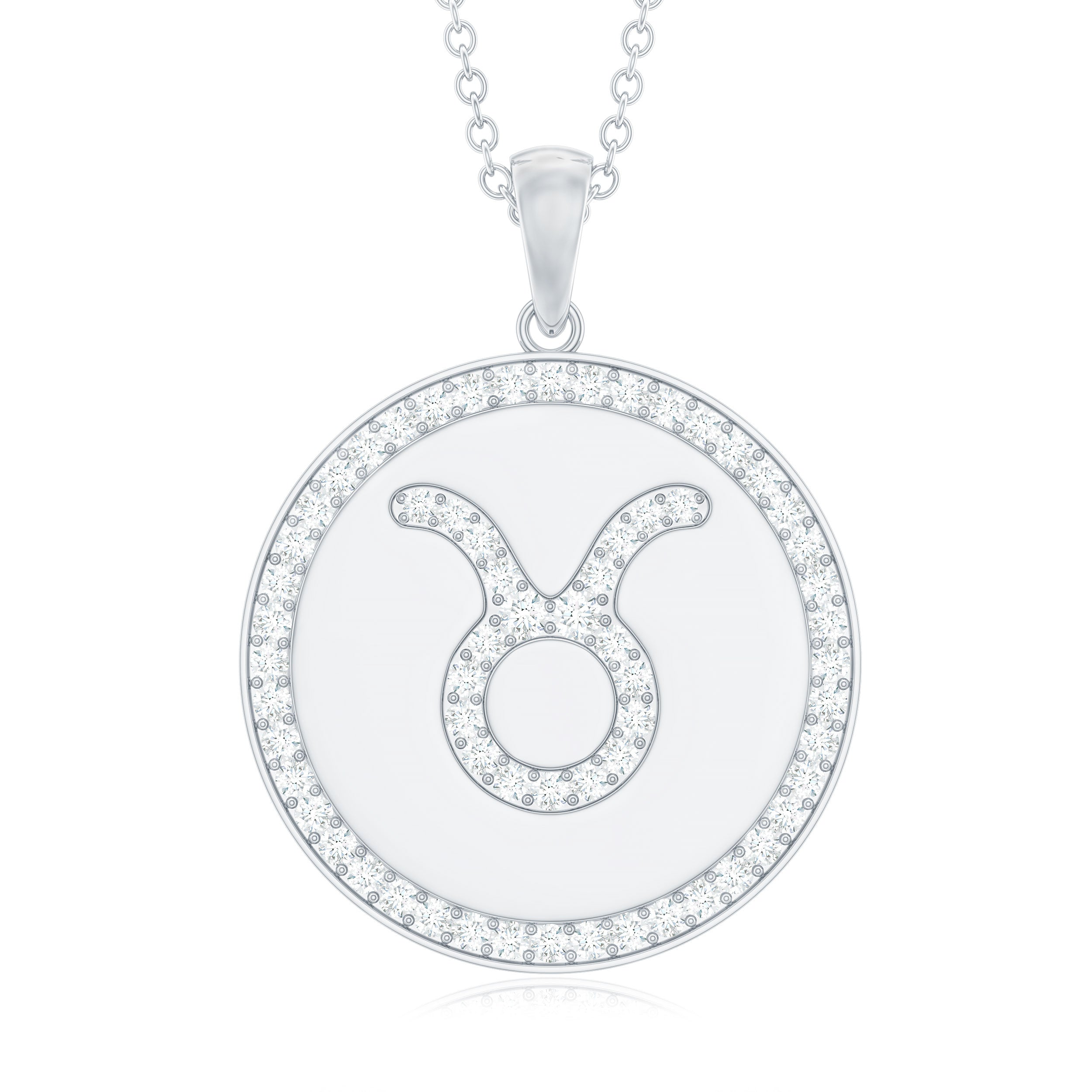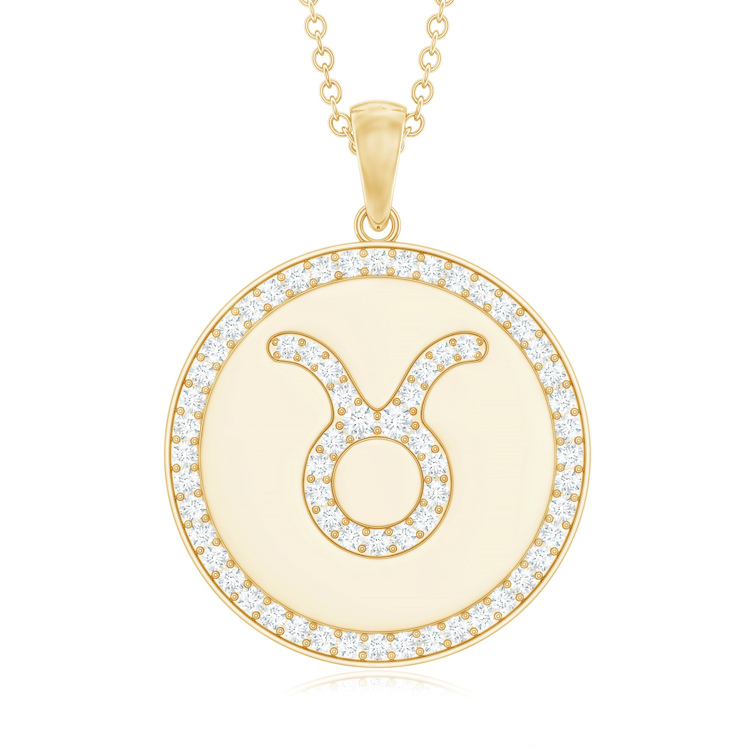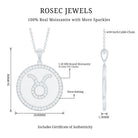 Take on the world wearing this Zodiac Disc Pendant embellished with Round Cut Moissanite in Pave Setting arranged in the pattern of Taurus Zodiac symbol. This Moissanite Zodiac Pendant has been intricately crafted in hallmarked metal, making for a flattering accessory for all the May borns out there.