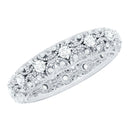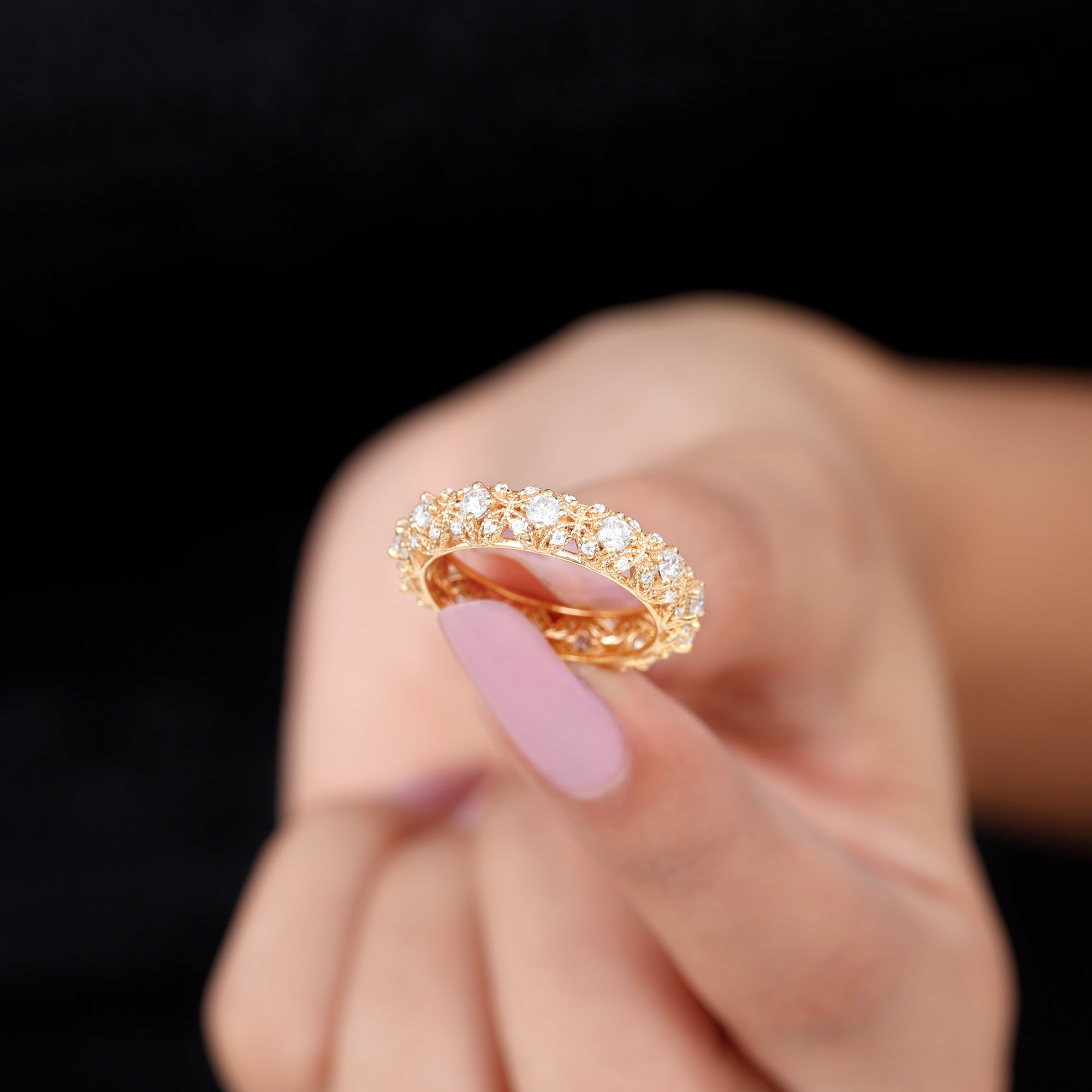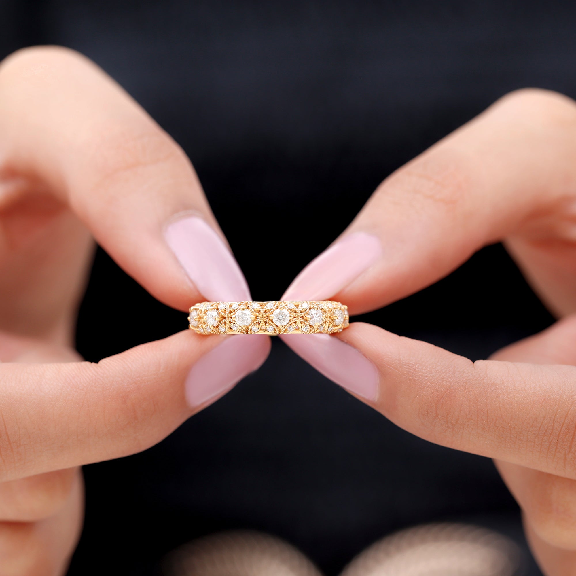 Celebrate love and heritage with this Vintage Inspired Wedding Band, a timeless piece that beautifully blends old-world artistry with modern brilliance. Designed to evoke the elegance of antique heirlooms, this intricately crafted band features a stunning arrangement of round cut Moissanite stones, each nestled within floral motifs and surrounded by delicate beaded detailing for that distinct vintage charm. The detailed pattern flows continuously around the band, symbolizing eternal love and unity. Each sparkling Moissanite reflects the light with unmatched fire and brilliance, offering a luxurious feel. Whether worn alone or stacked with other bands, this Moissanite Wedding Band adds a layer of sophistication to any jewelry collection. Ideal for celebrating weddings, anniversaries, or simply as a meaningful gift to mark a lifelong promise, this Antique Eternity Band is made to be cherished for generations. Thoughtfully designed in a range of sizes to ensure the perfect fit, it arrives in an elegant jewelry box, ready to tell your love story.