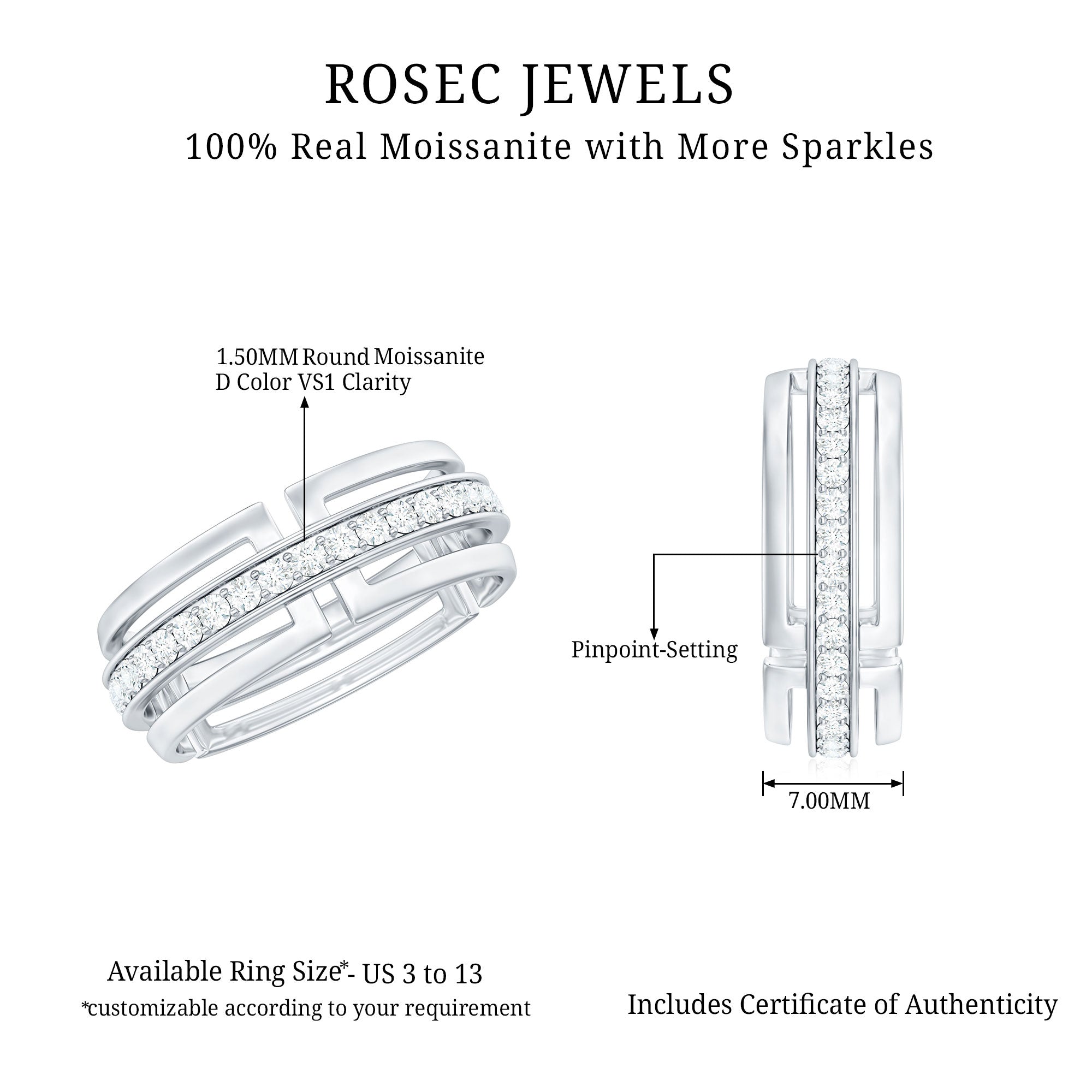 Bold and timeless, this Unisex Wedding Band is designed for those who appreciate modern elegance with a statement-making edge. Featuring a wide, structured design, this Thick Band is both striking and versatile - perfect as a wedding band, anniversary ring, or simply a meaningful piece of jewelry. At the center of the band, a single row of brilliant round moissanite stones is meticulously set in secure pinpoint setting, offering a continuous sparkle that catches the light from every angle. These stones are known for their exceptional fire and brilliance, adding a refined touch to the geometric design. The Anniversary Band itself is crafted with clean lines and open structure, giving it an architectural appeal that balances strength with sophistication. This contemporary detailing adds depth and dimension to the piece while maintaining a smooth, comfortable fit. Designed to suit all genders, this Moissanite Wedding Band offers a perfect blend of durability, style, and symbolism. This Gender Neutral Wedding Band is a powerful symbol of love, commitment, and modern craftsmanship.