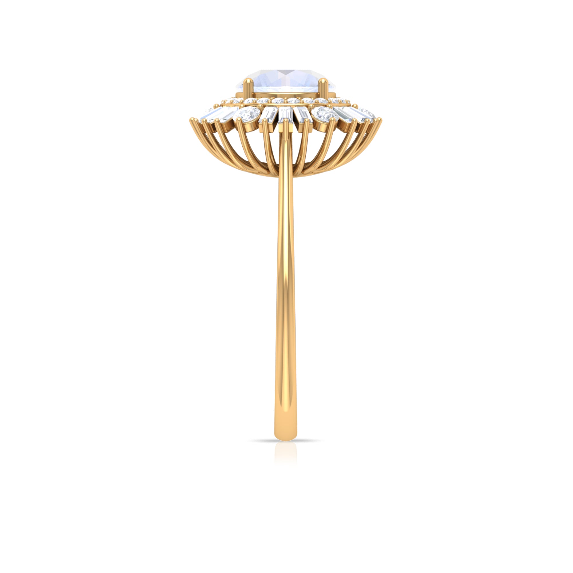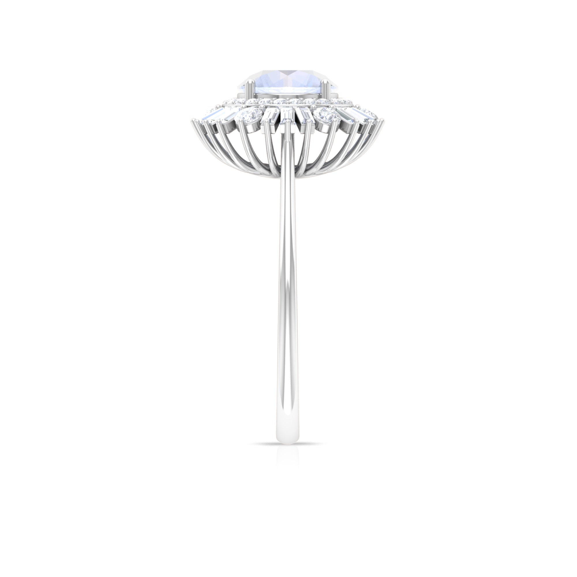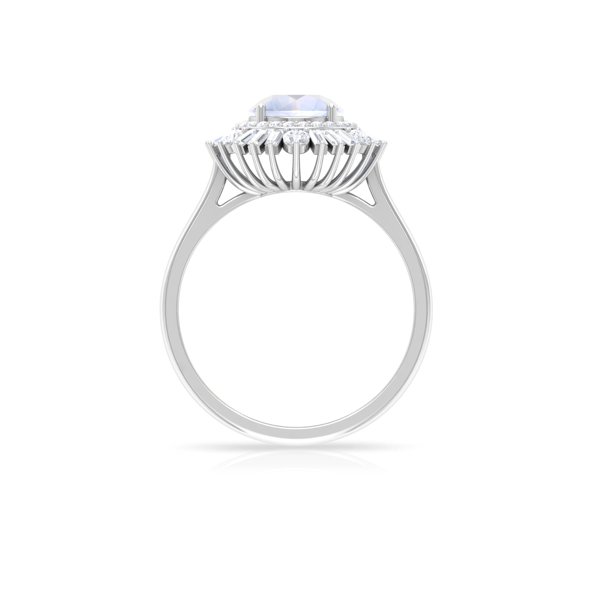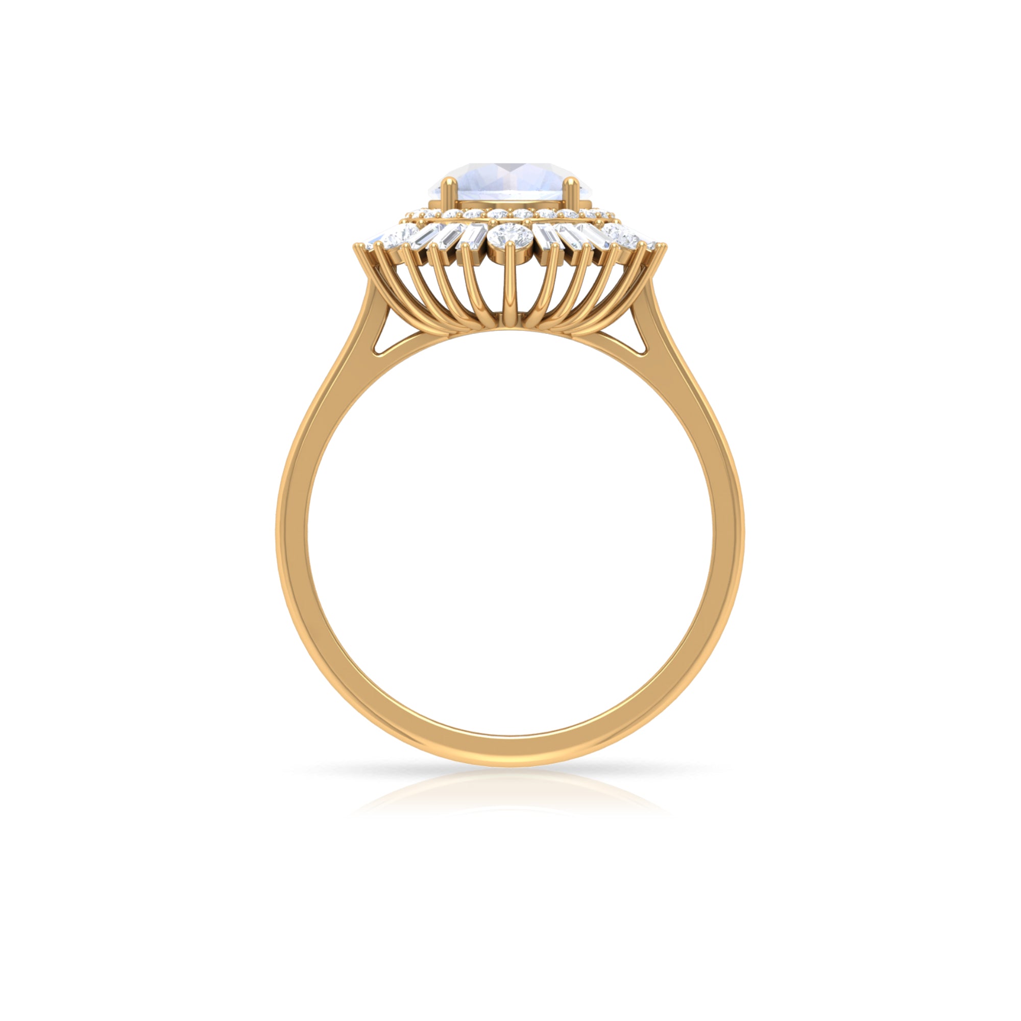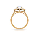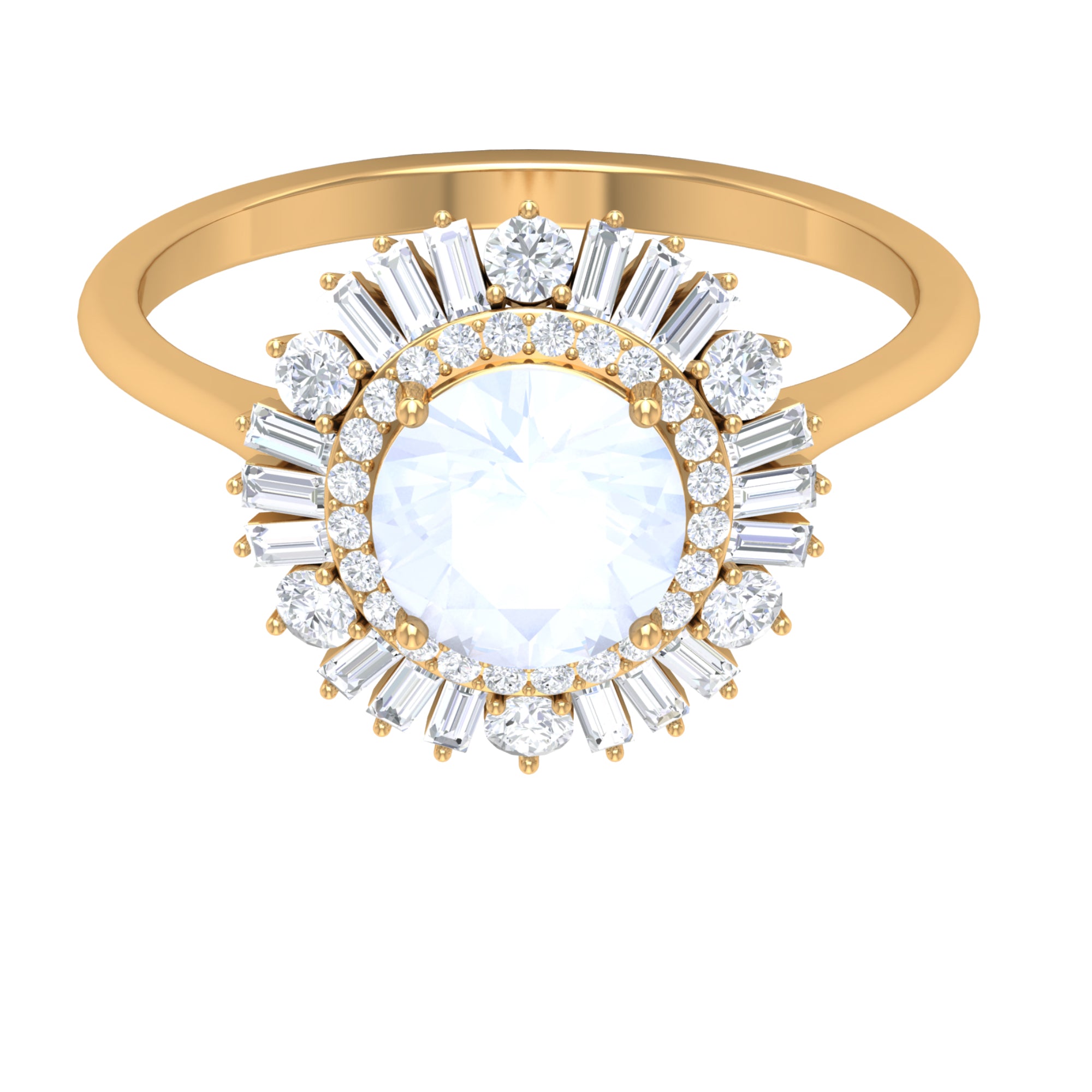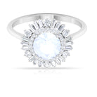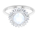 This Double Halo Engagement Ring is perfect as proposal ring. It is crafted in Solid Gold and adorned with a sparkling 7 MM Round Shape Moonstone in claw setting encircled beautifully with Round and Baguette Cut Moissanite studded as Double Halo. Moonstone Engagement Ring will be a unique choice for your partner.