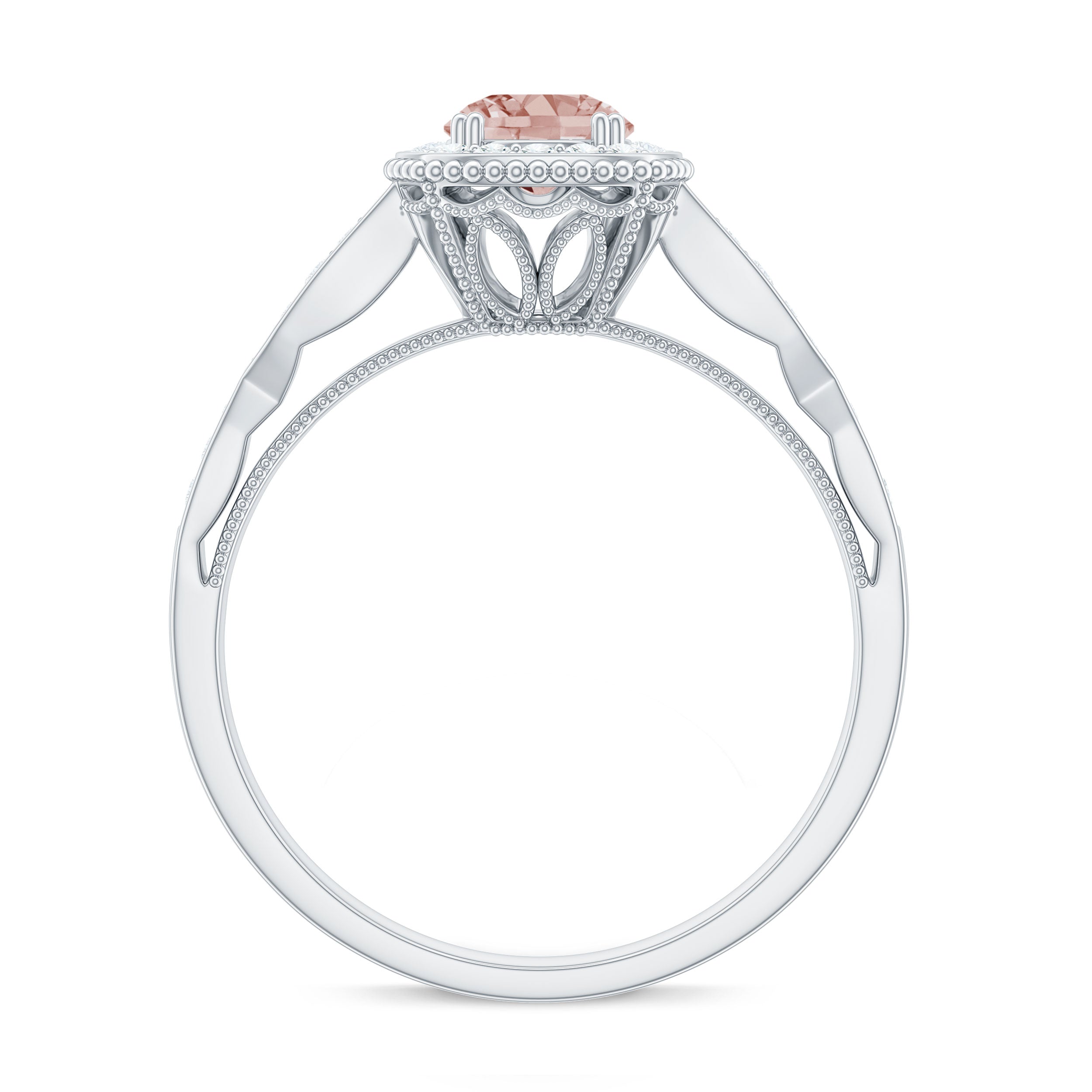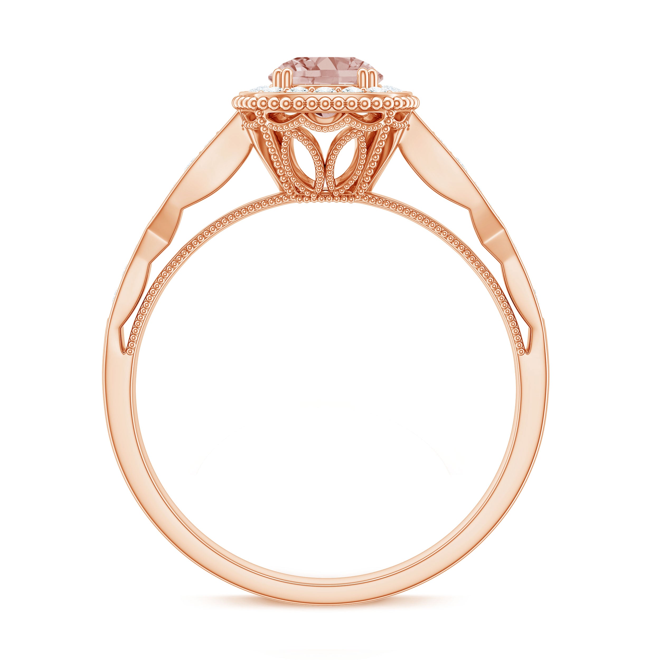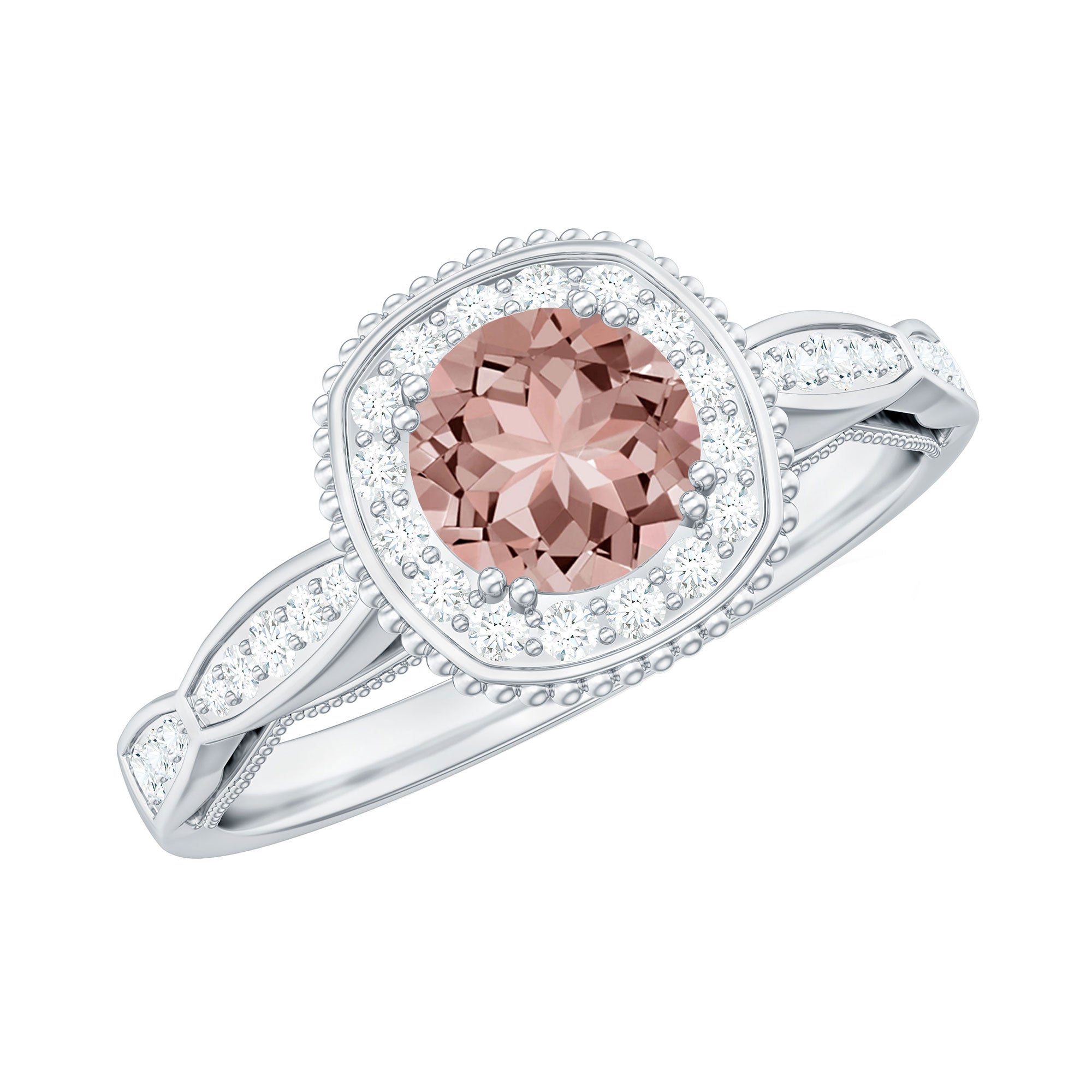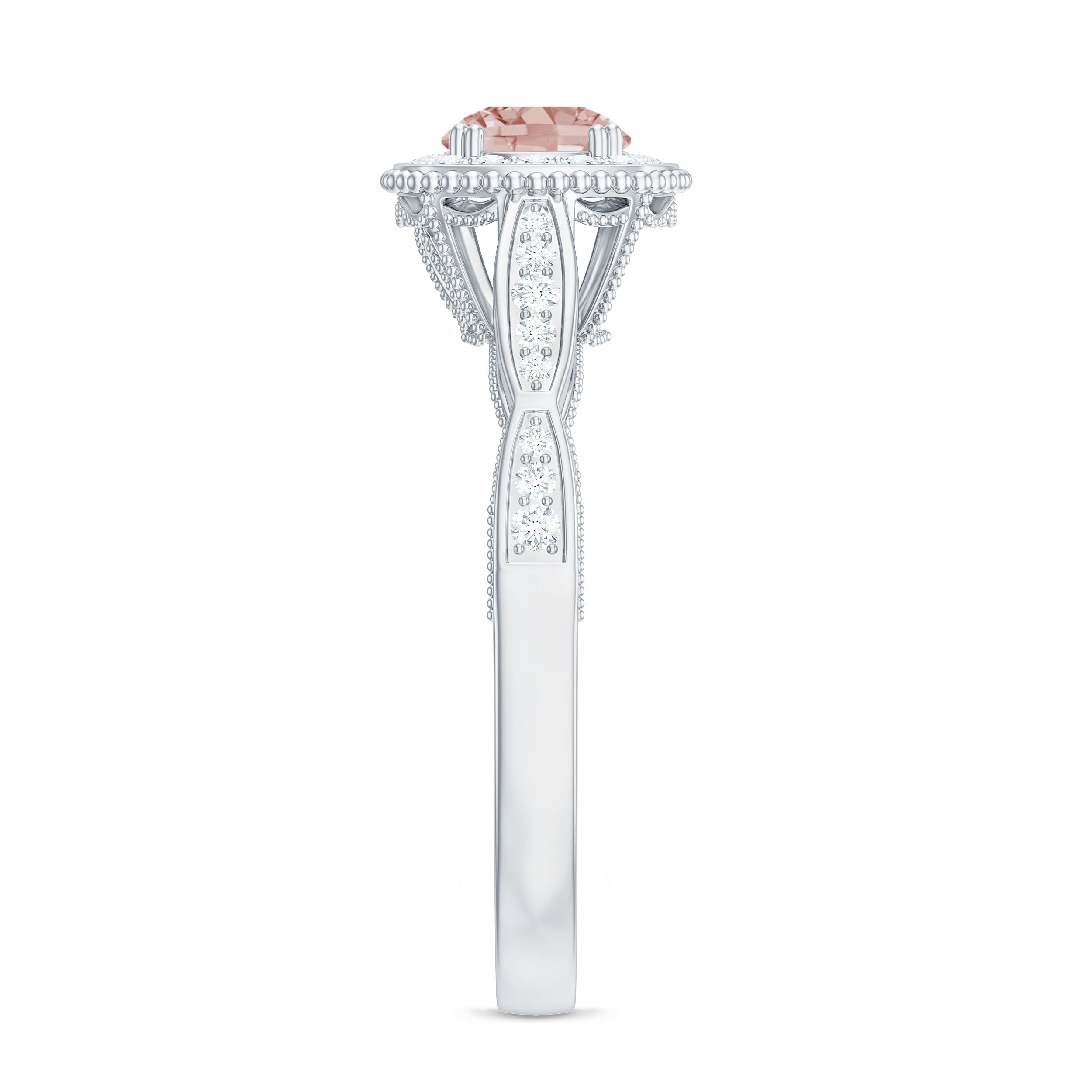 A timeless love story deserves a ring thats just as enchanting. The Morganite and Diamond Vintage Engagement Ring is a sparkling masterpiece that will capture her heart and imagination. This vintage-inspired engagement ring has a beautifully designed round-shaped morganite in the center surrounded by a halo of Diamond stones. This ring is perfect for a woman who loves classic style with a modern twist. Its also a great choice for couples who are looking for a unique and affordable engagement ring.
