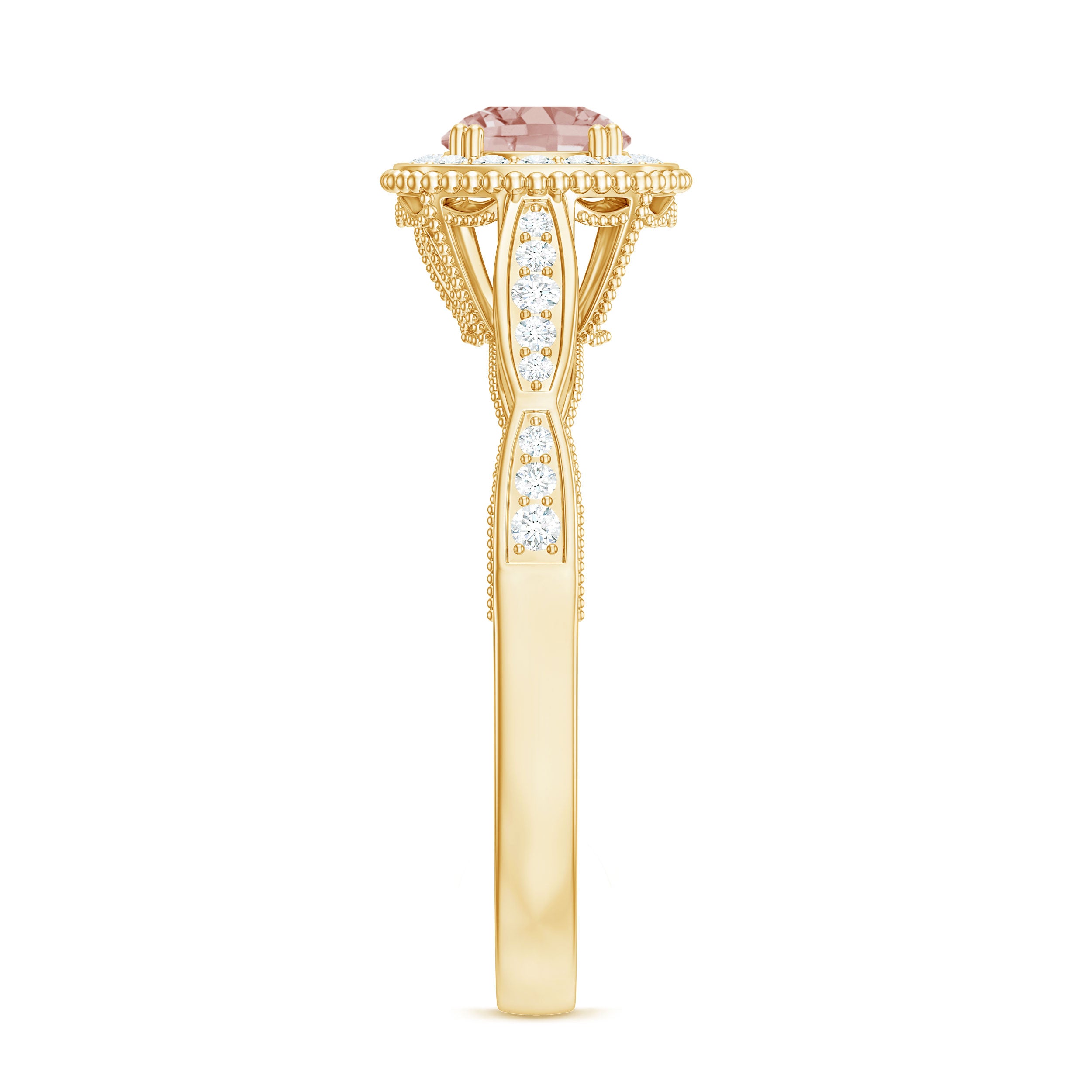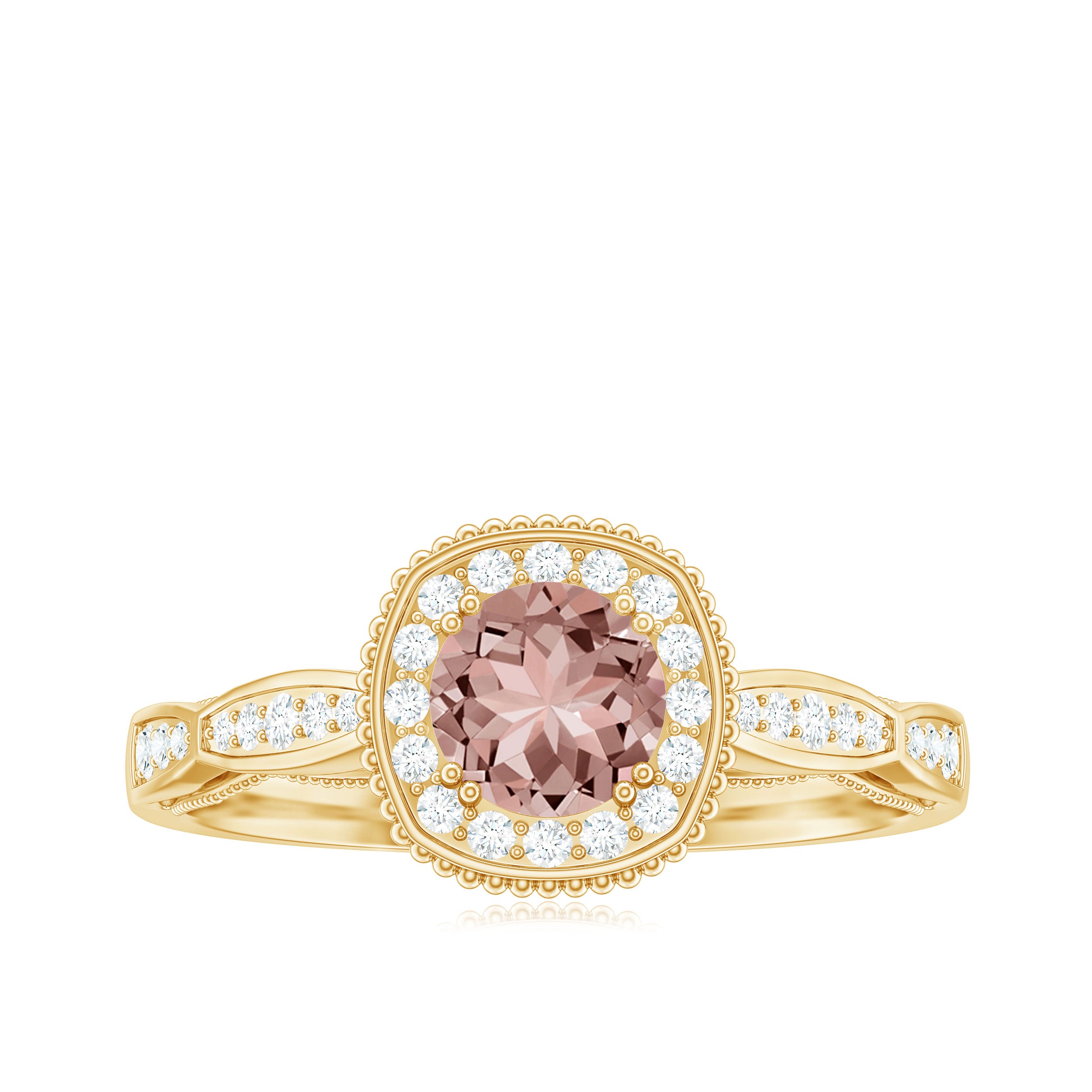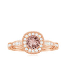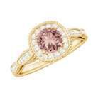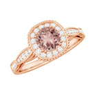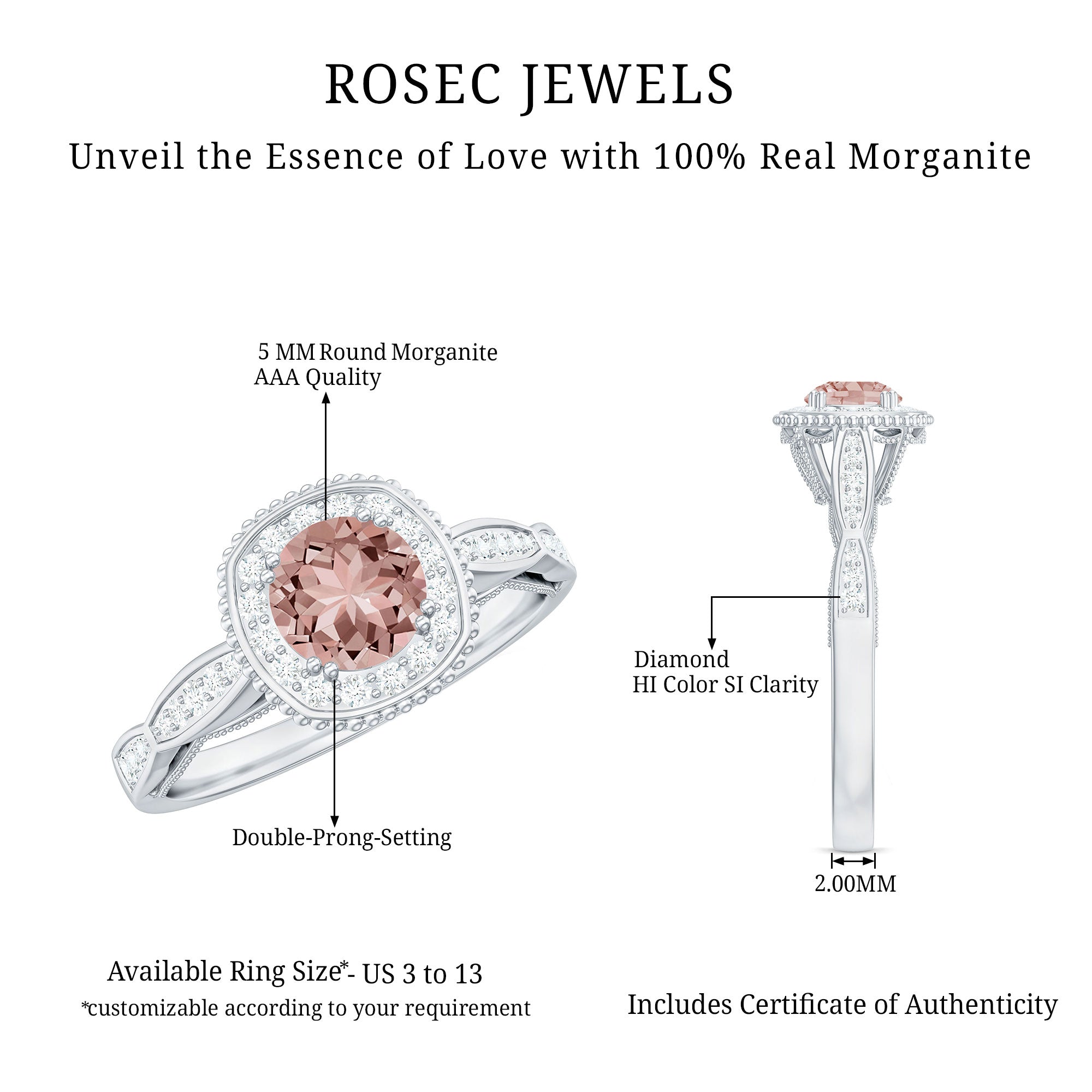 A timeless love story deserves a ring thats just as enchanting. The Morganite and Diamond Vintage Engagement Ring is a sparkling masterpiece that will capture her heart and imagination. This vintage-inspired engagement ring has a beautifully designed round-shaped morganite in the center surrounded by a halo of Diamond stones. This ring is perfect for a woman who loves classic style with a modern twist. Its also a great choice for couples who are looking for a unique and affordable engagement ring.