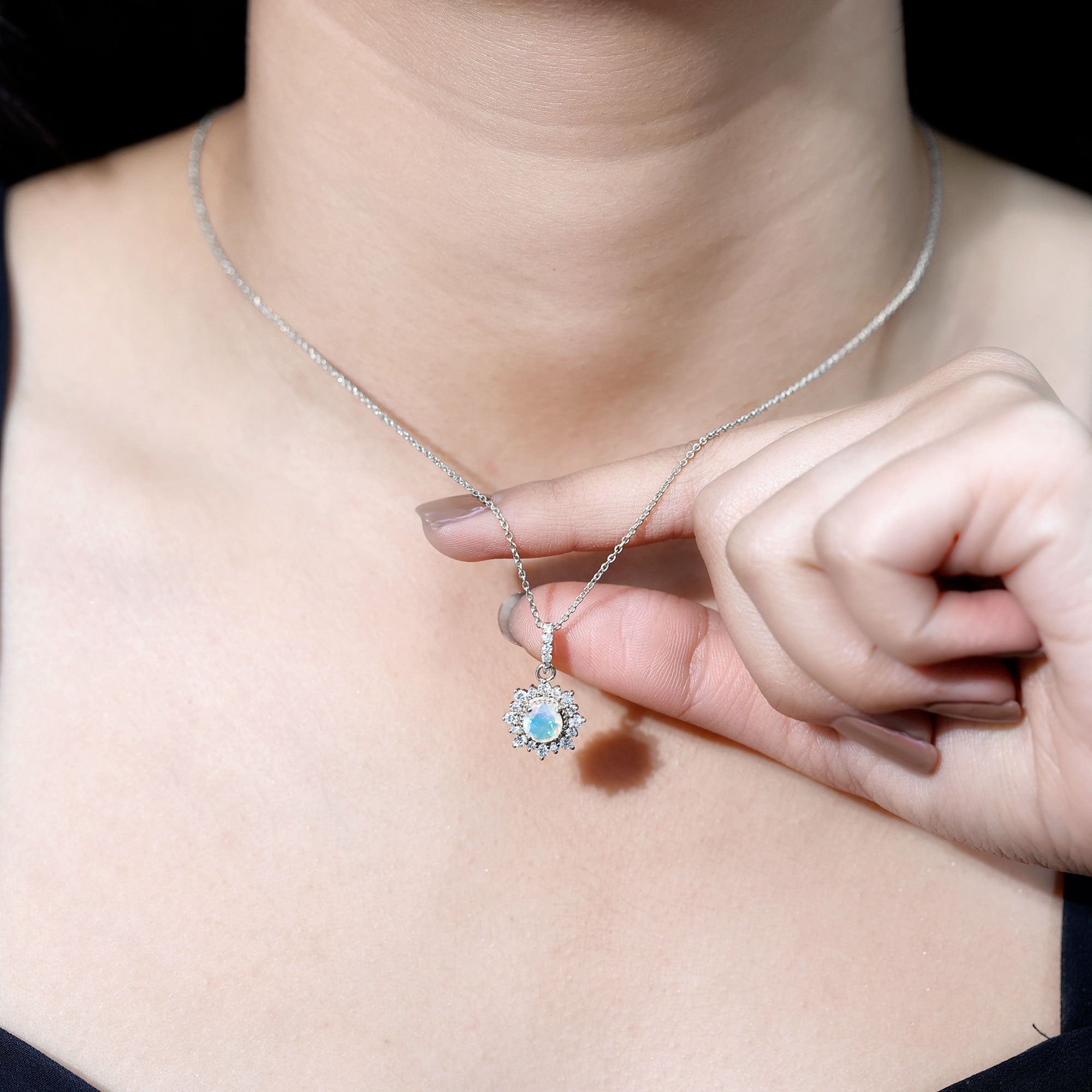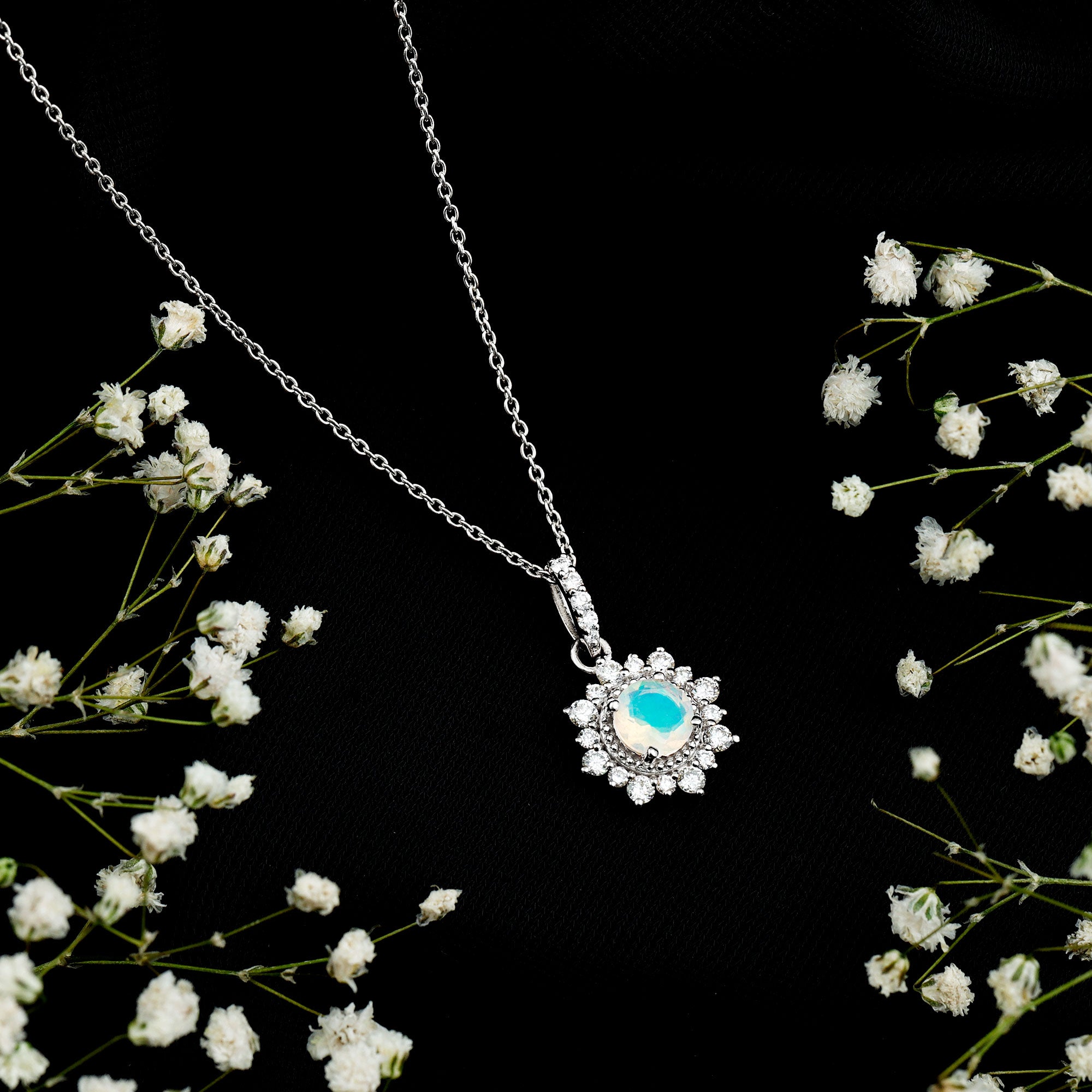 Classic yet captivating, this Ethiopian Opal Pendant Necklace brings a soft glow and refined sparkle to your everyday style. At its center rests a stunning 6 mm Round Shape Ethiopian Opal, alive with flashes of rainbow color that dance beautifully in the light. The AAA Quality Opal is framed with Beaded detailing, adding texture and a vintage inspired charm that makes the design truly special. Surrounding the center stone is a shimmering Diamond Halo, carefully set to enhance the natural beauty of Opal and create a radiant finish. Even the Bail is adorned with tiny Diamond stones, offering extra brilliance from top to bottom. This Opal and Diamond Necklace is perfect for those who appreciate timeless elegance with a modern twist. Its gentle play of colors makes it easy to pair with both simple daytime outfits and evening attire, adding just the right touch of glow without overpowering your look. Thoughtful and versatile, this Real Opal Necklace also makes a meaningful gift for birthdays, anniversaries, or memorable milestones. Each necklace comes beautifully arranged in a jewelry box, ready for gifting. Graceful, luminous and effortlessly stylish, this Womens Opal Necklace is designed to be treasured for years to come.