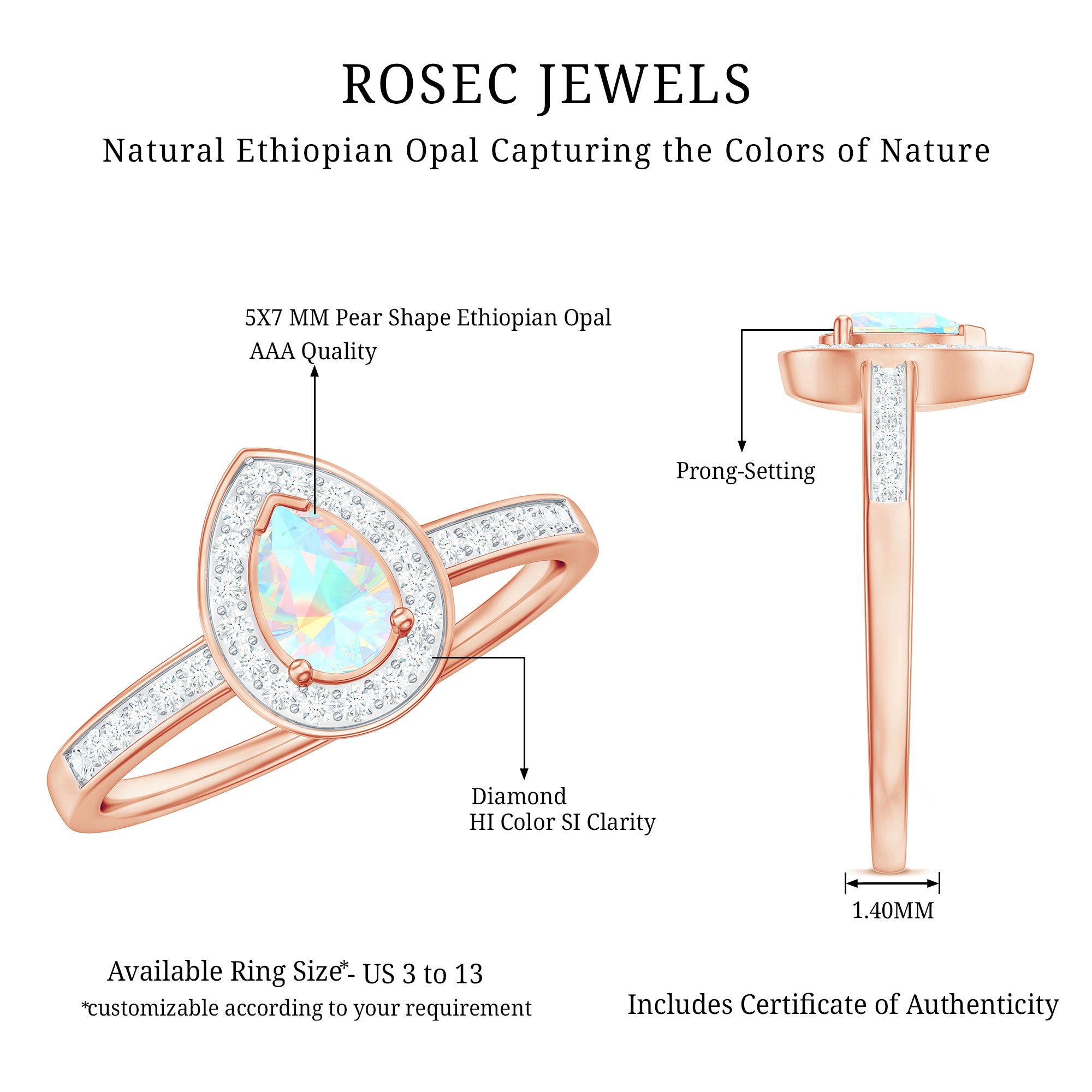Unveil the magic of your love with this Teardrop Engagement Ring, a captivating masterpiece that speaks to the heart. The stunning 5X7 mm Pear Shaped Ethiopian Opal set in Prong Setting, with its ethereal play of color that captures the essence of every emotion and every moment shared. Set in the delicate embrace of a sparkling Diamond Halo, the AAA Quality Opal is beautifully enhanced by Side Stones that add an extra layer of brilliance, making this Opal and Diamond Engagement Ring a celebration of its uniqueness. The Teardrop Shape evokes the beauty of fleeting moments, yet this piece is destined to last forever, just like the bond it represents. Perfect for those who seek something beyond the ordinary, this Pear Shaped Engagement Ring with Opal blends timeless elegance with a touch of modern romance. Whether you are marking a life-changing commitment or simply declaring your endless love, this Opal Halo Engagement Ring is the perfect expression of devotion.