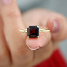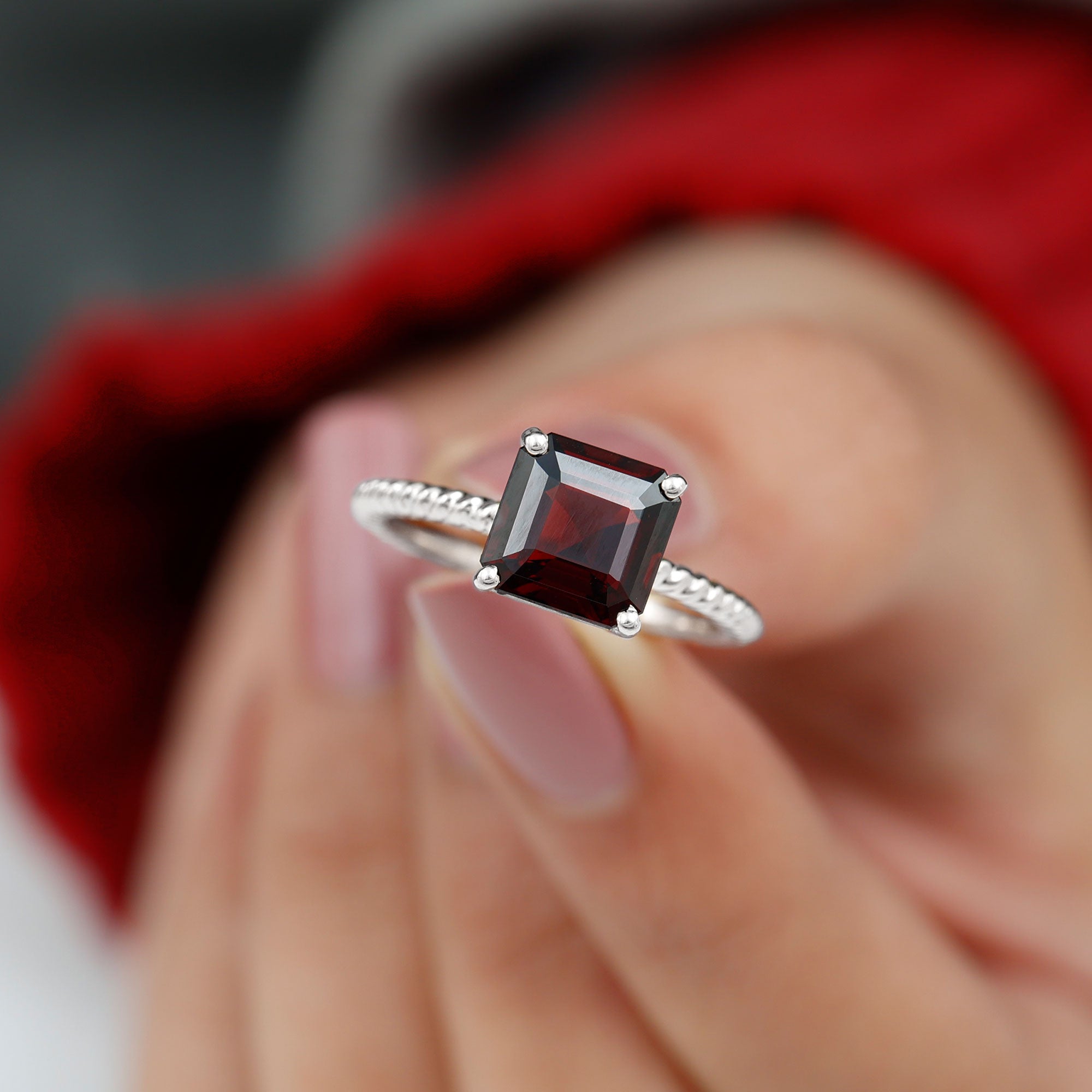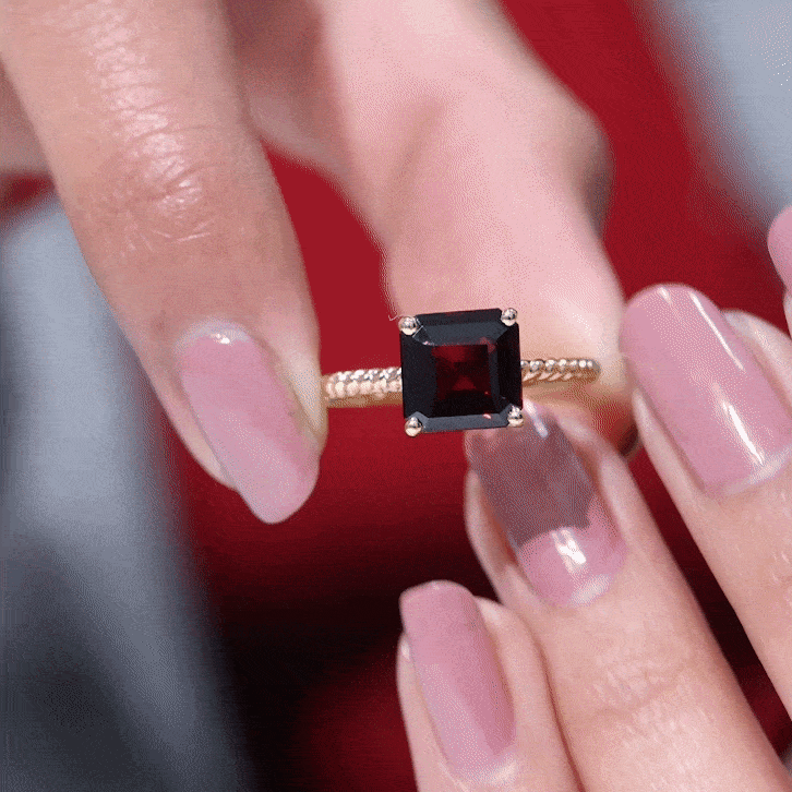 Embrace a love that feels timeless with this enchanting Asscher Cut Engagement Ring, thoughtfully designed to capture the depth and warmth of your forever story. The rich red hue of the Prong Set 8 mm Asscher Cut Garnet glows with romantic intensity, symbolizing passion, devotion and a bond that grows stronger with time. Its Asscher Cut adds a captivating sparkle with every movement, drawing the eye straight to its stunning center. The band features an elegant Twisted Rope design, creating a beautiful representation of two lives intertwined. Crafted with care and available in a range of ring sizes, this Garnet Engagement Ring is made to fit perfectly for that once-in-a-lifetime moment. Whether you are planning a heartfelt proposal or surprising your partner with a meaningful gift, this Solitaire Engagement Ring with Garnet brings emotion and elegance together. It arrives in a signature jewelry box, ready to make every part of the moment unforgettable.