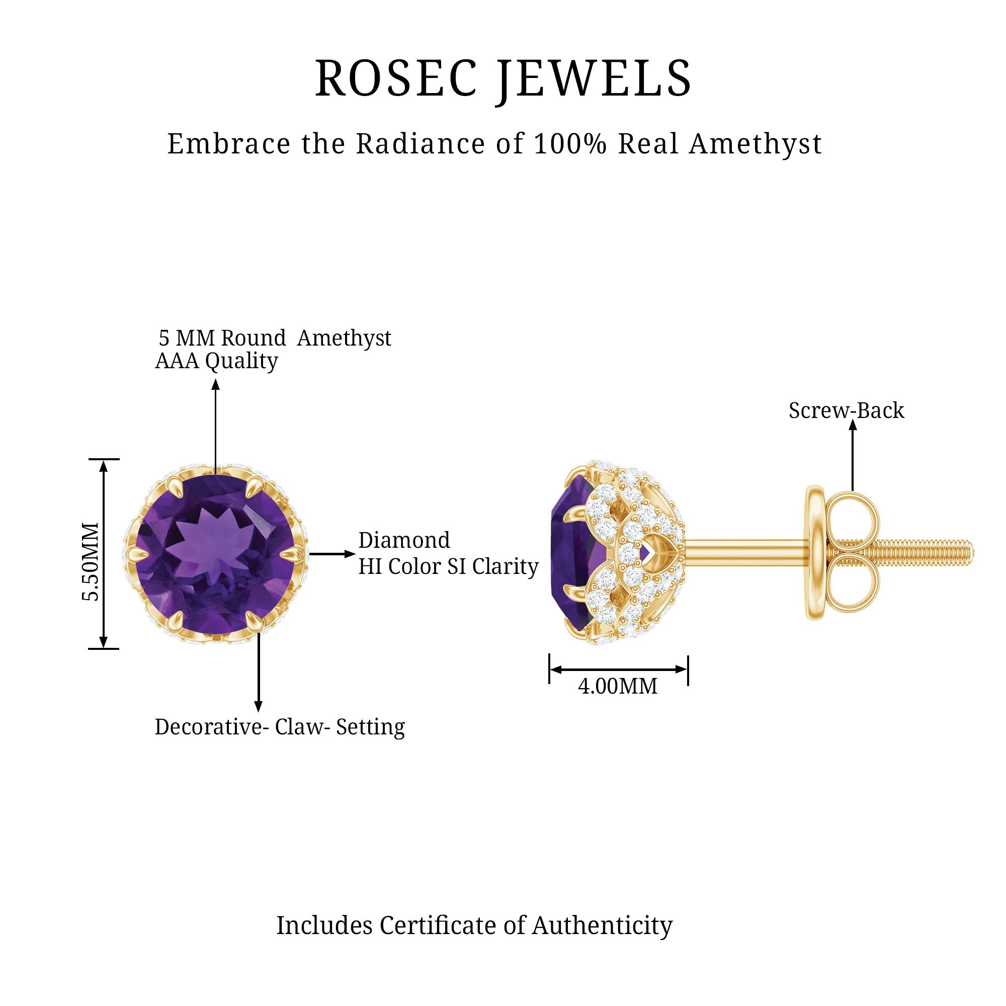 Mesmerize her by presenting these breathtaking Amethyst Stud Earrings, a perfect fusion of romance, elegance and timeless charm. These Fine Earrings feature a 5 mm Round Shape Amethyst gemstone set in 6 Claw Prong Setting, its deep violet glow symbolizing serenity, love and spiritual balance. Beneath the center stone, a delicate flower like design unfolds, intricately studded with sparkling Diamond stones that add a graceful brilliance to the piece. Finished with a secure Screw Back Closure, these Amethyst Diamond Earrings offer both luxury and comfort, making them perfect for daily wear or special occasions. Whether paired with an elegant dress or a casual ensemble, these Amethyst Ear Studs bring a touch of sophistication that enhances every style effortlessly. Presented in an elegant jewelry box, these Amethyst Studs make a heartfelt gift for anniversaries or birthdays.