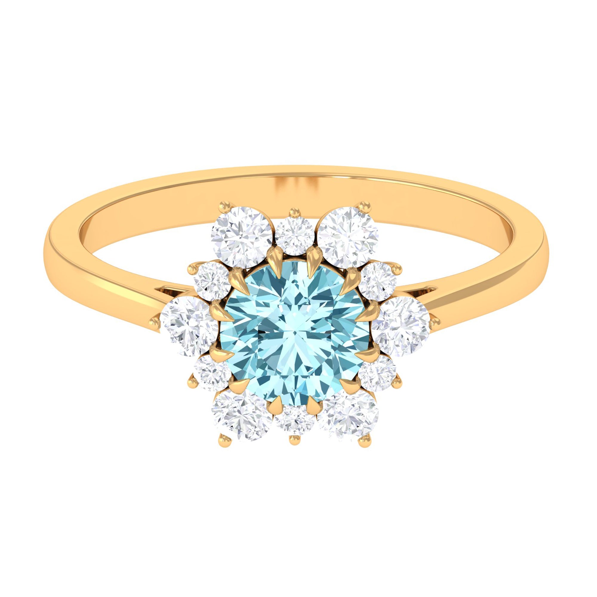 Exude grace with this elegant Classic Aquamarine Ring, showcasing Round Shape Aquamarine in a Claw Setting with a Diamond Halo. This Halo Engagement Ring exudes luxury and allure, making it a truly captivating piece.