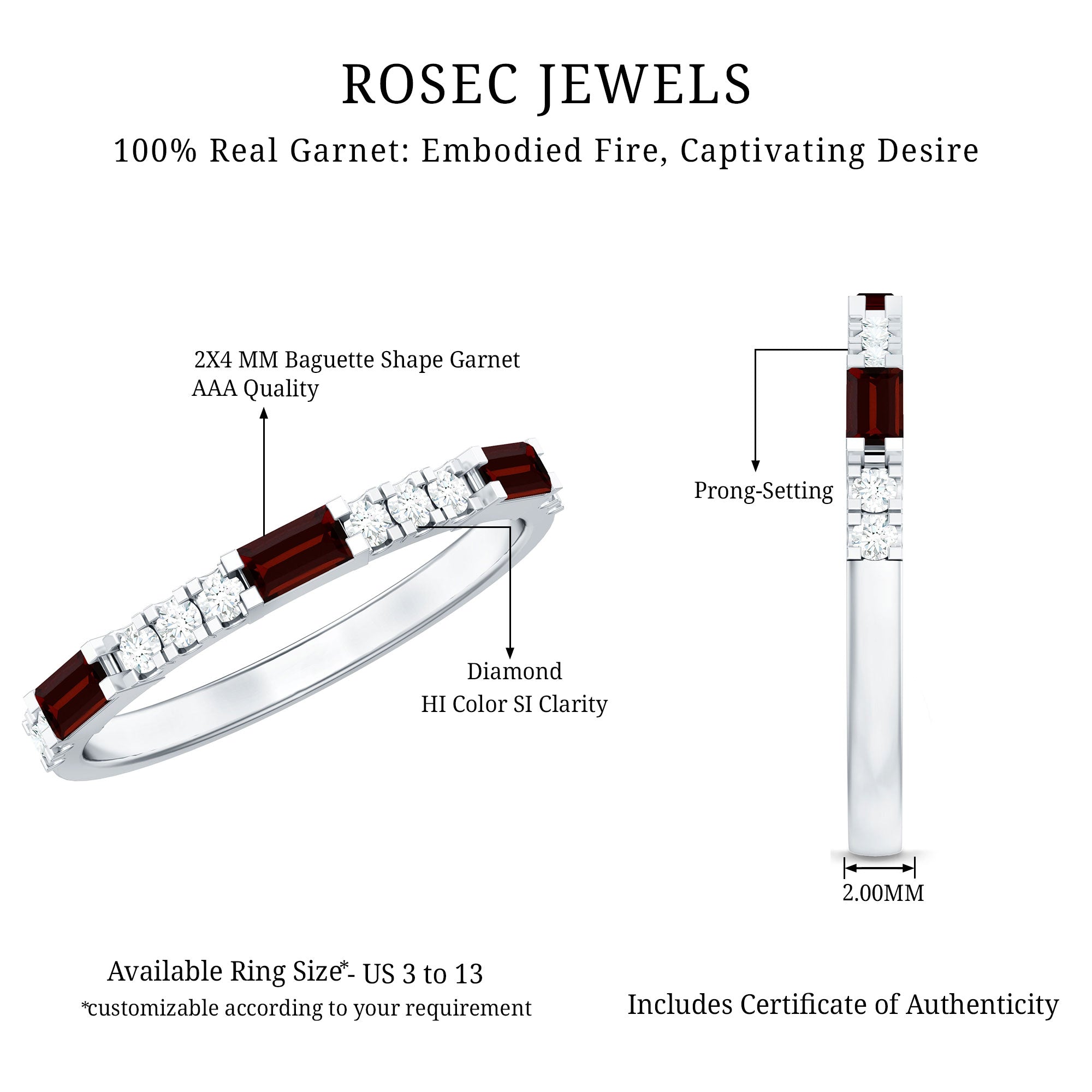 Destined to dazzle and capture hearts, this Half Eternity Ring in an elegant East West style is a radiant celebration of love and sophistication. Each 2X4 mm Baguette Shape Garnet is set horizontally in Prong Setting to create a modern and unique rhythm of deep red brilliance, perfectly balanced with shimmering Round Shape Diamond stones that add a touch of timeless sparkle. The contrast between the AAA Quality Garnet and HI-SI Diamond stones tells a story of two souls, distinct yet beautifully connected. Designed with a contemporary twist, the East West arrangement enhances the graceful flow of band, making this Garnet Diamond Ring an eye-catching piece that stands out from every angle. Whether worn as an anniversary ring, a promise band or a daily reminder of love, this Baguette Eternity Ring embodies elegance with meaning. Handcrafted with perfection, this Garnet Eternity Ring is comfortable and full of emotion. Available in various ring sizes, this Red Garnet Ring is destined to shine forever.