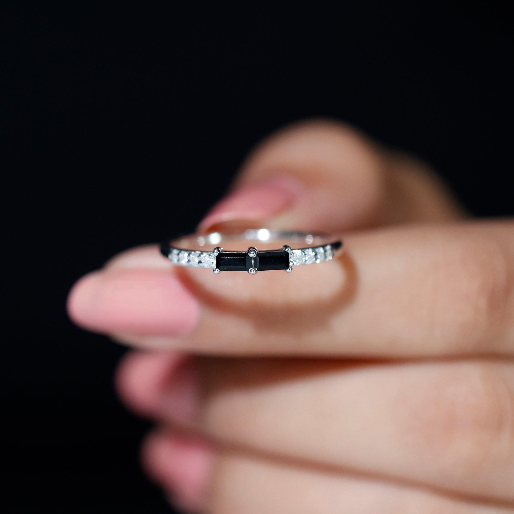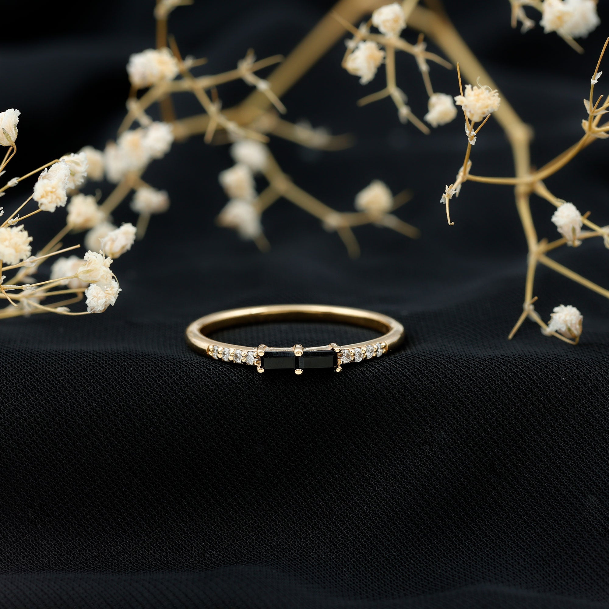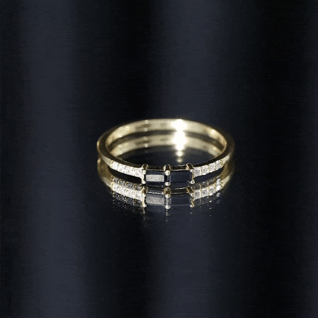 Simple and stylish, this Black Onyx Stackable Ring is a perfect choice for everyday elegance. Designed with a modern look, it features two baguette cut black onyx stones set in an east-west style in secure prong setting. On each side of the onyx, small round diamonds add a soft touch of sparkle. The mix of bold black and delicate shine creates a beautiful contrast that makes the Minimalist Ring stand out. Crafted in high-quality metal, this Black Onyx Ring is both lightweight and durable. Its slim design makes it easy to wear alone for a minimalist look or stack with other rings to create your own personal style. Whether paired with plain bands or other gemstone rings, it adds a unique twist to any ring stack. This Black Onyx and Diamond Ring is a great option for anyone who loves simple jewelry with a bit of character. Available in multiple metal choices and ring sizes, it can be customized to suit your personal taste. Whether you wear it casually or for a special occasion, this Baguette Stackable Ring is sure to become a favorite. Perfect for treating yourself or gifting to someone special, it brings together classic style and subtle beauty in one elegant piece.