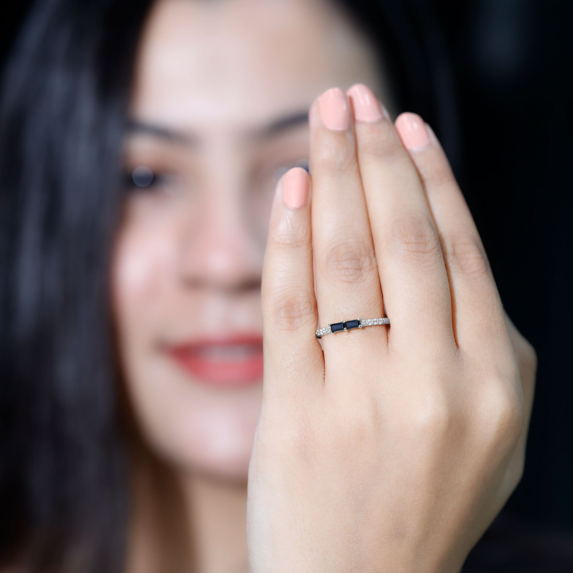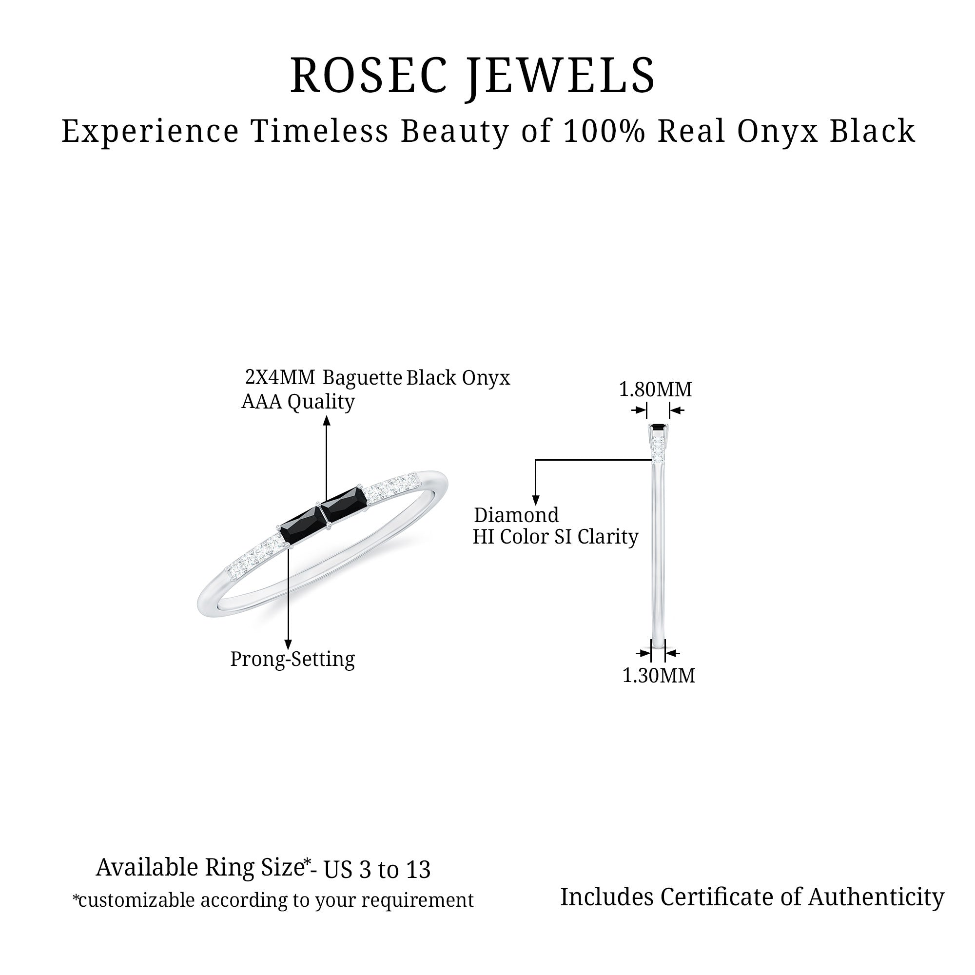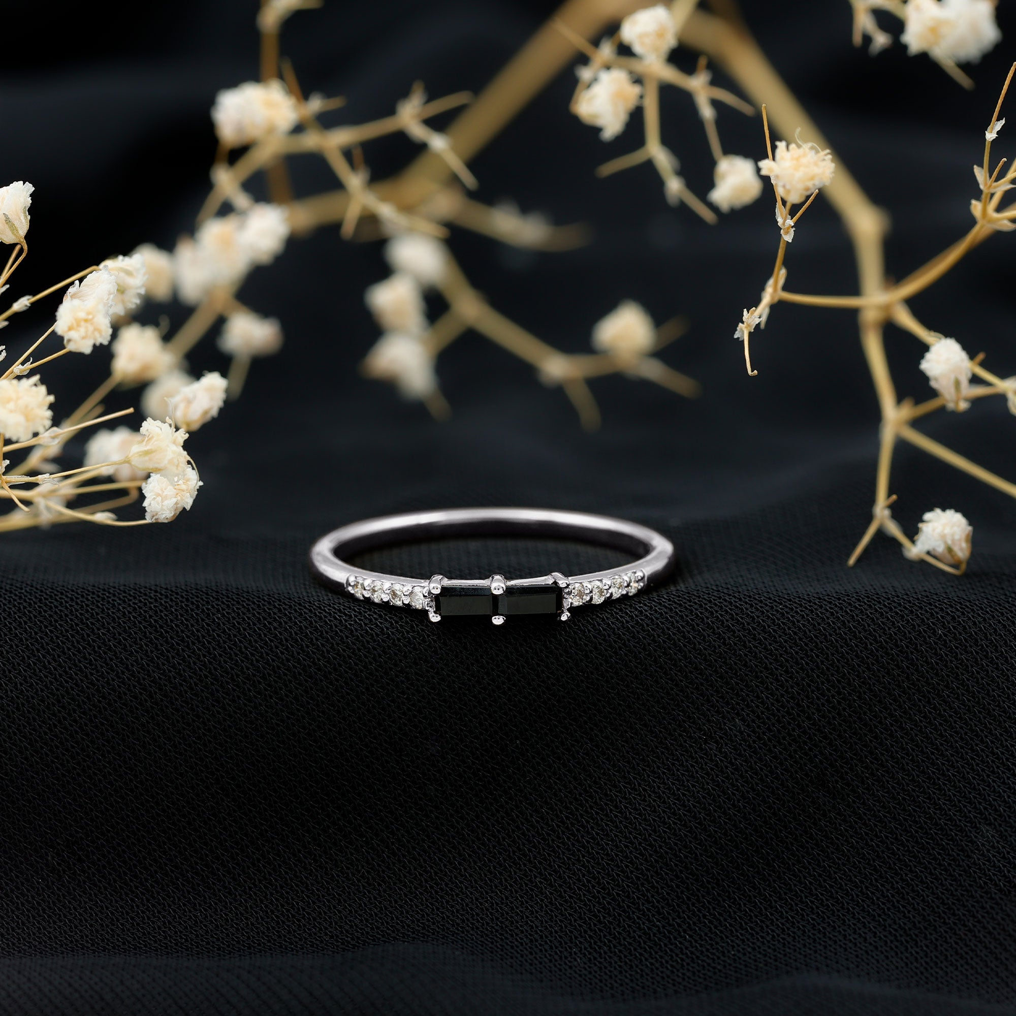 Simple and stylish, this Black Onyx Stackable Ring is a perfect choice for everyday elegance. Designed with a modern look, it features two baguette cut black onyx stones set in an east-west style in secure prong setting. On each side of the onyx, small round diamonds add a soft touch of sparkle. The mix of bold black and delicate shine creates a beautiful contrast that makes the Minimalist Ring stand out. Crafted in high-quality metal, this Black Onyx Ring is both lightweight and durable. Its slim design makes it easy to wear alone for a minimalist look or stack with other rings to create your own personal style. Whether paired with plain bands or other gemstone rings, it adds a unique twist to any ring stack. This Black Onyx and Diamond Ring is a great option for anyone who loves simple jewelry with a bit of character. Available in multiple metal choices and ring sizes, it can be customized to suit your personal taste. Whether you wear it casually or for a special occasion, this Baguette Stackable Ring is sure to become a favorite. Perfect for treating yourself or gifting to someone special, it brings together classic style and subtle beauty in one elegant piece.