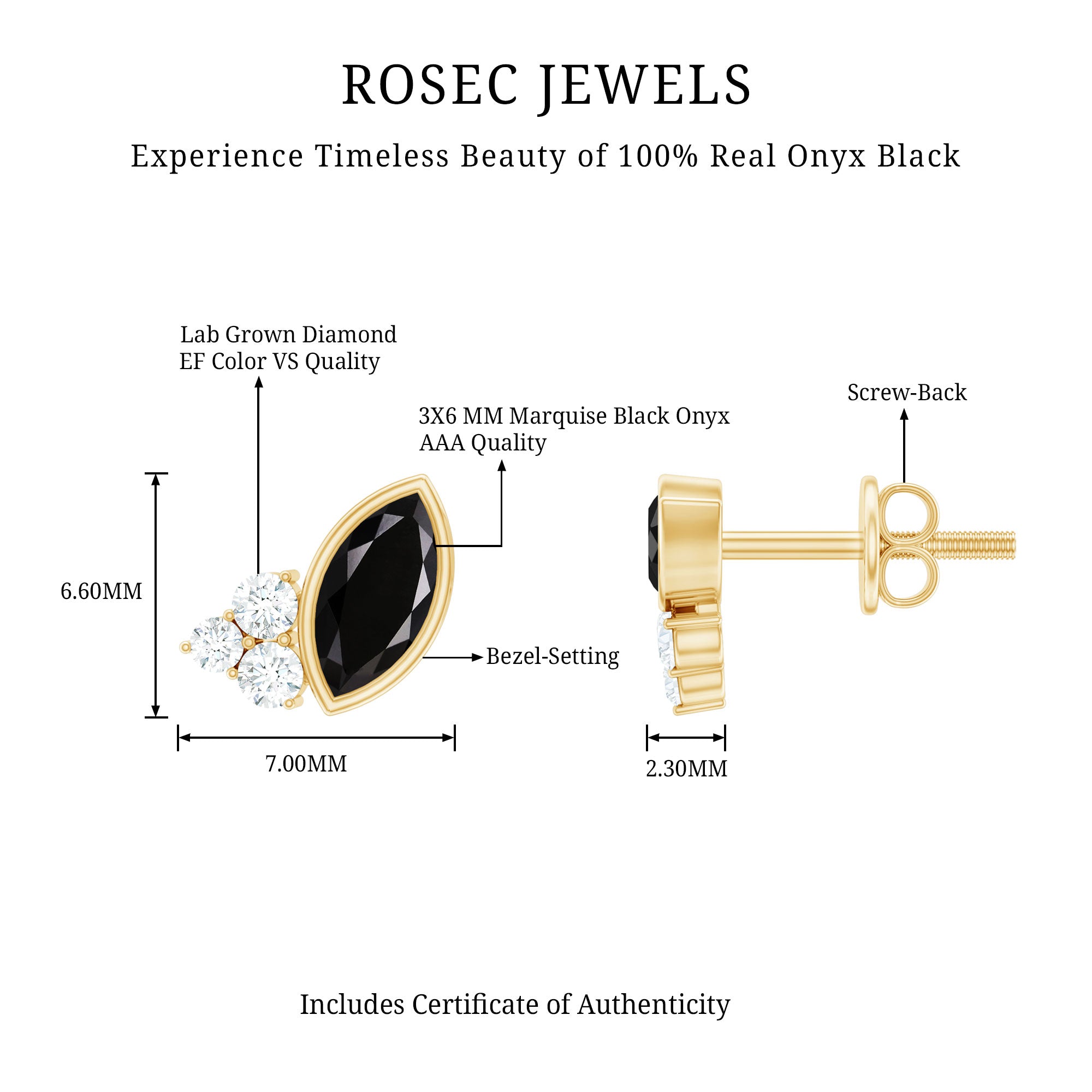 These Black Onyx Earrings are a modern take on everyday elegance. Crafted in 14k yellow gold plated silver, each earring showcases a sleek 3X6 MM marquise cut Black Onyx, securely nestled in bezel setting. The deep black hue of the onyx creates a striking contrast that draws the eye without overpowering your look. On one side of each earring, a trio of round lab grown diamonds brings a soft shimmer to balance the boldness of the onyx. This asymmetric design detail adds dimension and visual interest, elevating the overall look with a sophisticated touch. The Silver Onyx Earrings are finished with screw back closures for secure, all-day comfort, making them ideal for everything from morning meetings to evening outings. Whether you are dressing up a casual outfit or adding polish to something more formal, these Onyx and Diamond Earrings deliver just the right mix of edge and elegance. Made with AAA quality Black Onyx and EF-VS quality lab grown diamonds, these Black Stone Earrings reflect thoughtful craftsmanship and timeless design.