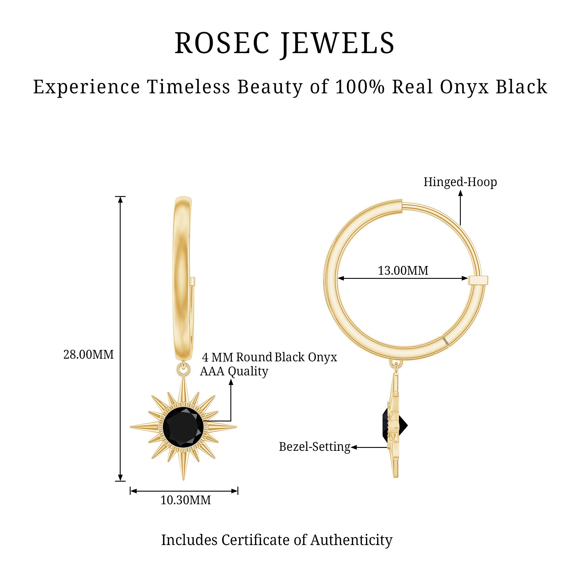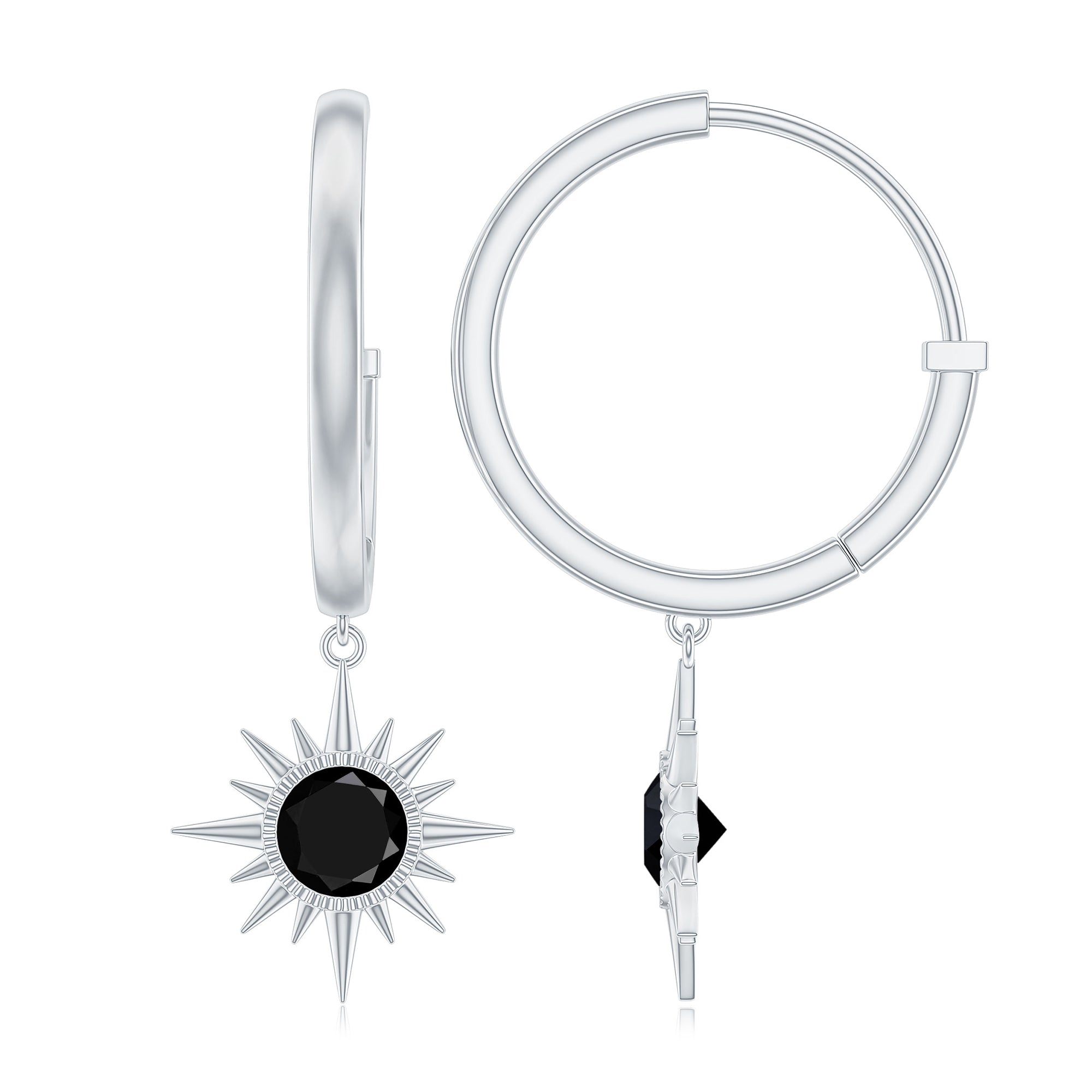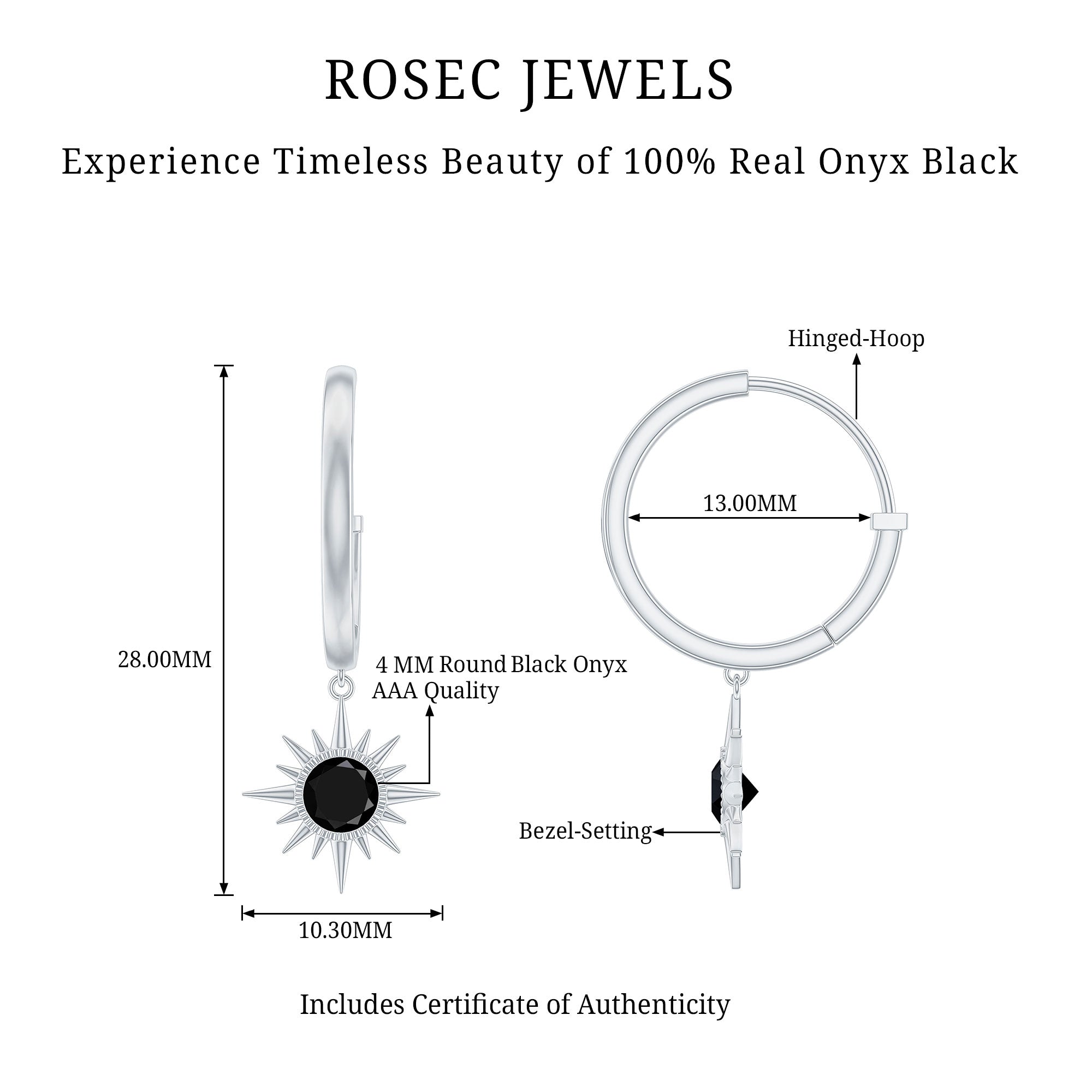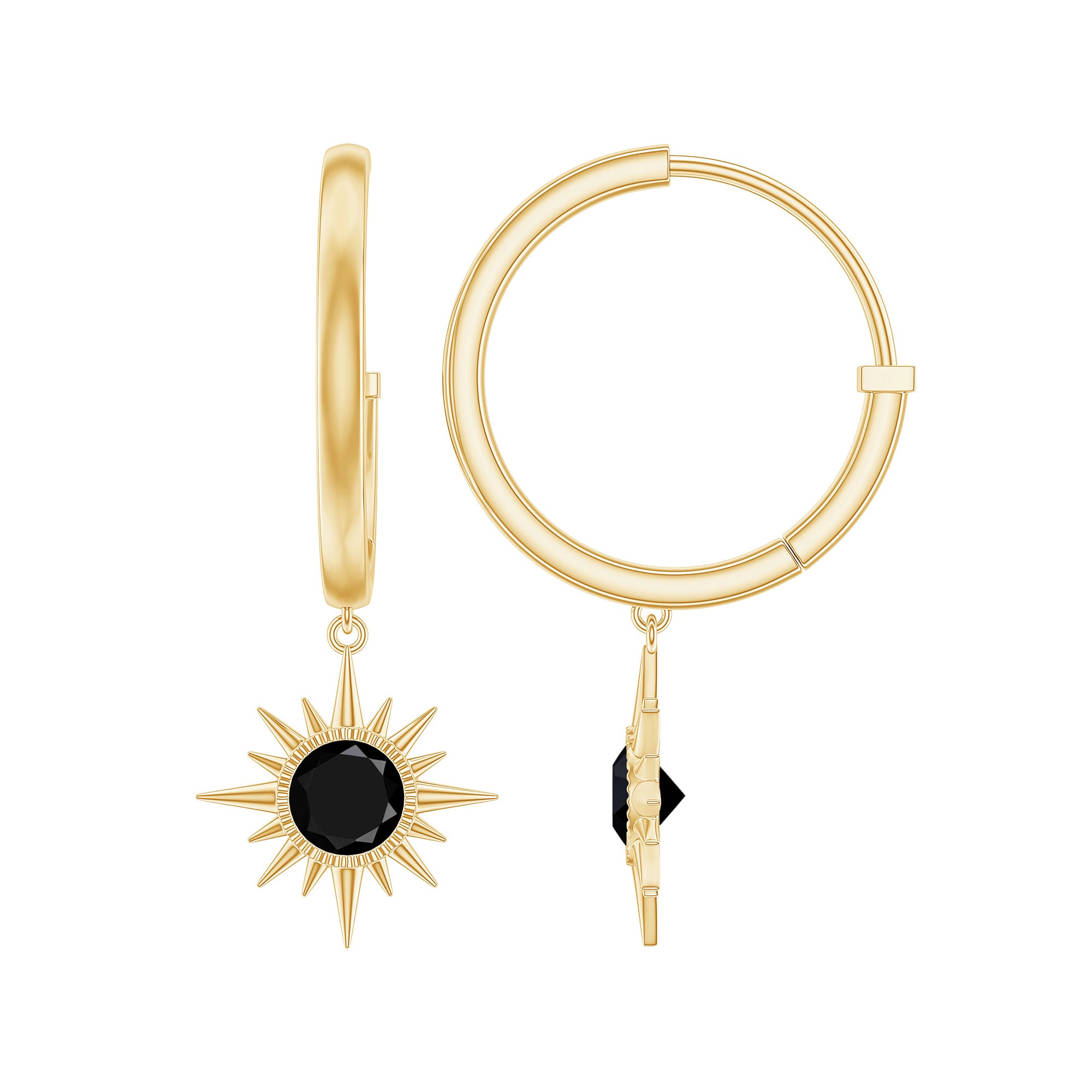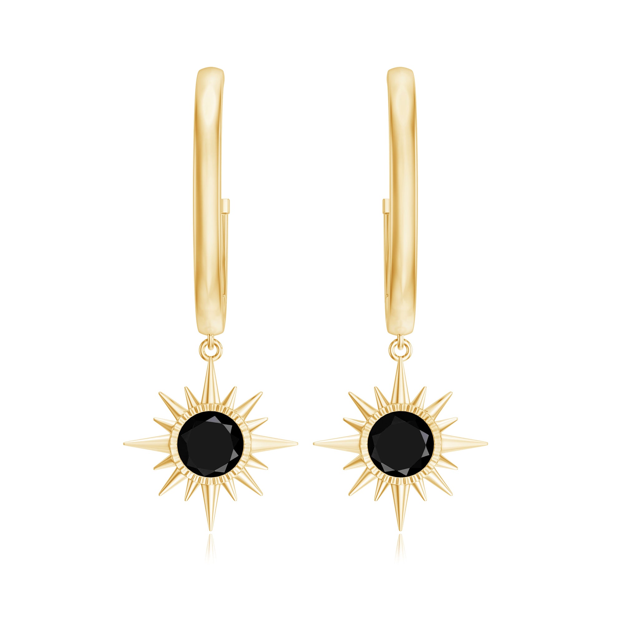 Shine with effortless elegance and bold charm in these Sunburst Earrings. Designed to captivate, each earring features a 4 mm Round Shape Black onyx set in Bezel Setting, surrounded by a sunburst pattern, catching the light with every movement. The graceful drop design adds a touch of drama while remaining versatile enough for both everyday wear and special occasions. The Hinged Hoop offer comfort and peace of mind, so you can wear these Hoop Drop Earrings confidently all day or night. The striking deep AAA Quality Black Onyx creates a modern yet timeless look, perfect for adding sophistication to any outfit. Packaged thoughtfully in a signature jewelry box, these Black Onyx Earrings are ready to gift and destined to delight anyone who receives them. These December Birthstone Earrings a statement of personality, style and refinement, blending classic elegance with contemporary flair. Whether paired with casual ensembles or dressed-up for a glamorous evening, these Black Onyx Drop Earrings effortlessly elevate your look, catching eyes and hearts alike.