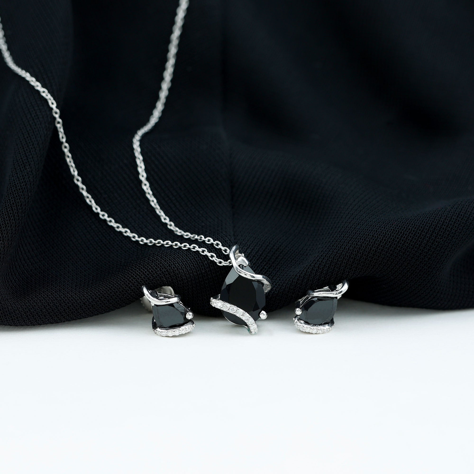 Black never goes out of style, and this stunning Solitaire Jewelry Set proves it right. Designed around the timeless beauty of monochrome, this Teardrop Necklace and Earrings Set brings together bold elegance and everyday charm in to most graceful way. Handcrafted in 14k white gold plated sterling silver, the set features pear shaped black spinel (7X10 MM stone in Pendant and 5X7 MM stone in Stud Earrings) held by secure prongs, making them a total showstopper. Each stone is gently hugged by a sleek metal wave, dotted with tiny round cut Moissanite stones that add just the right amount of sparkle without stealing the spotlight. The contrast of dark and light in this Black Spinel Jewelry Set creates a clean, classy look that goes with literally everything. The pendant hangs from a delicate cable chain that is both strong and stylish, while the earrings come with secure screw back closures, so you can wear them comfortably all day long. This Black and White Necklace Set is perfect for women who love simple yet striking jewelry.