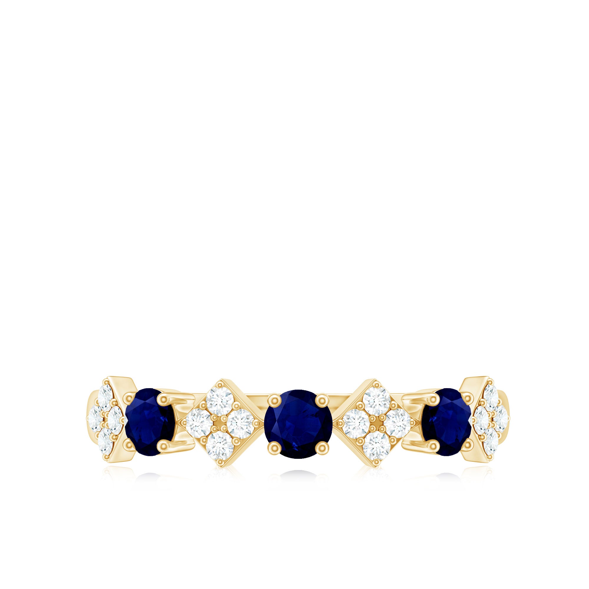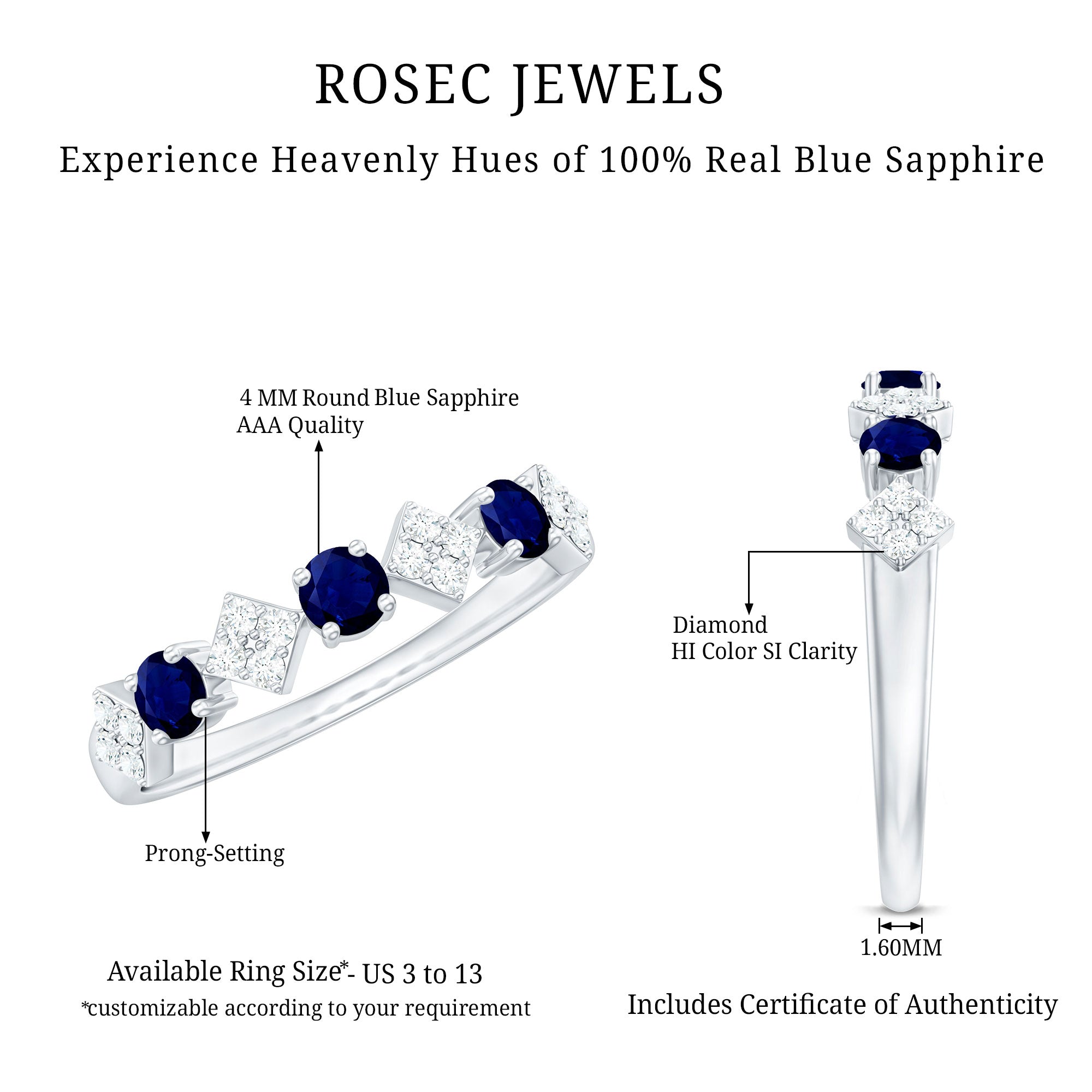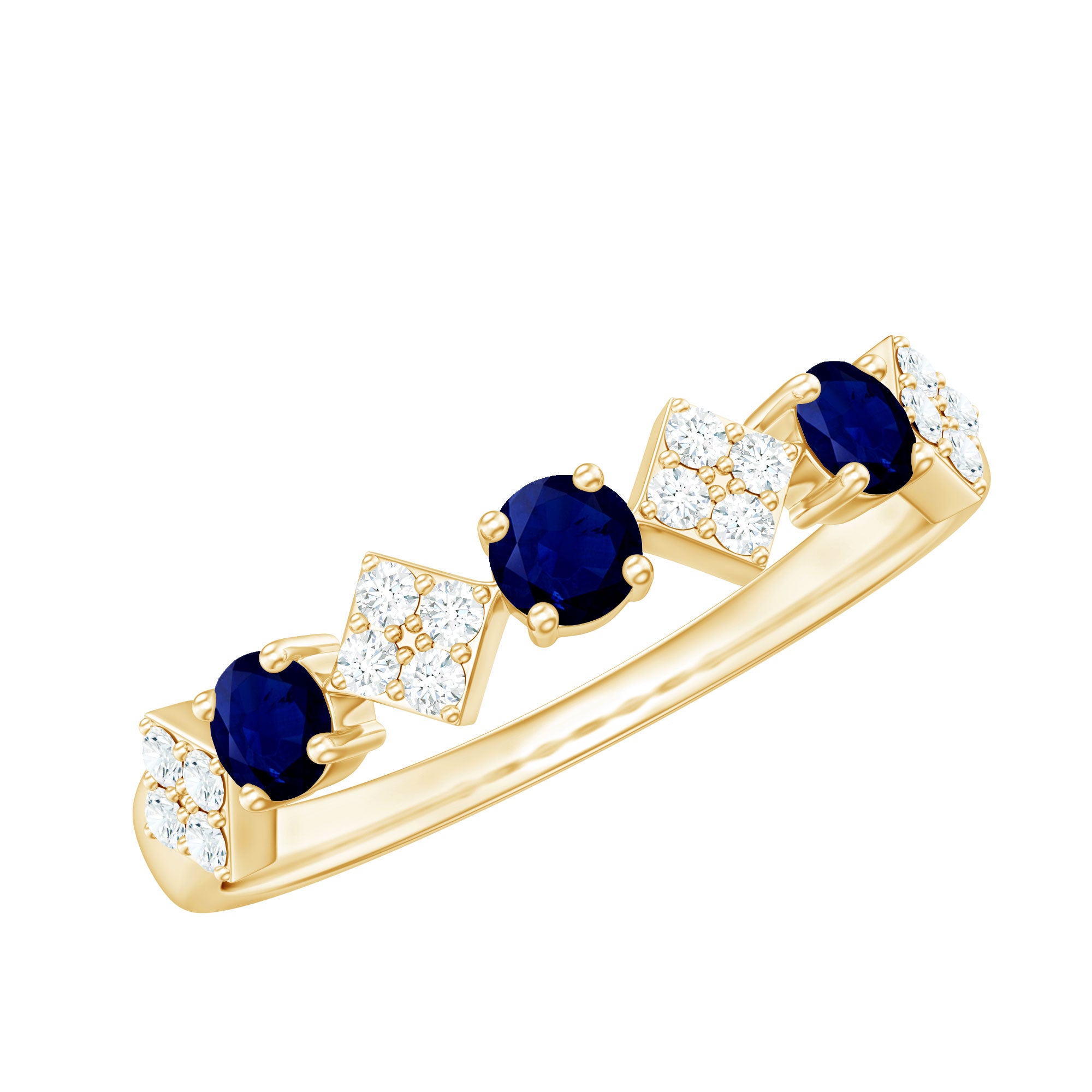 Express boundless affection with this exquisite Semi Eternity Ring. Adorned with Round Blue Sapphire in Prong Setting, followed by square shapes set diagonally and wrapped with Pave Set Diamond Stones, this elegant ring captivates. The alternating arrangement of Blue Sapphire and Diamond on this delicate Half Eternity ring creates a graceful statement of enduring love.
