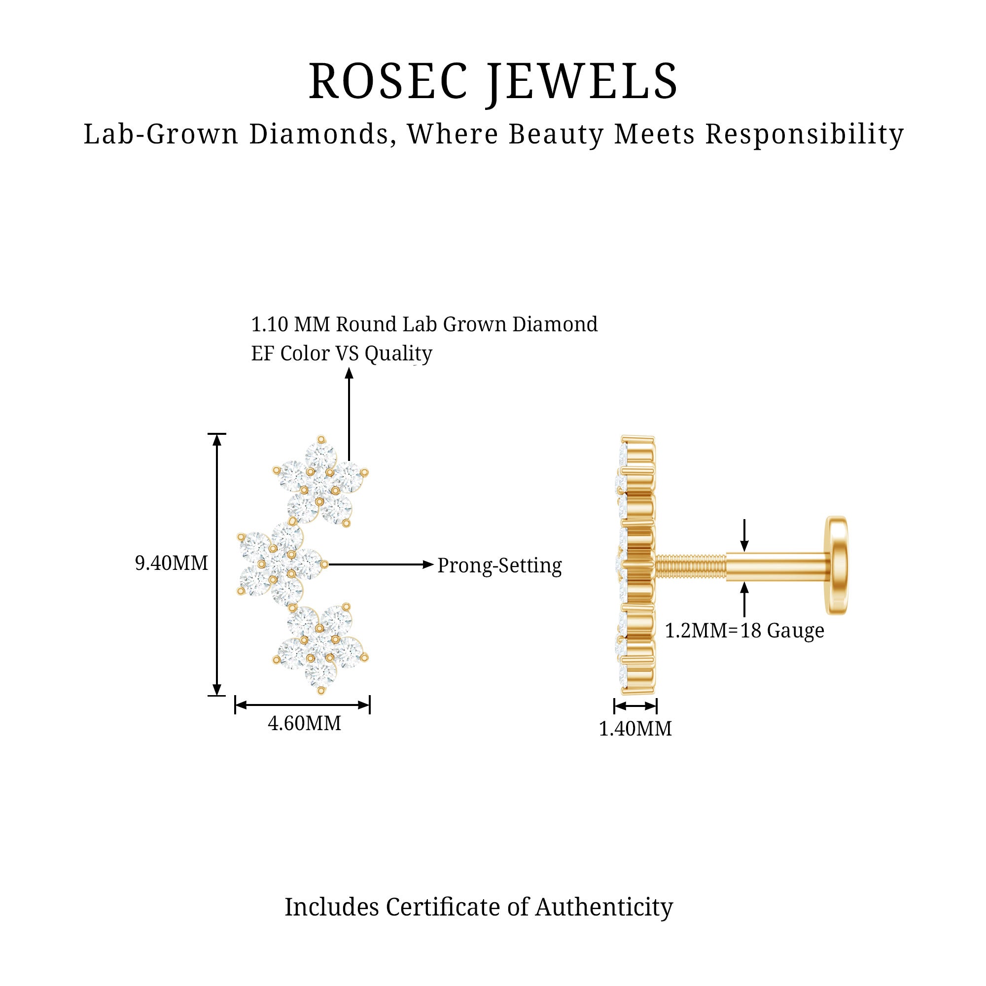 Diamond piercing jewelry is forever. Thats why we focus on the details and offer exceptional craftsmanship with our diamond crawler earring. This piercing earring features certified round diamonds set in a prong setting assembled in a three floral motifs, crafted with Hallmarked Metal. You can simply style this floral crawler earring on your Helix, Cartilage, Conch, or Upper Lobe Piercing. The Flat Back Closure will keep it secured in place. Our diamond ear piercing features sleek, modern styles with keen attention to balance and proportion because they need to last as well as look great. There are endless ways to style this Diamond Flower Earring, pair it with a stud, hoop, or any bold statement piece of jewelry. You can present this as a birthday gift, an anniversary gift, or a romantic surprise; it beautifully marks lifes most cherished moments. It offers a wide range of metal color options and is also available in various metal choices. This Piercing Stud comes with a certificate of authenticity for gemstones and is packaged in a premium storage box.