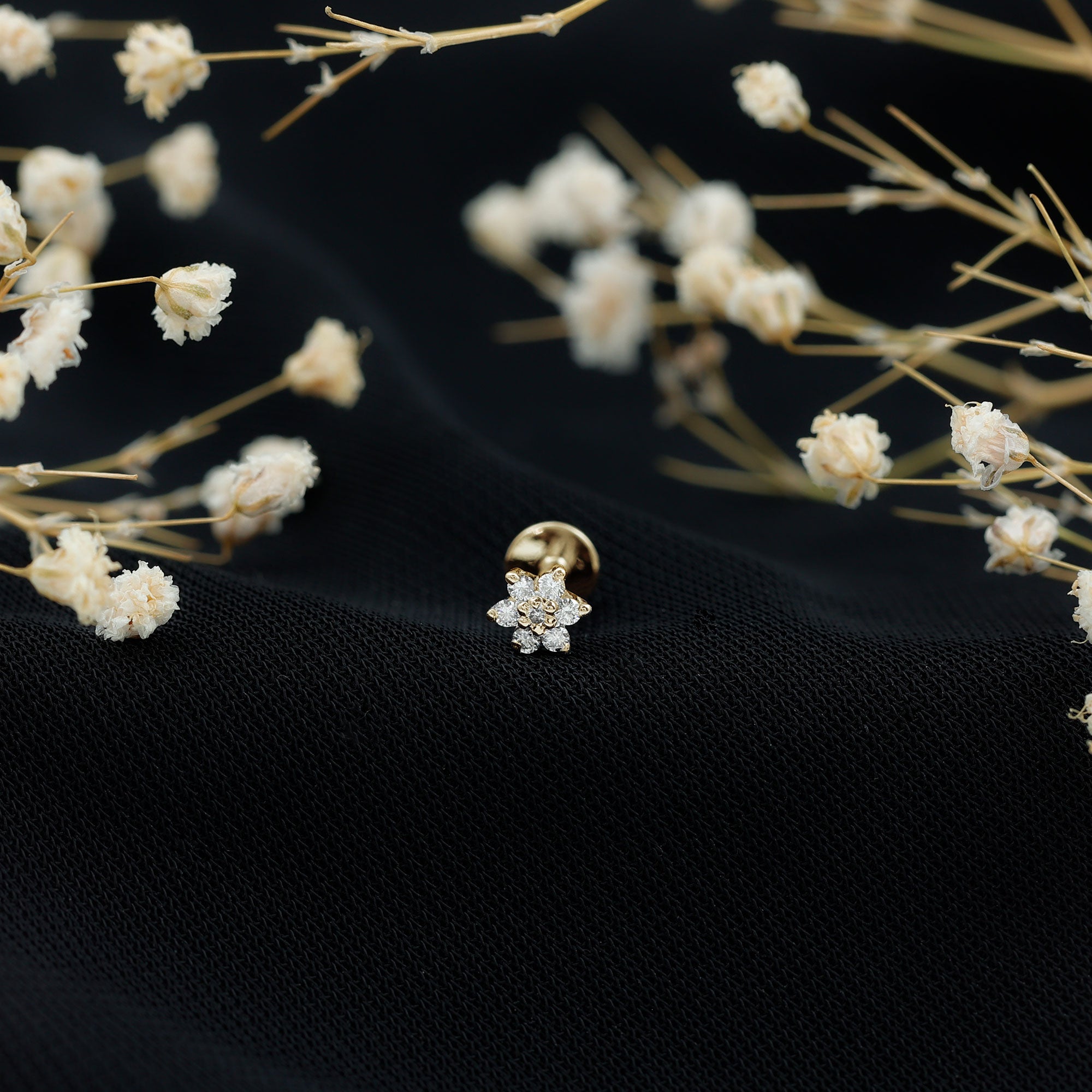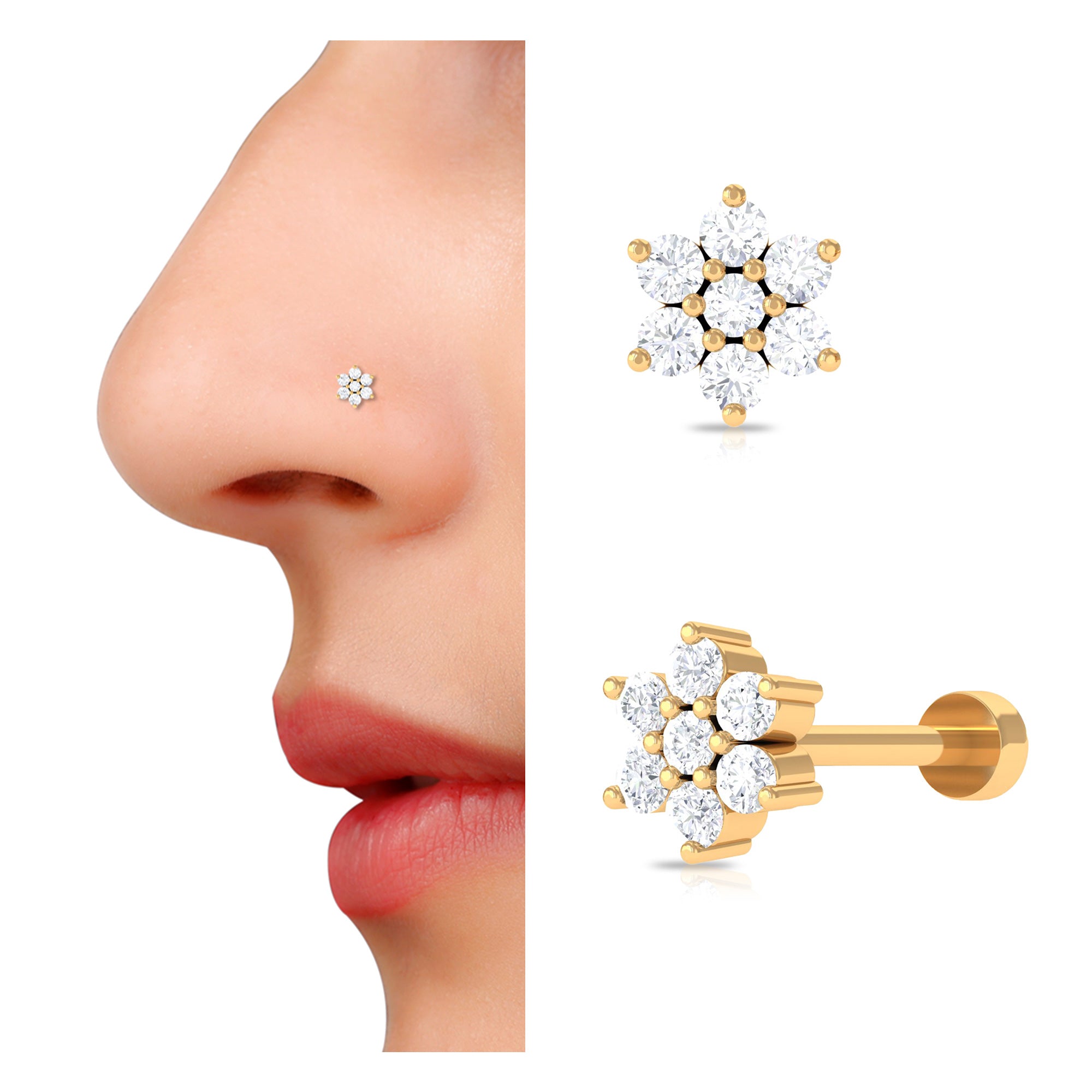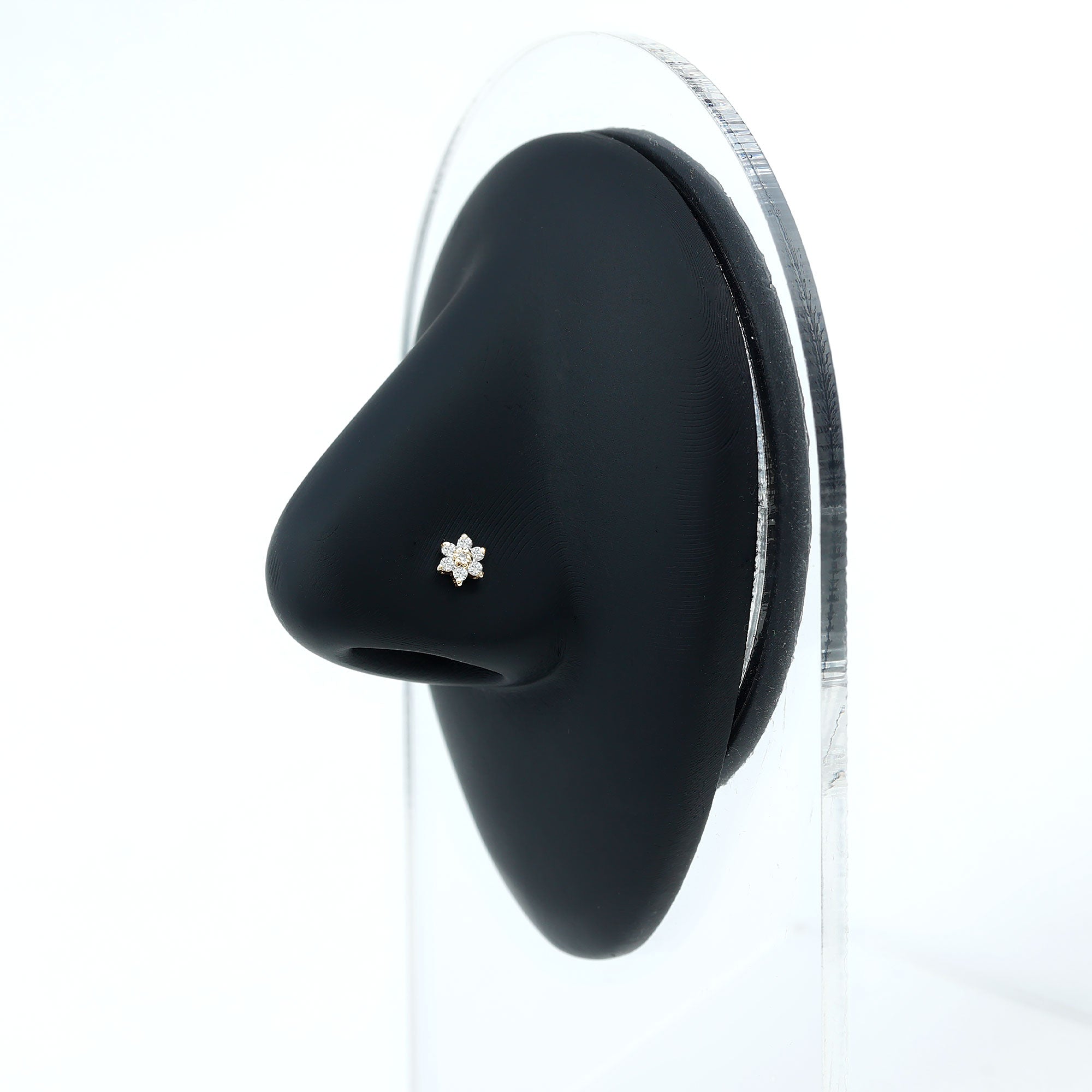 Introducing a stunning Floral Nose Pin adorned with small Round Shape Diamonds arranged in a delicate floral pattern. The simple yet secure Flat Back Closure ensures it stays in place all day long. Its timeless design is perfect to accentuate both casual and special occasions, making it a must-have addition to your jewelry collection. Surprise your loved one by gifting her this elegant Gold Nose Pin.