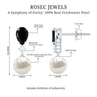 Bold elegance meets timeless grace - these Freshwater Pearl Drop Earrings are a stunning fusion of modern glamour and classic beauty. Each earring features a striking 6X8 MM pear shaped black onyx stone at the top, faceted to catch the light and exude sophistication. Just below a single round cut dainty diamond adds the perfect touch of sparkle, suspended delicately at the end is a 7 MM round shaped freshwater pearl which adds movement and elegance to the overall design. This thoughtful arrangement of elements in these Pearl Wedding Earrings creates a stunning contrast of color that is both eye-catching and graceful. These Dangle Drop Earrings are an ideal choice for gifting on birthdays, anniversaries, or milestone moments. Whether you are dressing up for a cocktail party or adding elegance to your ethnic wear, these Onyx and Pearl Earrings effortlessly elevate any look. A versatile piece for the woman who loves statement jewelry with a touch of sophistication.