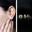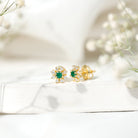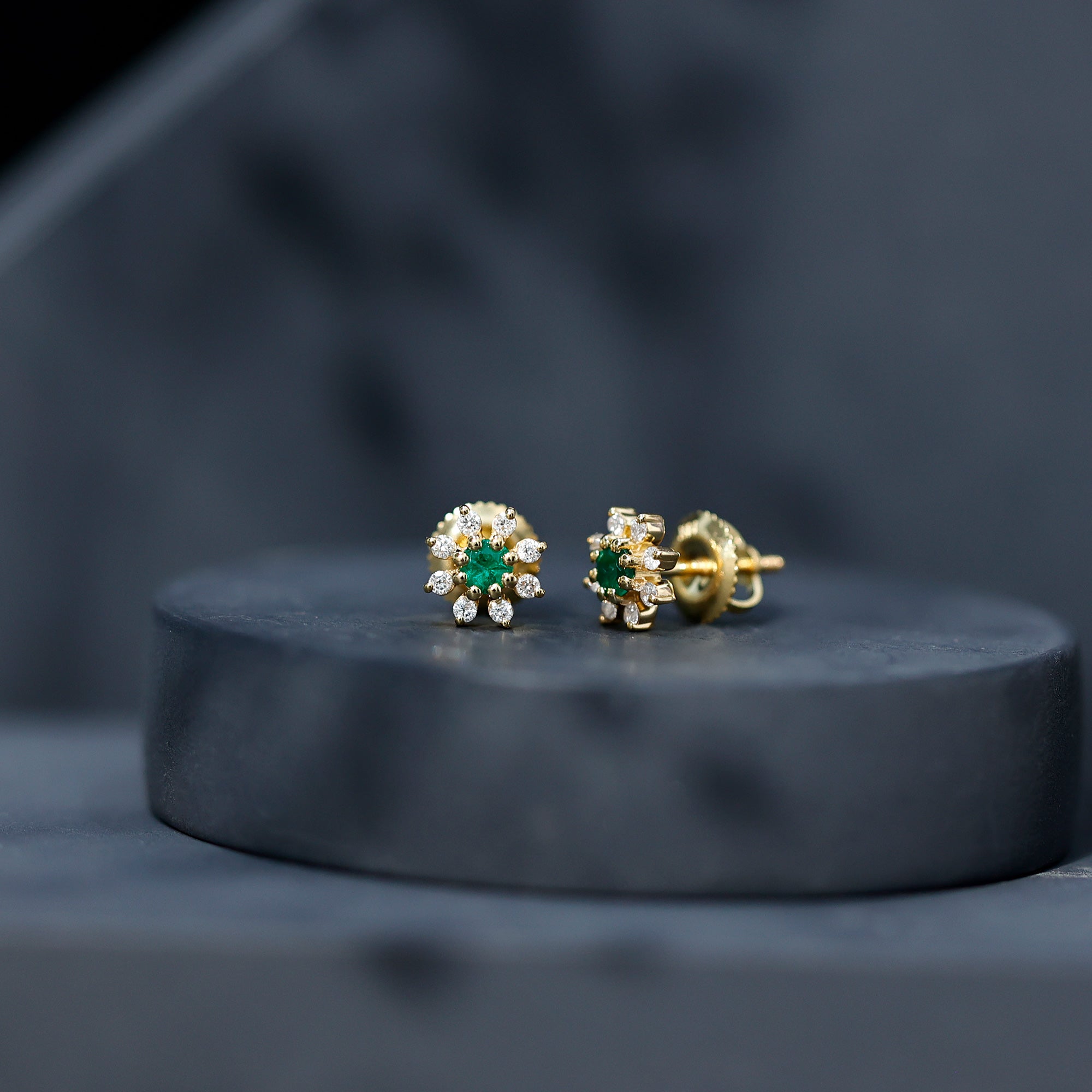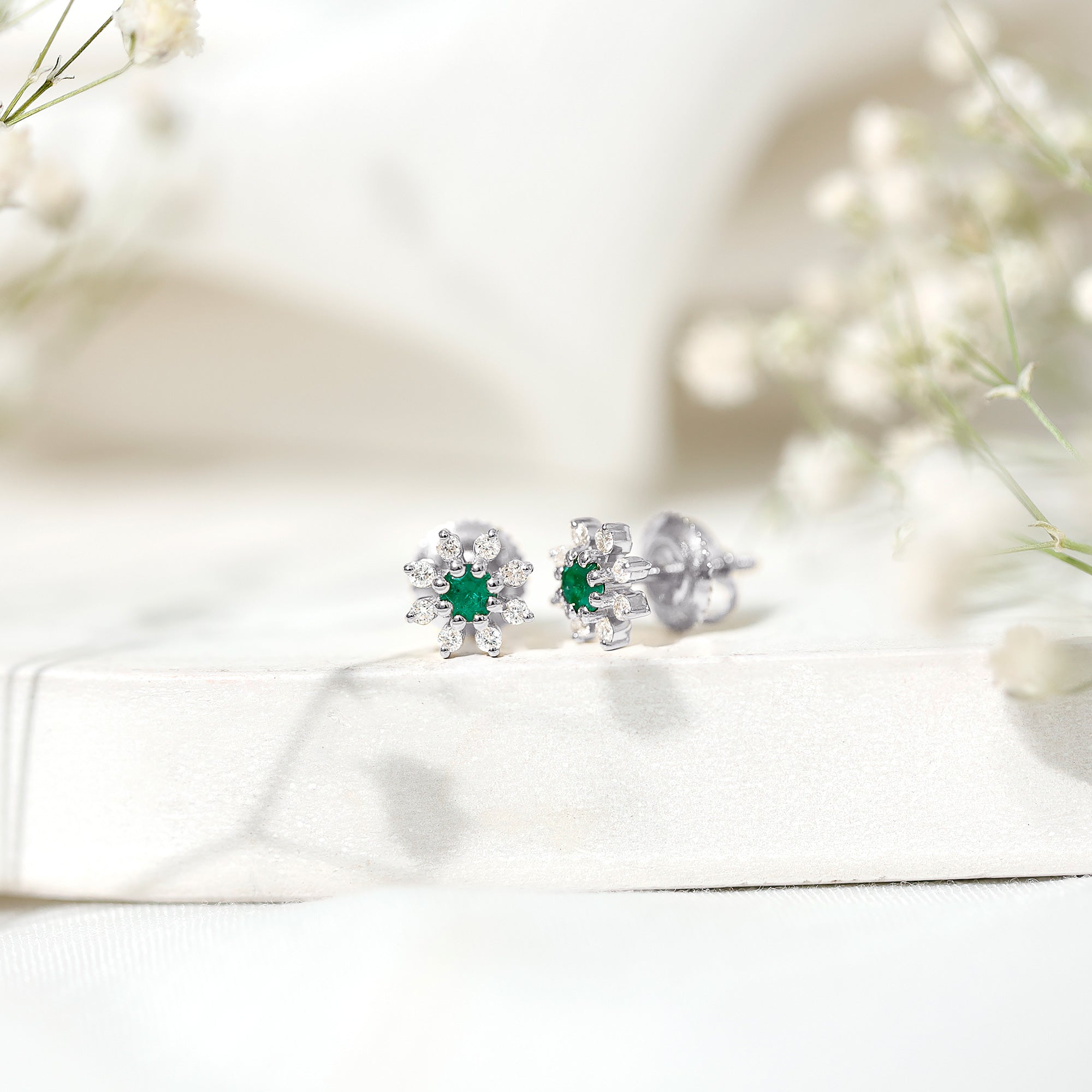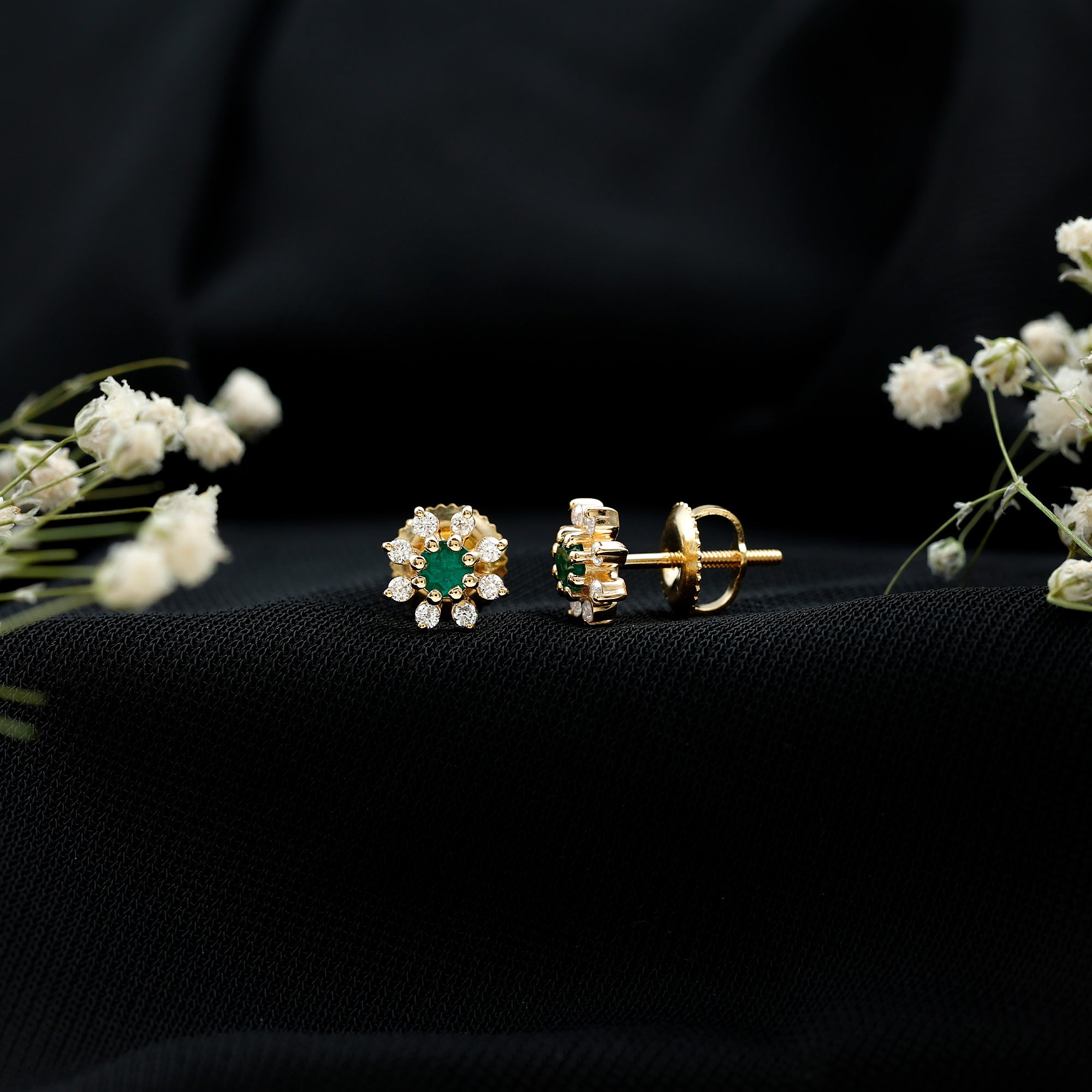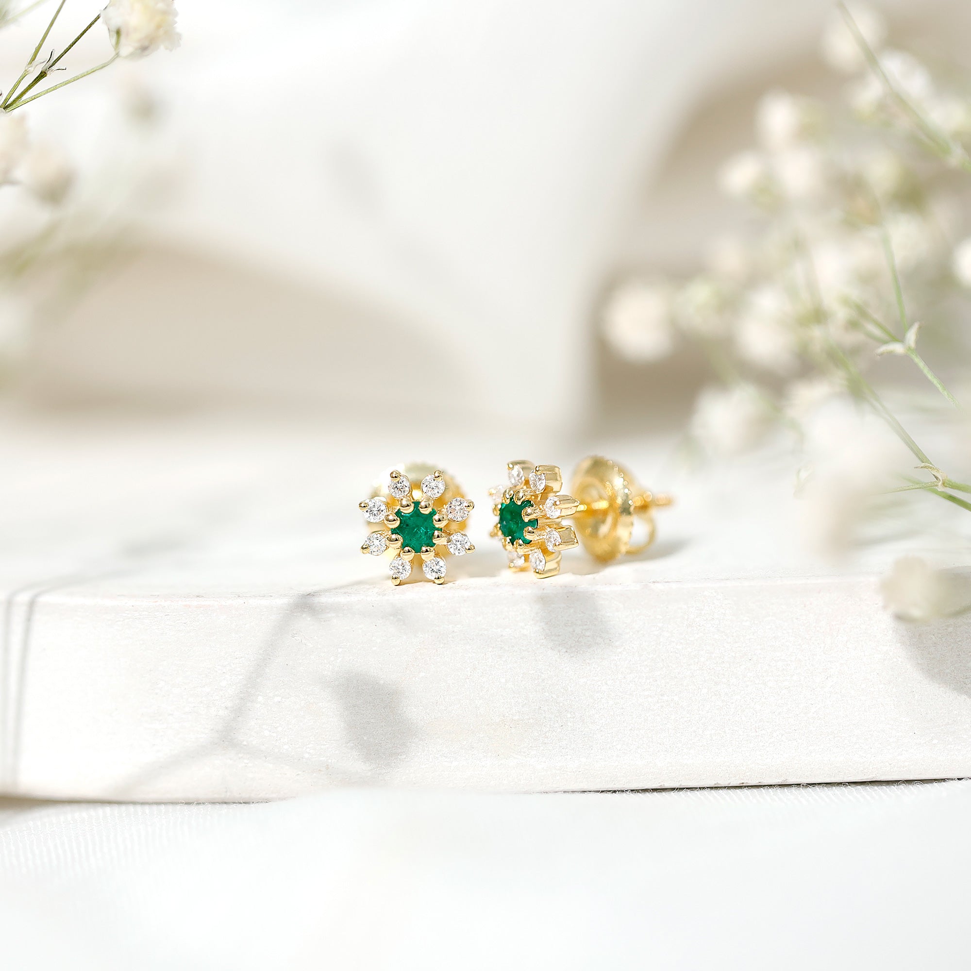 Surprise her with these Emerald Flower Earrings that mirror the gentleness of nature and the strength of your connection. Embellished with a round shape emerald, set in secure prong setting. Surrounding the emerald is a round diamond halo, forming a graceful flower pattern that looks delicate yet striking. The combination of AAA quality real emeralds and HI-SI quality real diamonds gives the Flower Stud Earrings a luxurious presence. Every stone is carefully set to highlight the natural beauty of the gemstones while ensuring lasting durability. Crafted for comfort as well as style, the Emerald and Diamond Earrings feature secure screw back closures that keep them firmly in place throughout the day. Their compact size makes them perfect for everyday wear, yet they still feel special enough for important occasions. From office meetings to weddings and festive celebrations, they blend effortlessly with different outfits. These May Birthstone Earrings are a thoughtful gift choice for birthdays, anniversaries, weddings, or romantic milestones. Graceful in shape and rich in color, these emerald studs offer a classic look with a charming floral twist. They are the kind of earrings that remain stylish year after year, becoming a treasured part of any jewelry collection.