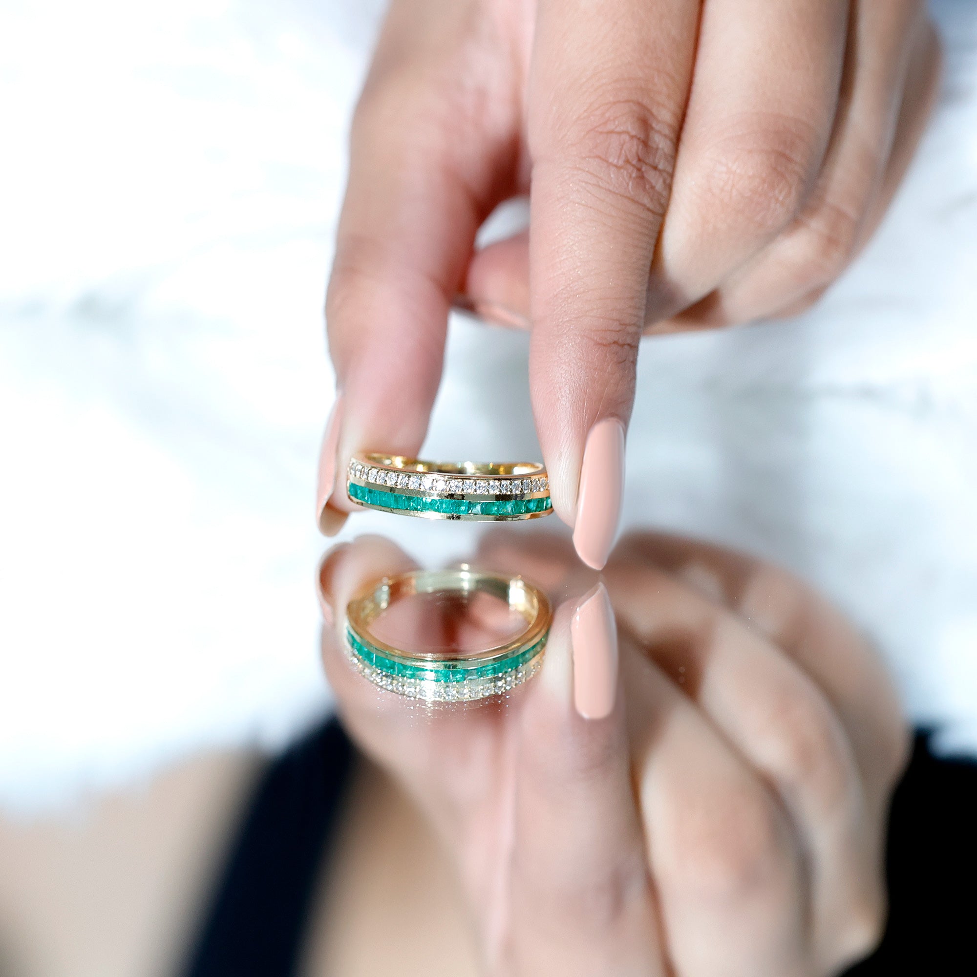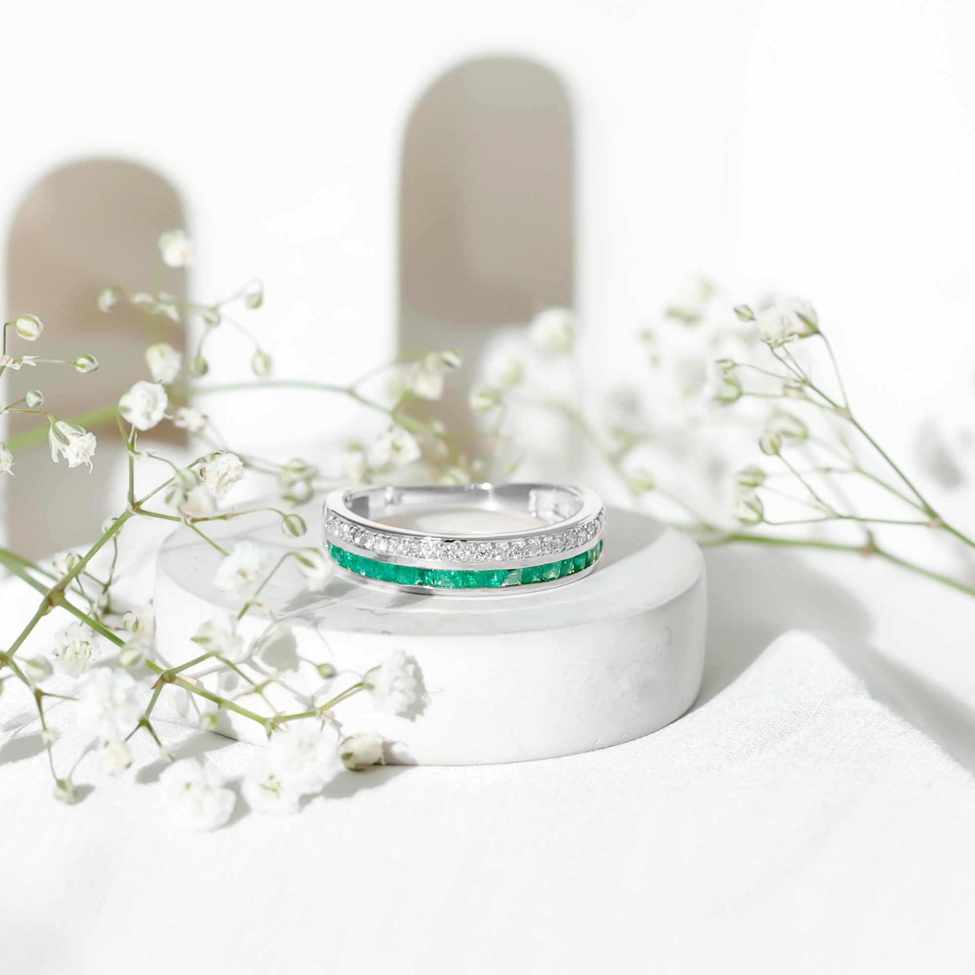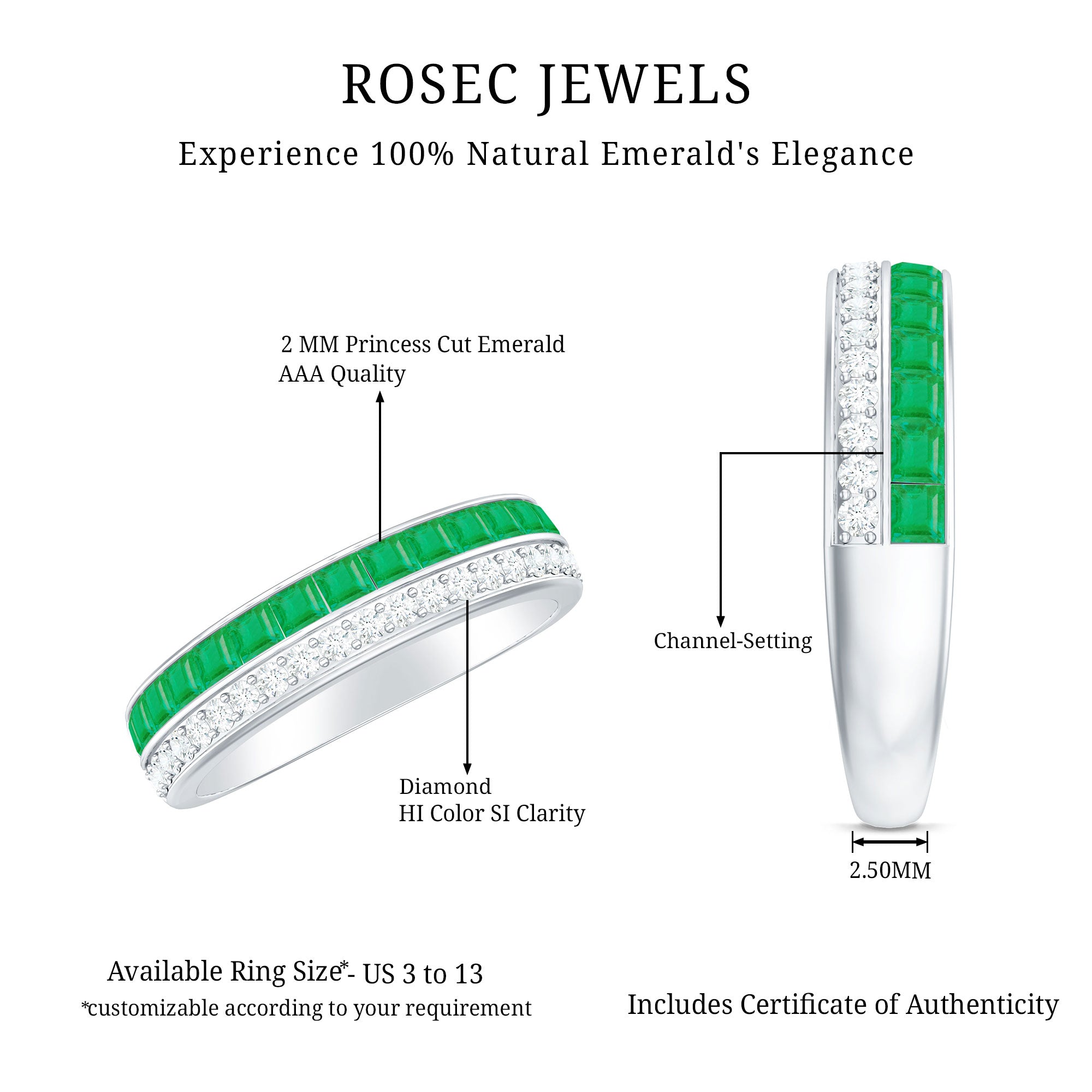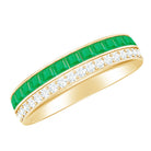 Every love story deserves a symbol as timeless as the bond it represents. This Emerald and Diamond Wedding Band captures that feeling perfectly. The rich green hue of the emerald gemstone is known for its royal charm and sense of renewal, making this Half Eternity Band a thoughtful choice for a wedding, anniversary, or birthday gift for someone special. Designed in a half eternity style, the band features two exquisite rows that complement each other beautifully. One row sparkles with princess cut emeralds set neatly in channel setting, while the other glimmers with round cut diamonds that bring a captivating brilliance to the design. Together, they create a stunning play of color and light, symbolizing harmony and unity. This elegant Emerald Eternity Band is a reflection of lasting devotion and endless love. The balance between the vibrant AAA quality emeralds and dazzling HI-SI quality diamonds tells a story of two souls growing together, strong and radiant. It celebrates milestones and memories, marking moments that deserve to be cherished forever. Whether worn as a wedding band, an anniversary ring, or a special gift, it embodies romance that stands the test of time.