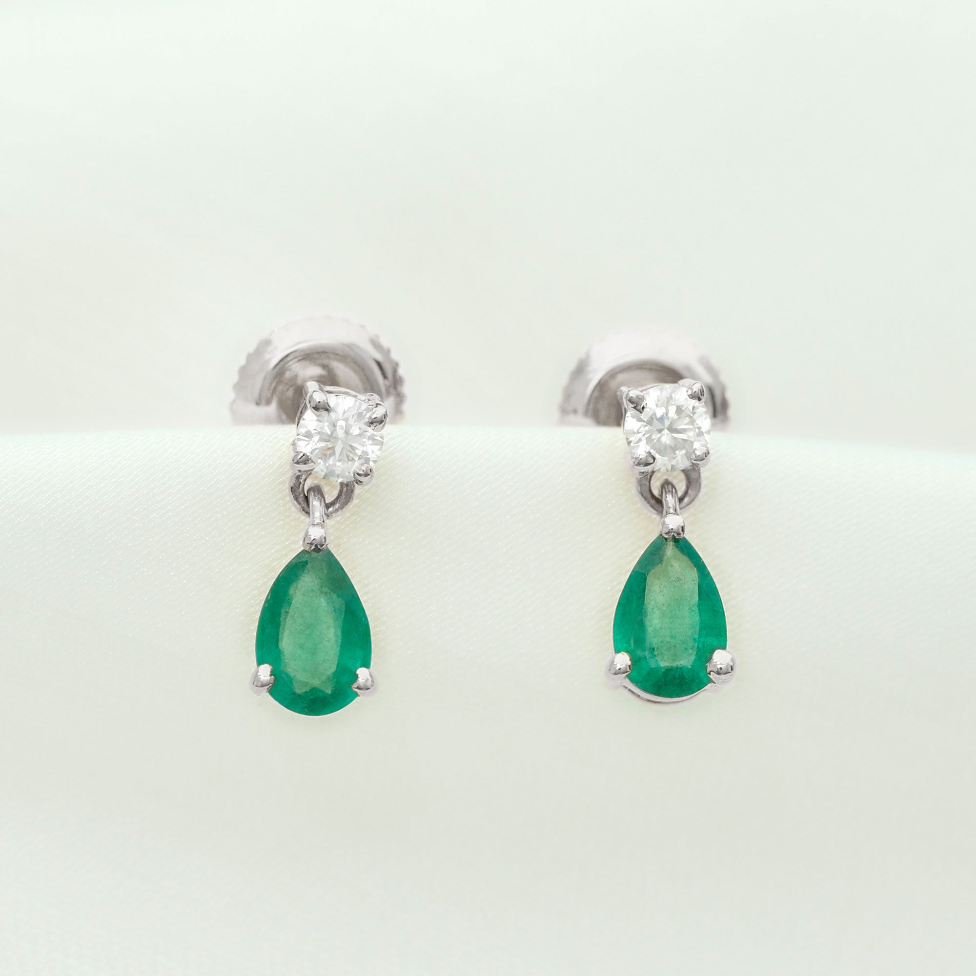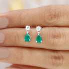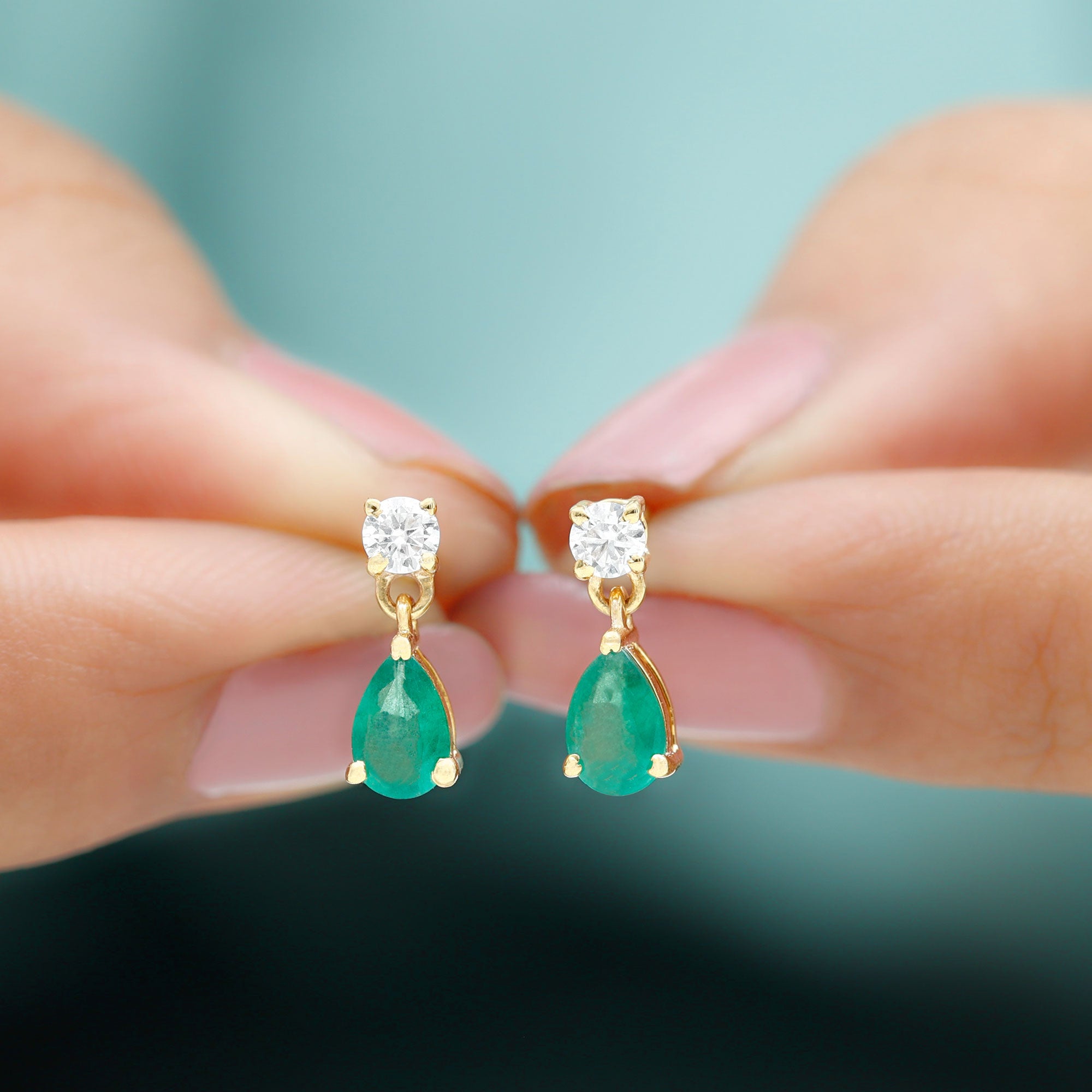 These Simple Teardrop Earrings are the perfect accessory to wear on any special occasion. The Two Stone Earrings feature a 4X6 MM Pear Shape Emerald as a drop with a sparkling 3 MM round cut Moissanite gemstone at the top, set in Prong Setting. The emerald is known for its symbolism of renewal and abundance, making it the perfect gemstone to wear during this season of gratitude. With their timeless design and meaningful gemstones, these Emerald and Moissanite Earrings are sure to become a cherished addition to your jewelry collection. These Emerald Drop Earrings offer a beautiful way to match her taste. The secure screw back closure ensures comfort and safety, making them perfect for everyday wear without any worry. Simple, stylish, and full of charm, these Pear Shaped Earrings make a wonderful gift for birthdays, anniversaries, or any moment when you want to show your love.