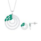 Add the perfect finishing touch to your cocktail party attire with our Emerald Pendant and Earrings Set. This elegant pendant set features a dazzling Marquise-Cut Emerald with Round Cut Moissanite Accents set in a stunning Cocktail Pendant and Earrings, expertly crafted from Solid Gold. The captivating green hue of the Emerald is complemented by the sparkling moissanite stones, creating a truly exquisite piece of jewelry.