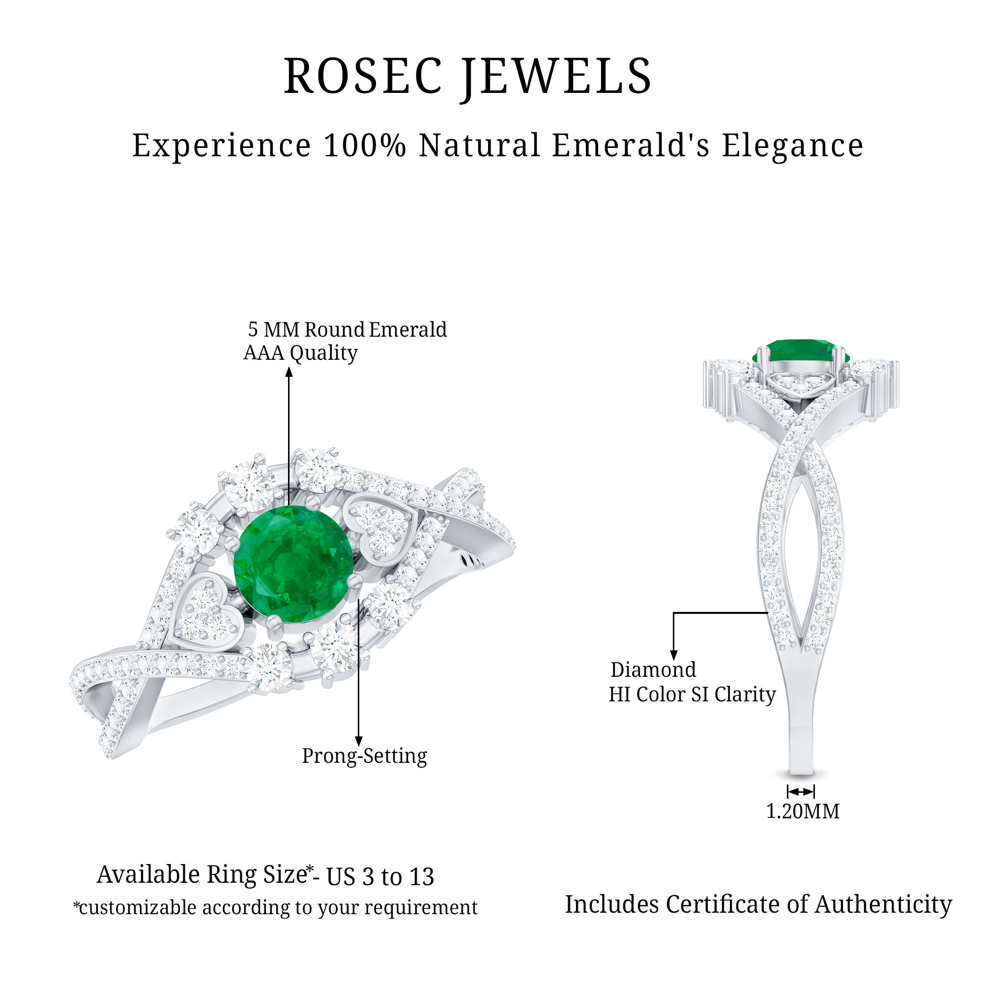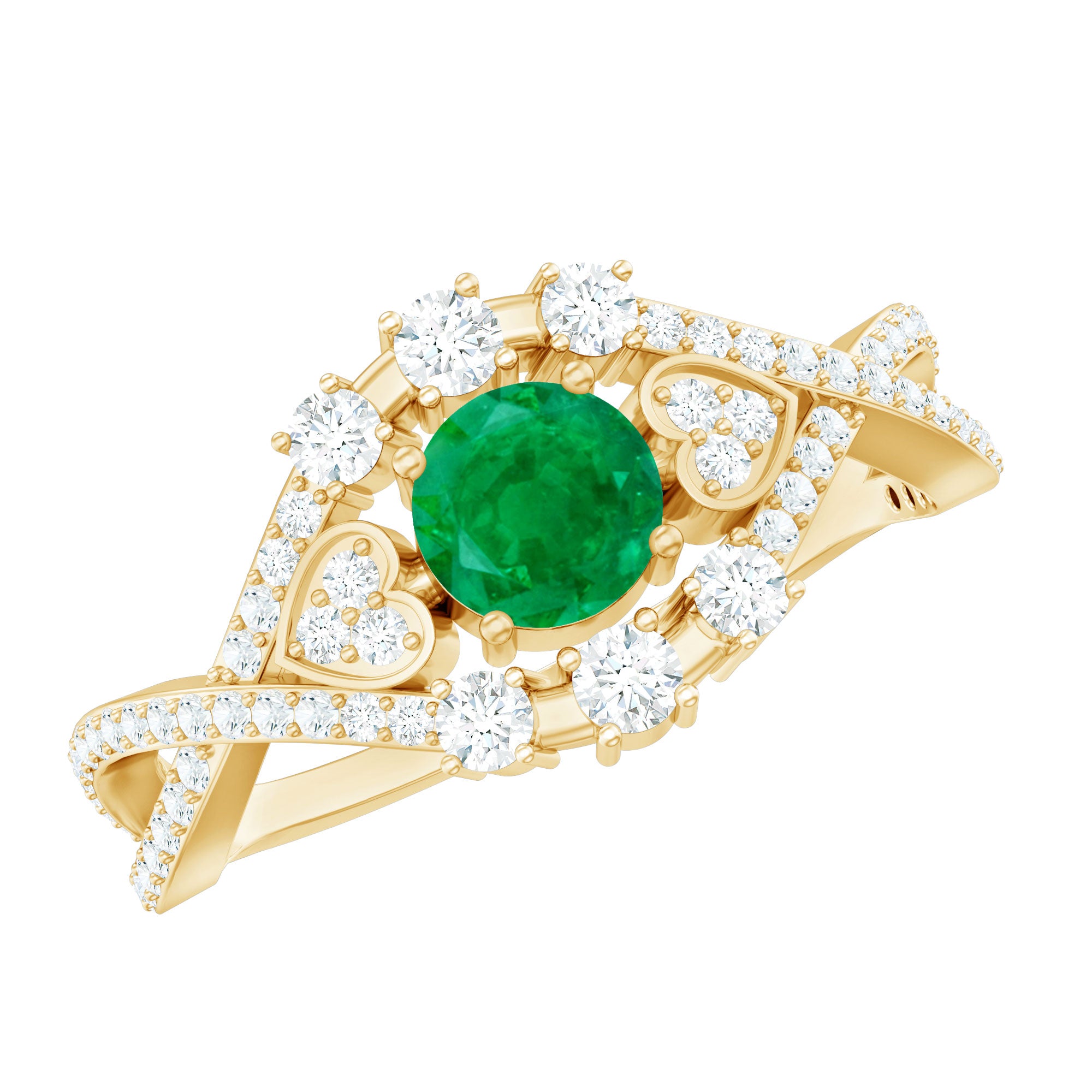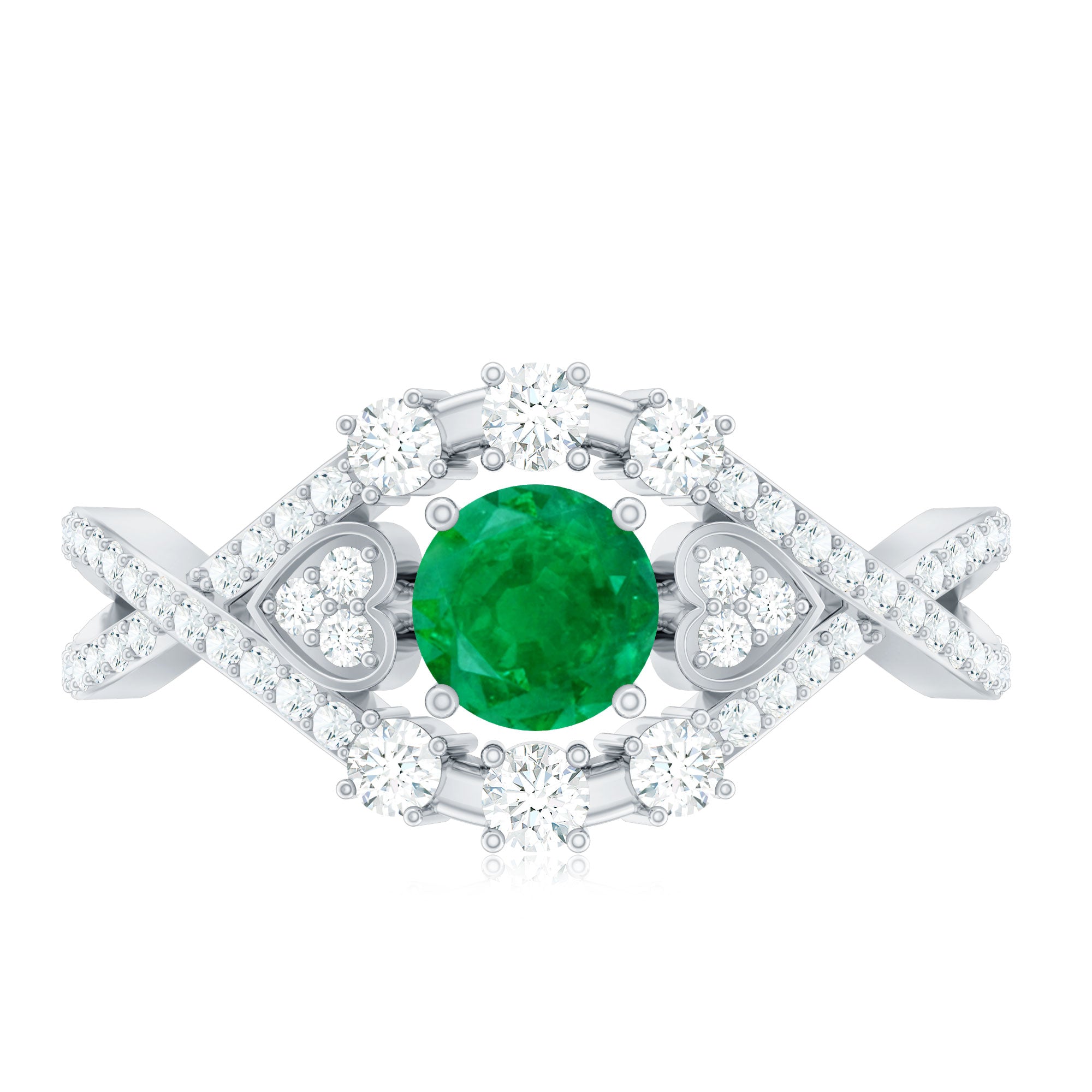 Timeless romance meets modern elegance in this Antique Style Engagement Ring. At its center, a 5 mm Round Shape Emerald captures the eye, its rich green hue radiating life and devotion. Flanking the center stone, a delicate horizontal Heart motif on either side, adorned with sparkling Diamond stones, adds a whisper of vintage charm. The Crossover Shank, studded with Diamond stones, wraps gracefully around the finger, symbolizing two lives intertwined in perfect harmony. Every curve tells a story of love, a design that honors tradition while embracing today’s style. Perfect for engagements or as a meaningful expression of eternal commitment, this Emerald Diamond Engagement Ring transforms every gesture into a celebration of the heart. Presented in a signature jewelry box and available in various sizes, this Crossover Ring is crafted to be treasured, worn and admired for a lifetime. This Vintage Looking Engagement Ring is a symbol of passion and the everlasting beauty of two hearts united.